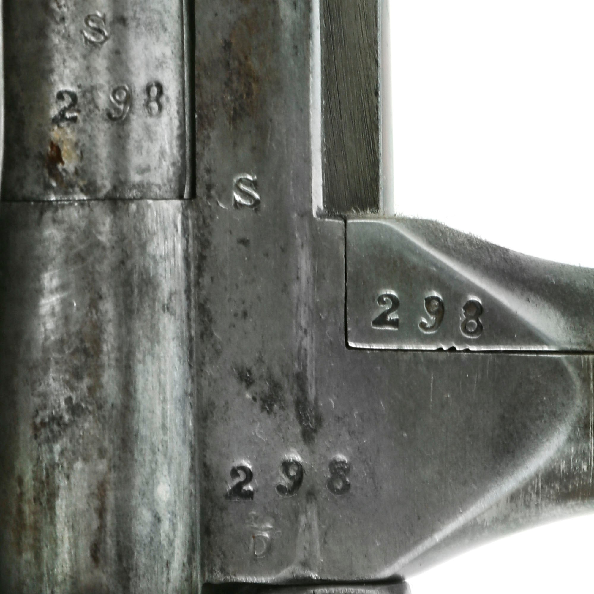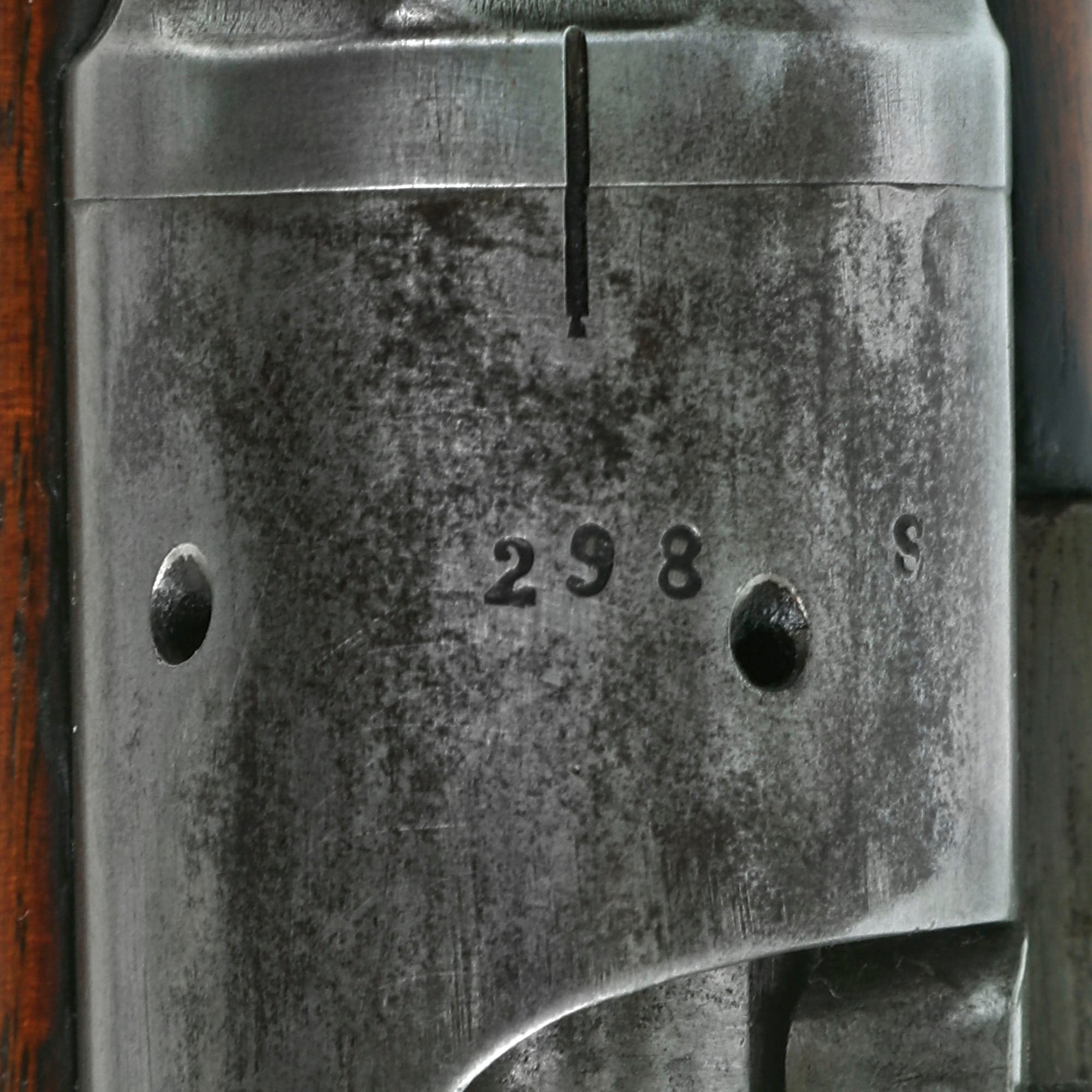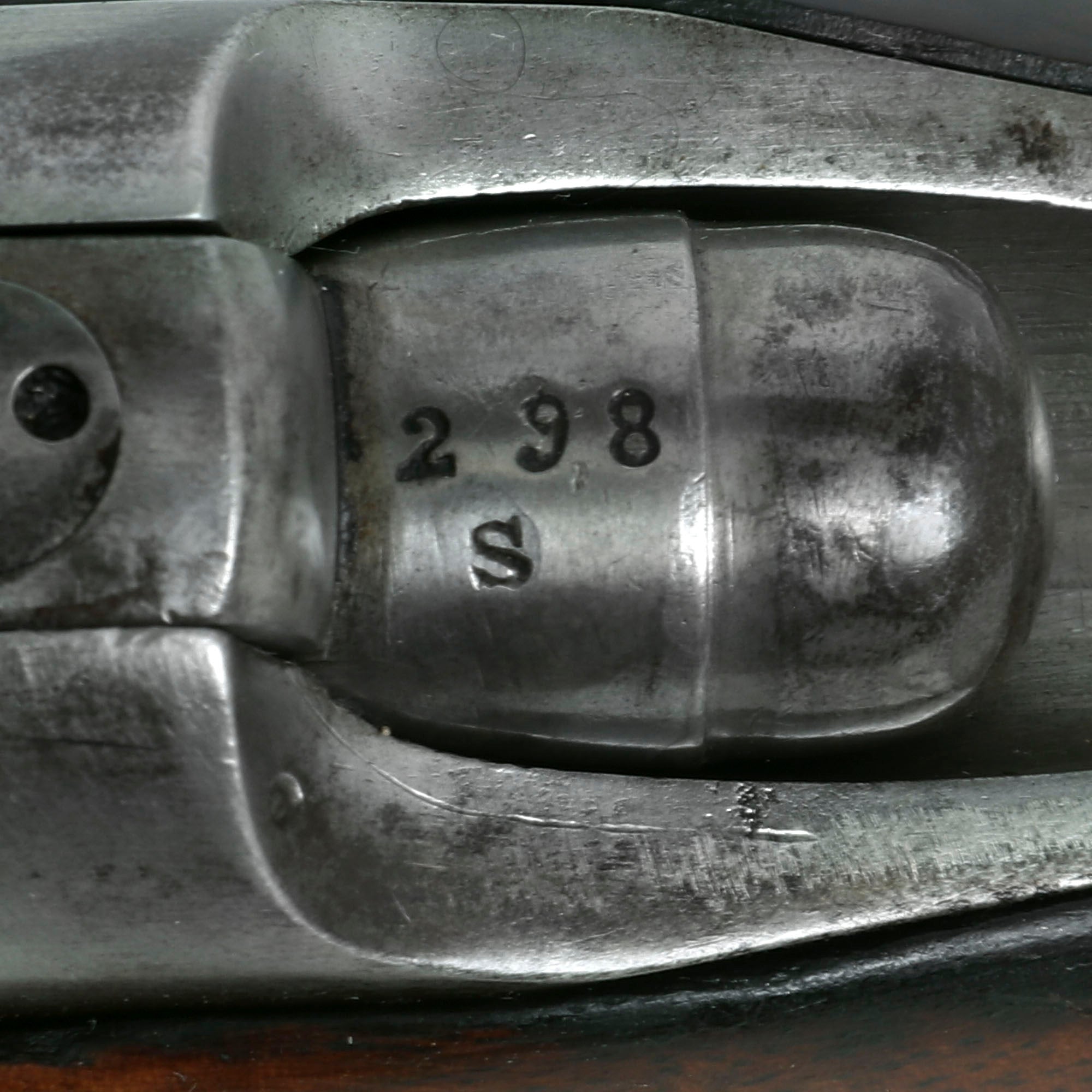This example has serial number 2484 on the barrel and butt plate, and numbers S 298 on all of the bolt components, above the chamber on the receiver, as well as on the magazine floor plate. This is normal for the converted rifles, as the action had to be rebuilt. The barrel is dated 1876, and the receiver is worn, so we are not able to see any maker markings on it. It is in nice condition overall with a nice refinished stock, still bearing a clear DELFT / 1877 cartouche with CROWN / W in the middle, for William III of the Netherlands. Additionally, the butt plate is marked 1889, indicating the year it was converted to the bolt-action magazine system.