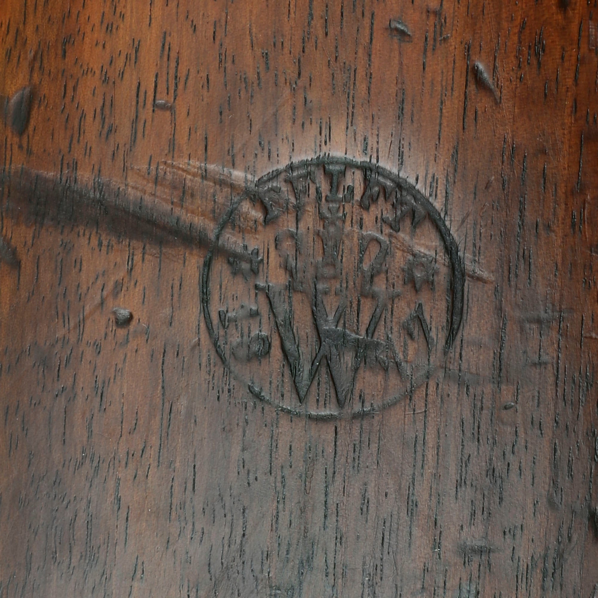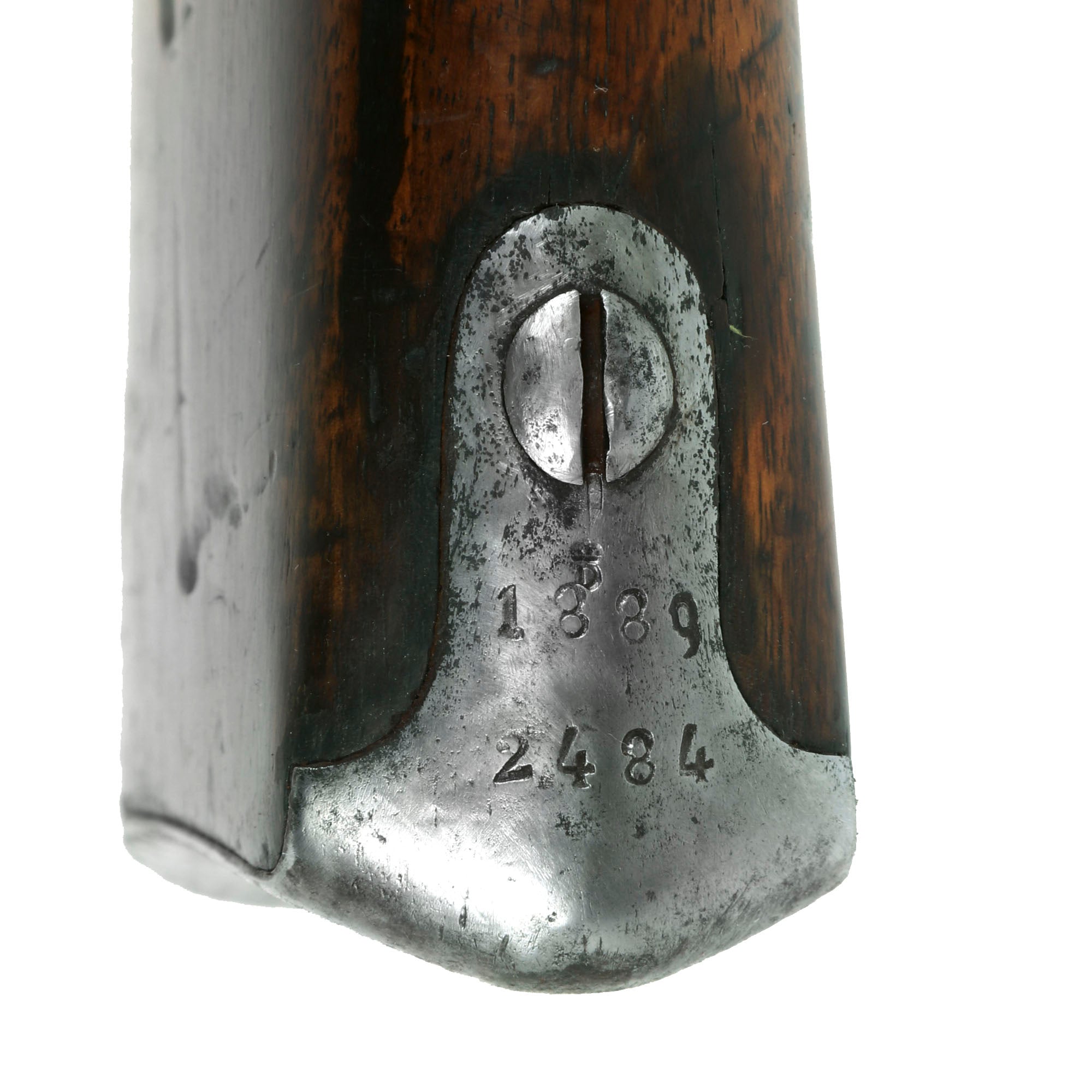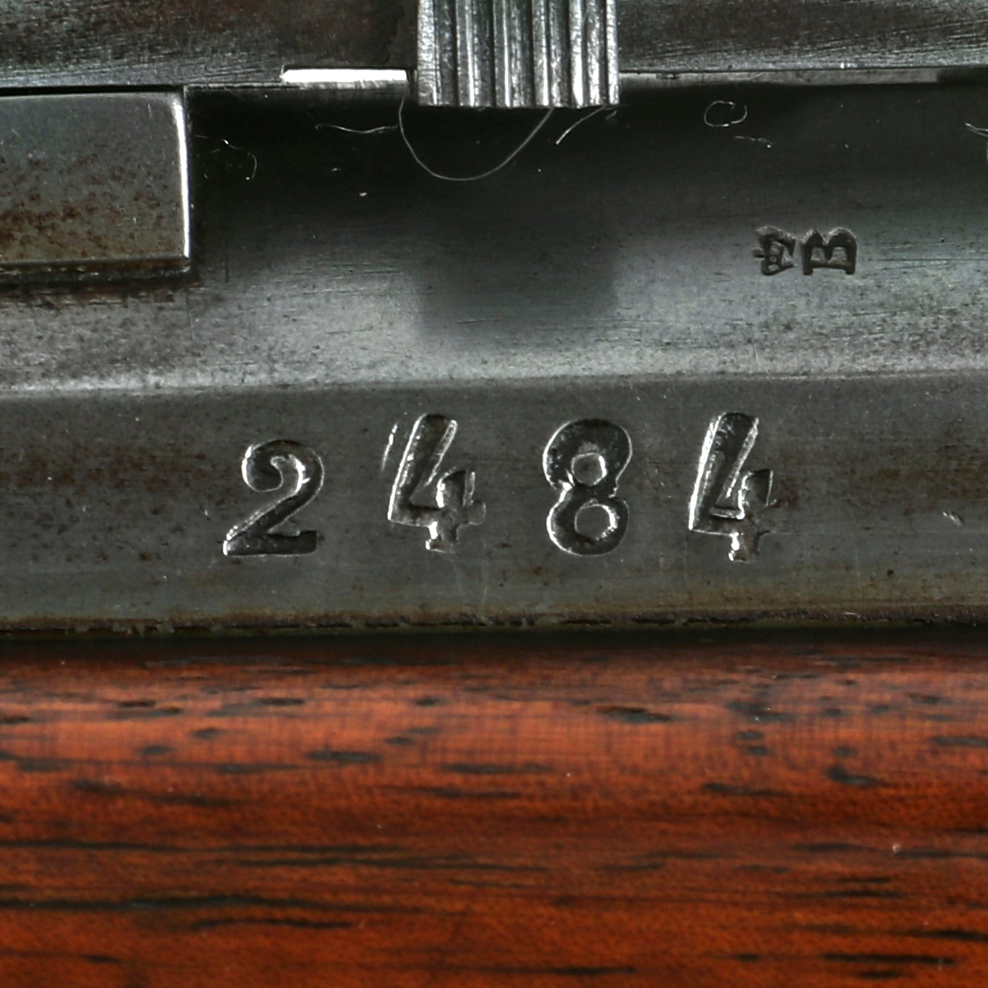 This example has serial number 2484 on the barrel and butt plate, and numbers S 298 on all of the bolt components, above the chamber on the receiver, as well as on the magazine floor plate. This is normal for the converted rifles, as the action had to be rebuilt. The barrel is dated 1876, and the receiver is worn, so we are not able to see any maker markings on it. It is in nice condition overall with a nice refinished stock, still bearing a clear DELFT / 1877 cartouche with CROWN / W in the middle, for William III of the Netherlands. Additionally, the butt plate is marked 1889, indicating the year it was converted to the bolt-action magazine system.