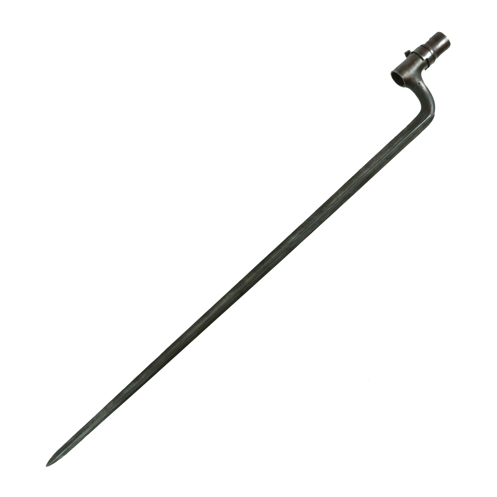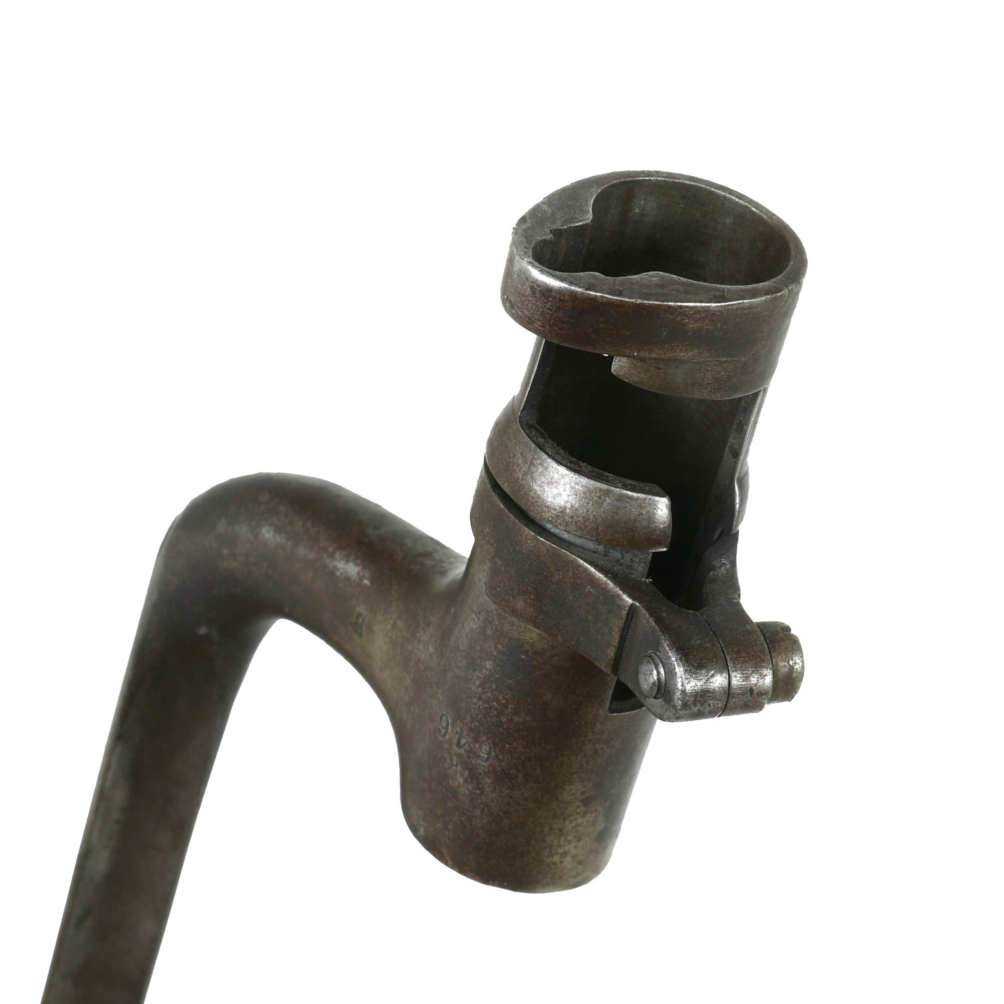 The included cruciform-blade socket bayonet is something we rarely see, as they were usually discarded. It is in very good condition, showing an aged stained patina, with some areas of peppering, but no pitting. The bayonet fits well, though it requires a rubber mallet to get it to fully seat and then remove.