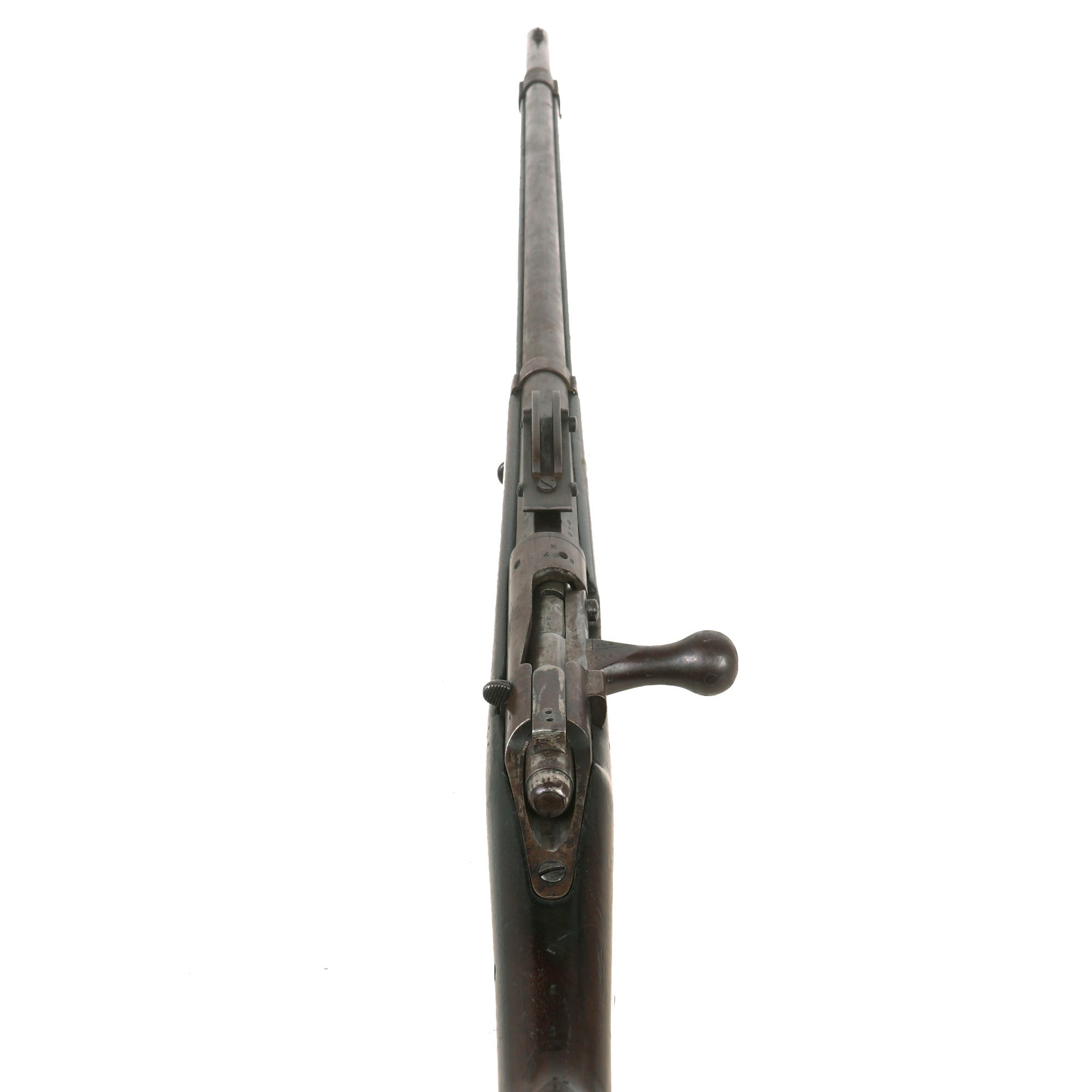 Still in use by the time WW1 came in 1914 but was much outclassed by the Mauser and Enfield rifle systems introduced in the late 1890s. An unusual system, the bolts spring is in fact housed inside the bolt handle, from an era of great firearms development worldwide, the dawn of the breech-loading period this is unusual and not easy to find. Ready to display!