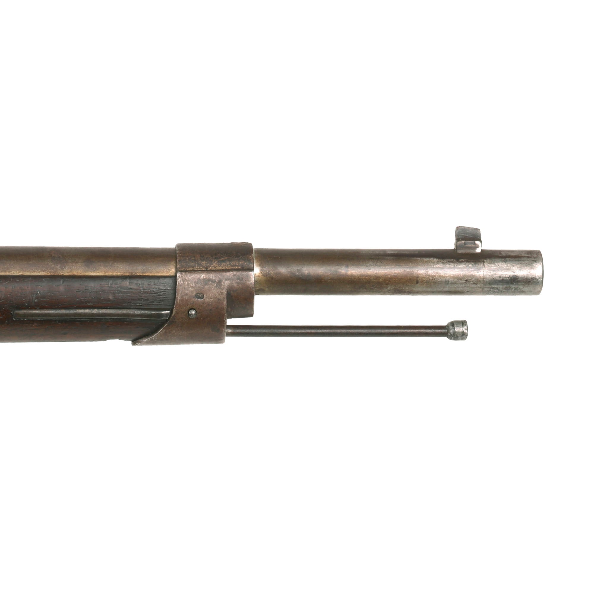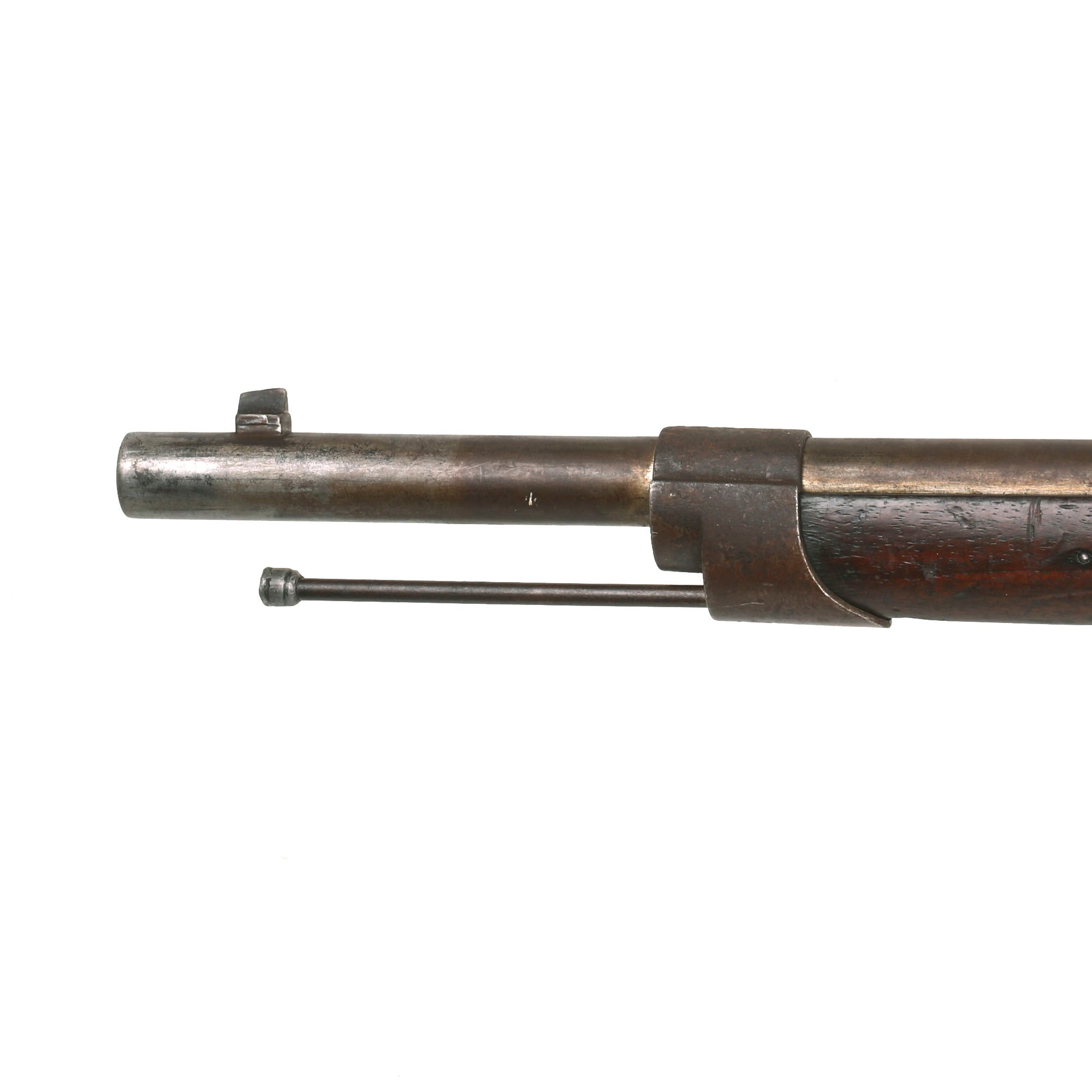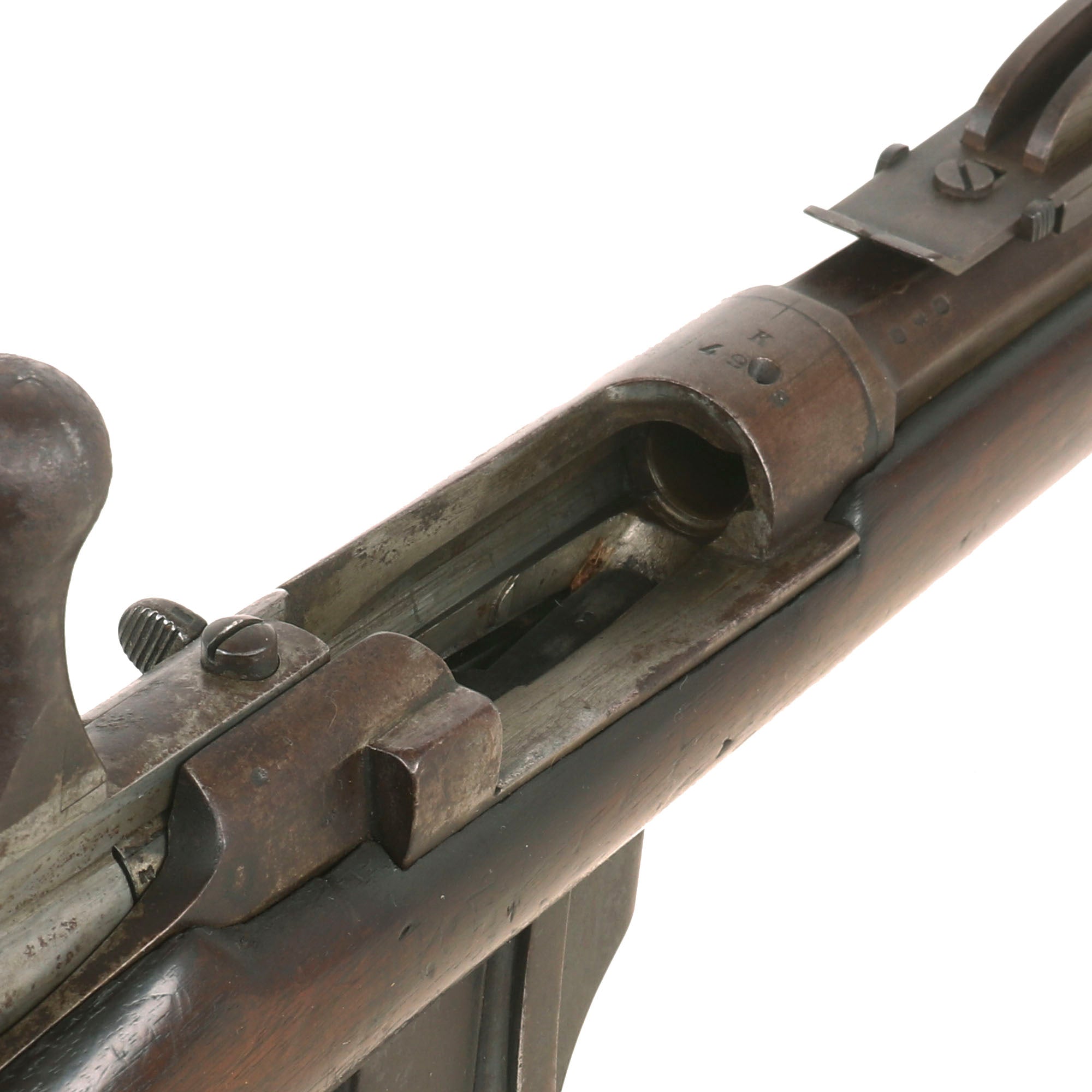 The rifle is in very good overall condition, and still retains both sling swivels, though the cleaning rod is a period fabricated replacement, fitted to the rifle long ago and well patinated. The metal finish shows a lovely matured light brown patina, probably from decades of attic storage.. All components are solid and the bolt moves crisply, though there is a bit of slop due to wear. The action looks to cycle correctly, and the magazine cutoff lever is present and functional. The bore is in very good condition, with strong lands and grooves and a mostly bright finish. There are just a few areas of oxidation and fouling in the groves.
