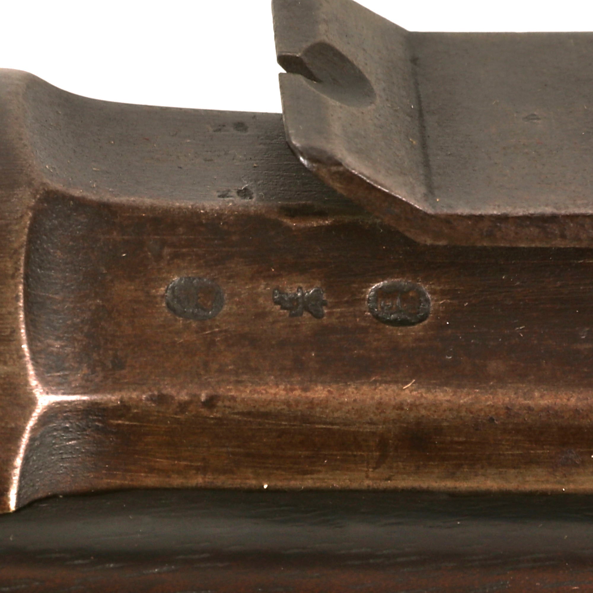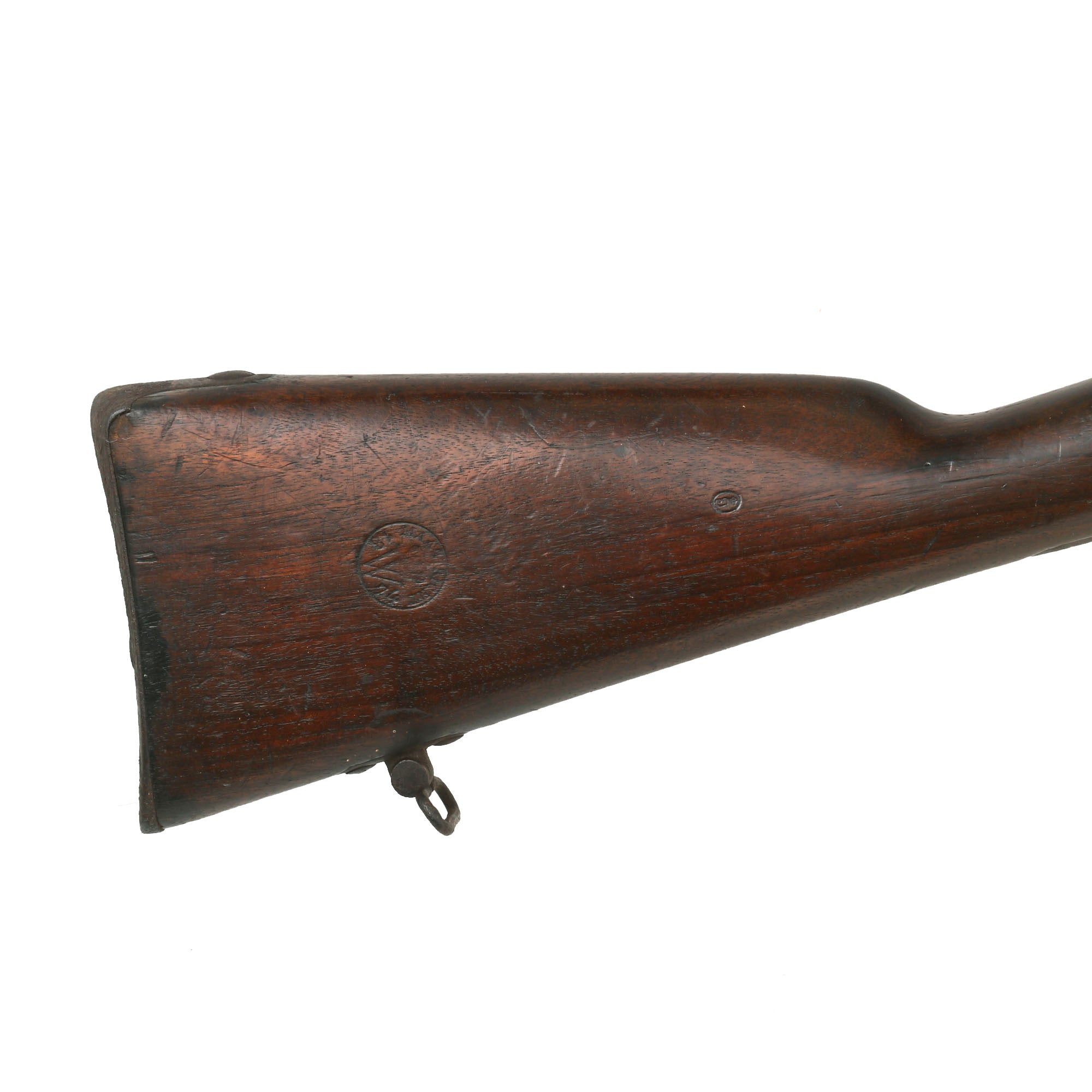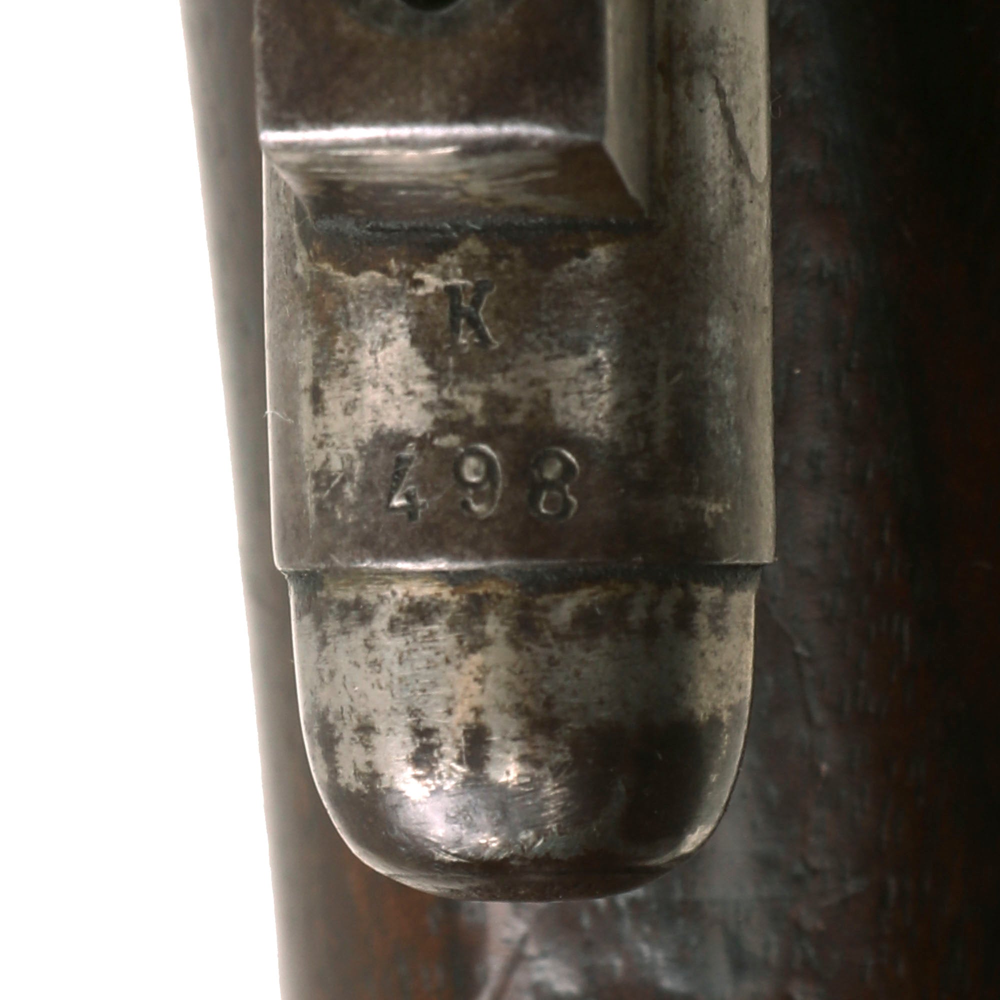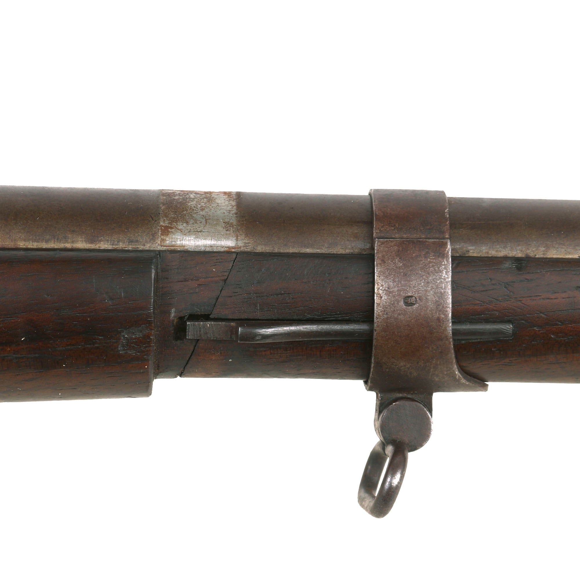 The rifle is in very good overall condition, and still retains both sling swivels, though the cleaning rod is a period fabricated replacement, fitted to the rifle long ago and well patinated. The metal finish shows a lovely matured light brown patina, probably from decades of attic storage.. All components are solid and the bolt moves crisply, though there is a bit of slop due to wear. The action looks to cycle correctly, and the magazine cutoff lever is present and functional. The bore is in very good condition, with strong lands and grooves and a mostly bright finish. There are just a few areas of oxidation and fouling in the groves.
