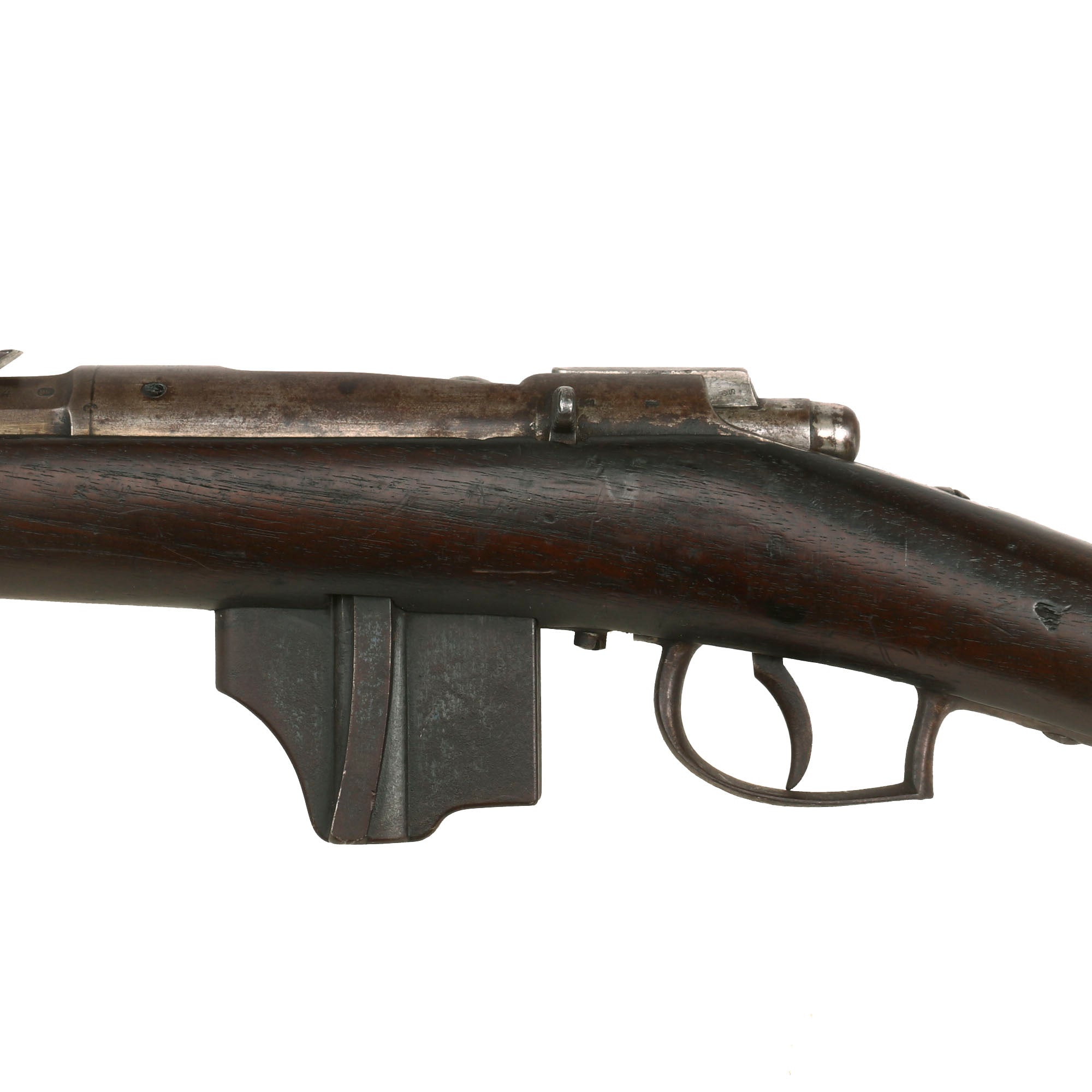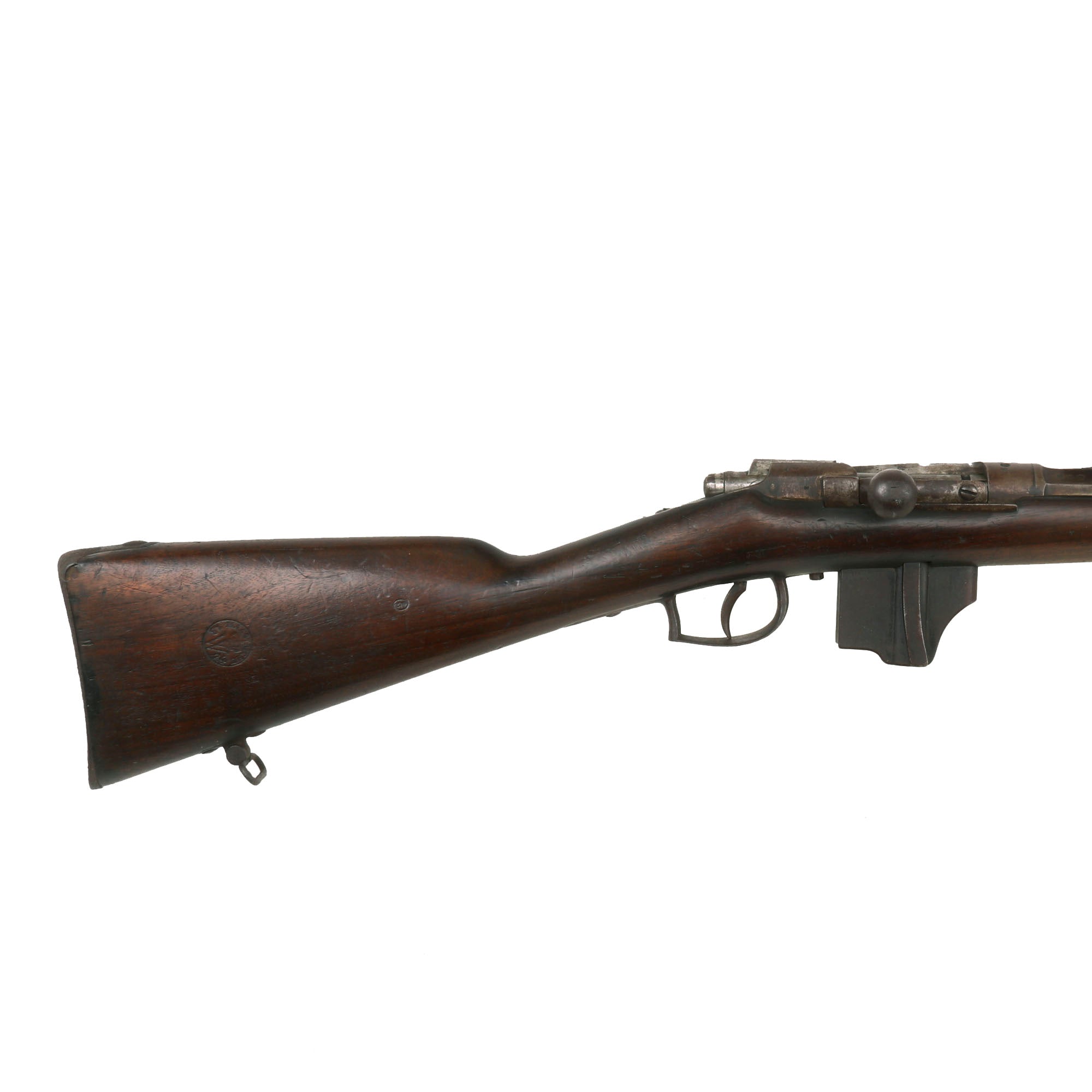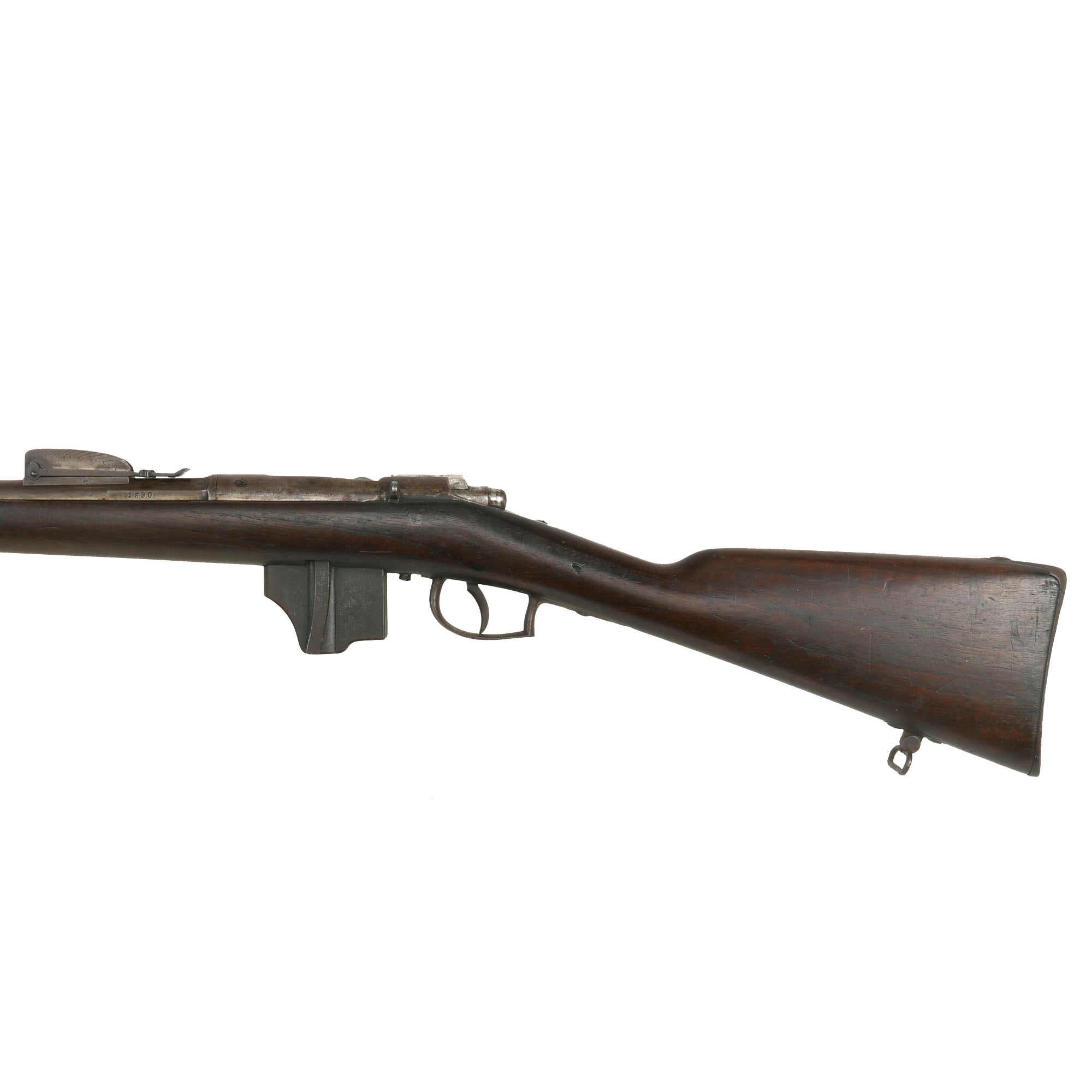 This example has serial number 1590 on the barrel and butt plate, and numbers K / 498 on the bolt components, above the chamber on the receiver, as well as on the magazine floor plate. This is normal for the converted rifles, as the action had to be rebuilt. The barrel is dated 1874, and the receiver has remnants of the P. STEVENS / [MAAST]RICHT. maker marking on the left side. It is in nice condition overall with a nice varnished stock, still bearing a clear MAASTRICHT / 1874 cartouche with CROWN / W in the middle. Additionally, the butt plate is marked 1890, indicating the year it was converted to the bolt-action magazine system.