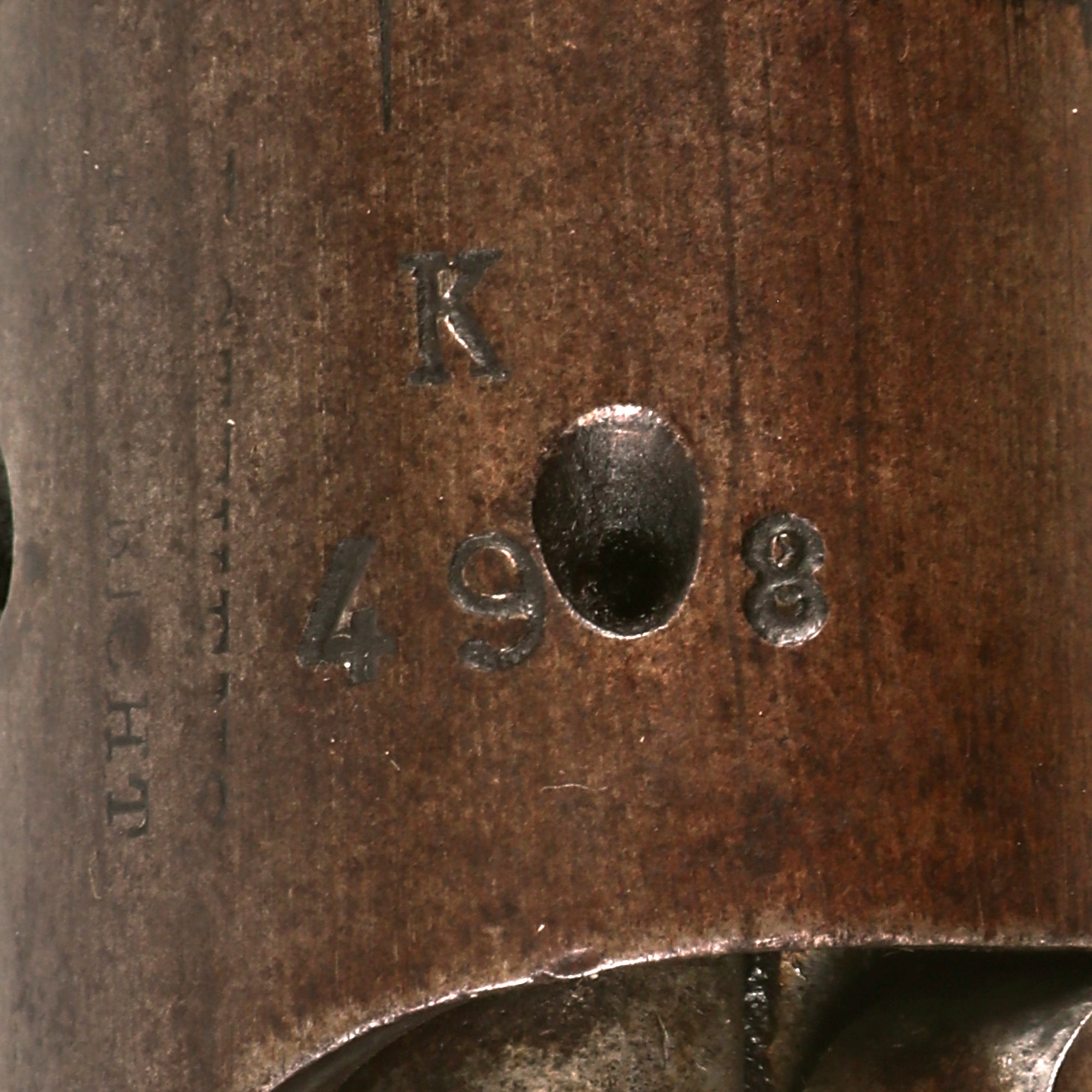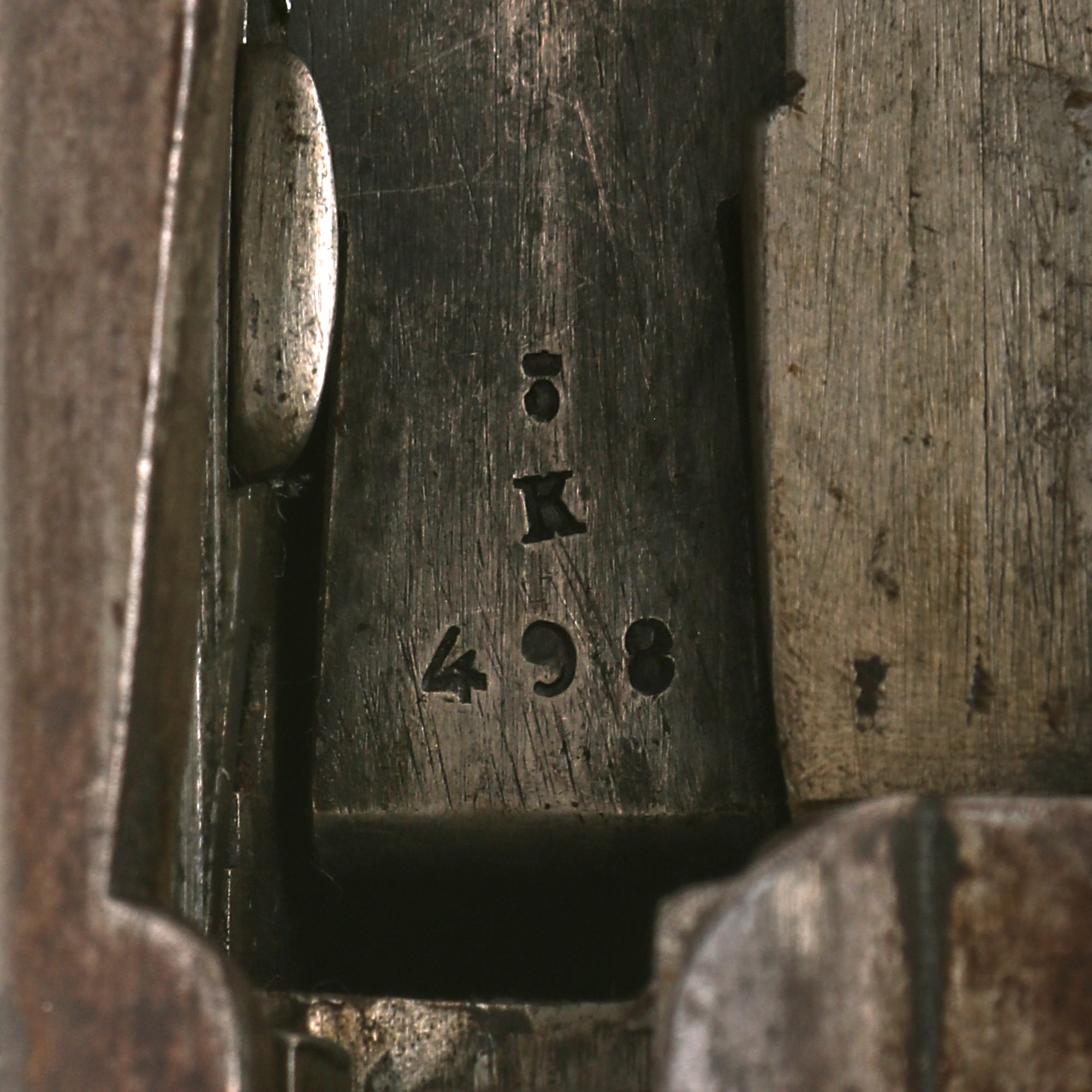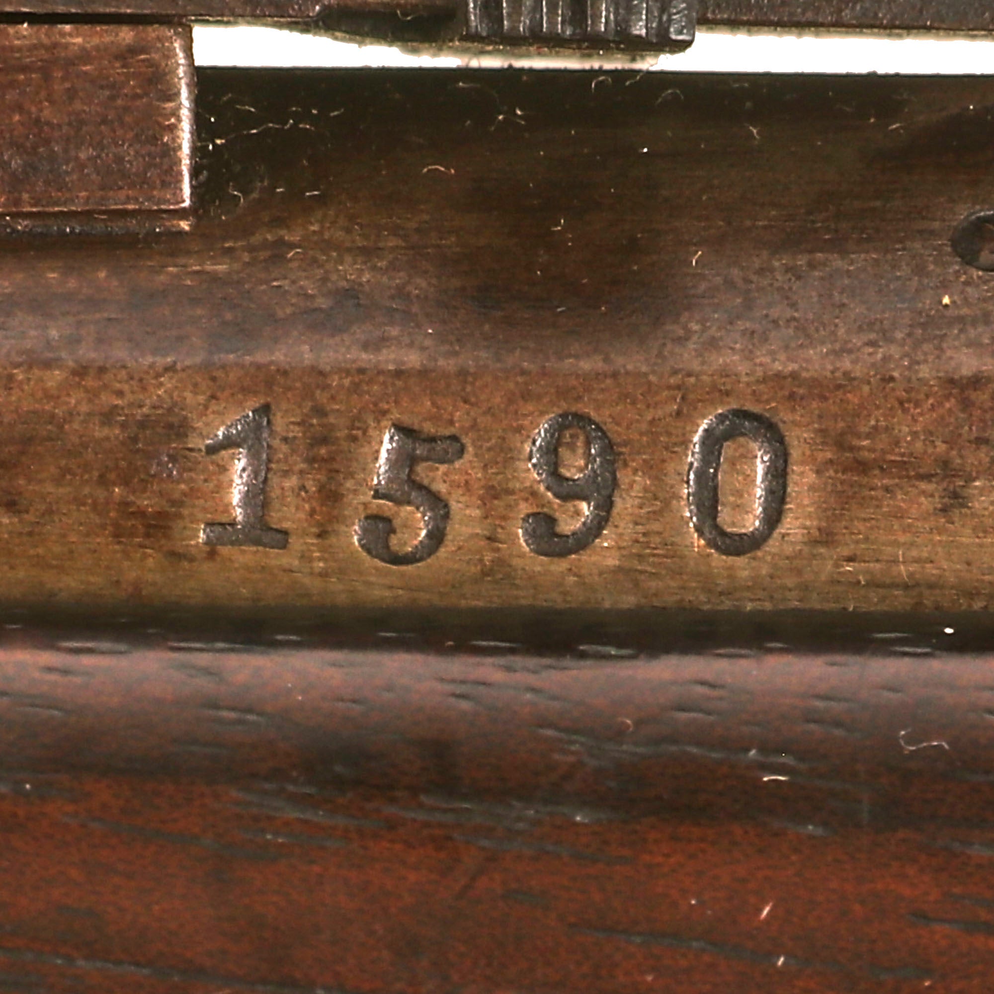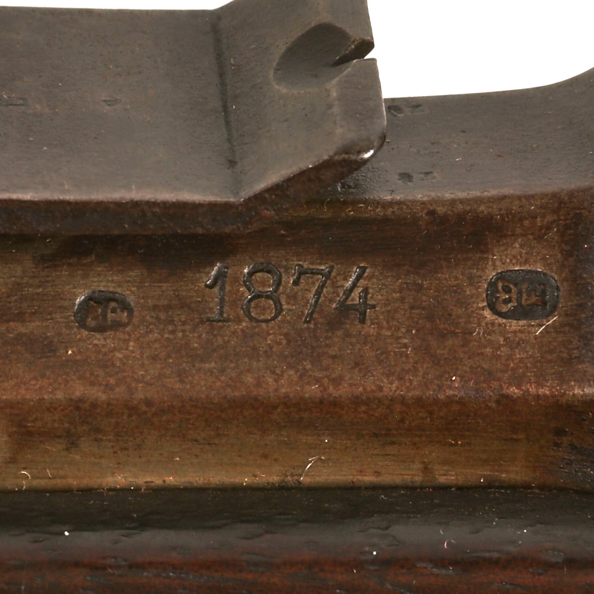 This example has serial number 1590 on the barrel and butt plate, and numbers K / 498 on the bolt components, above the chamber on the receiver, as well as on the magazine floor plate. This is normal for the converted rifles, as the action had to be rebuilt. The barrel is dated 1874, and the receiver has remnants of the P. STEVENS / [MAAST]RICHT. maker marking on the left side. It is in nice condition overall with a nice varnished stock, still bearing a clear MAASTRICHT / 1874 cartouche with CROWN / W in the middle. Additionally, the butt plate is marked 1890, indicating the year it was converted to the bolt-action magazine system.