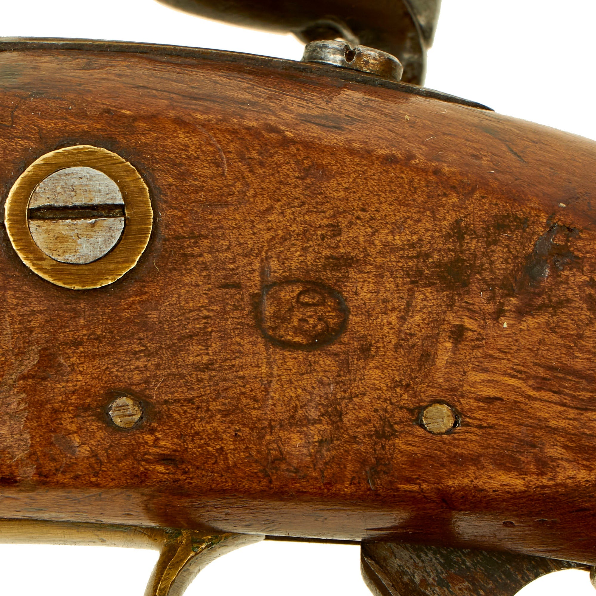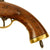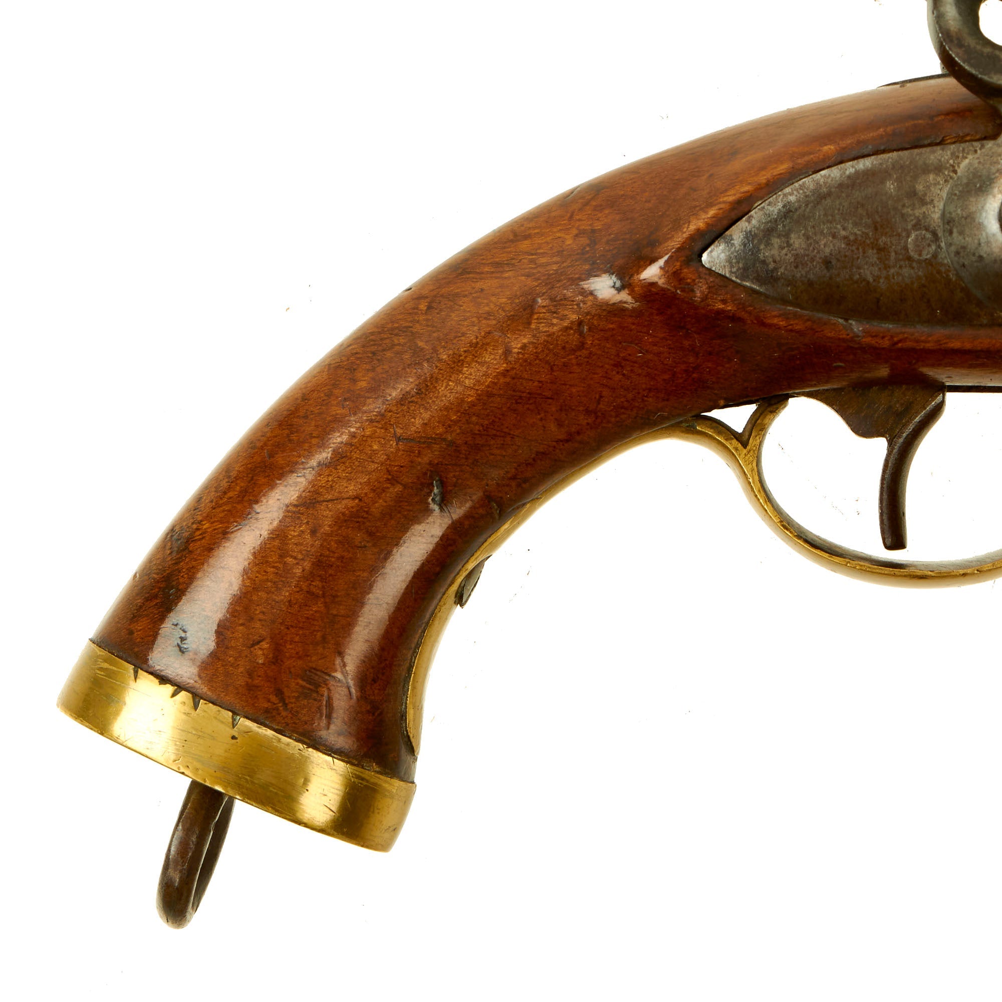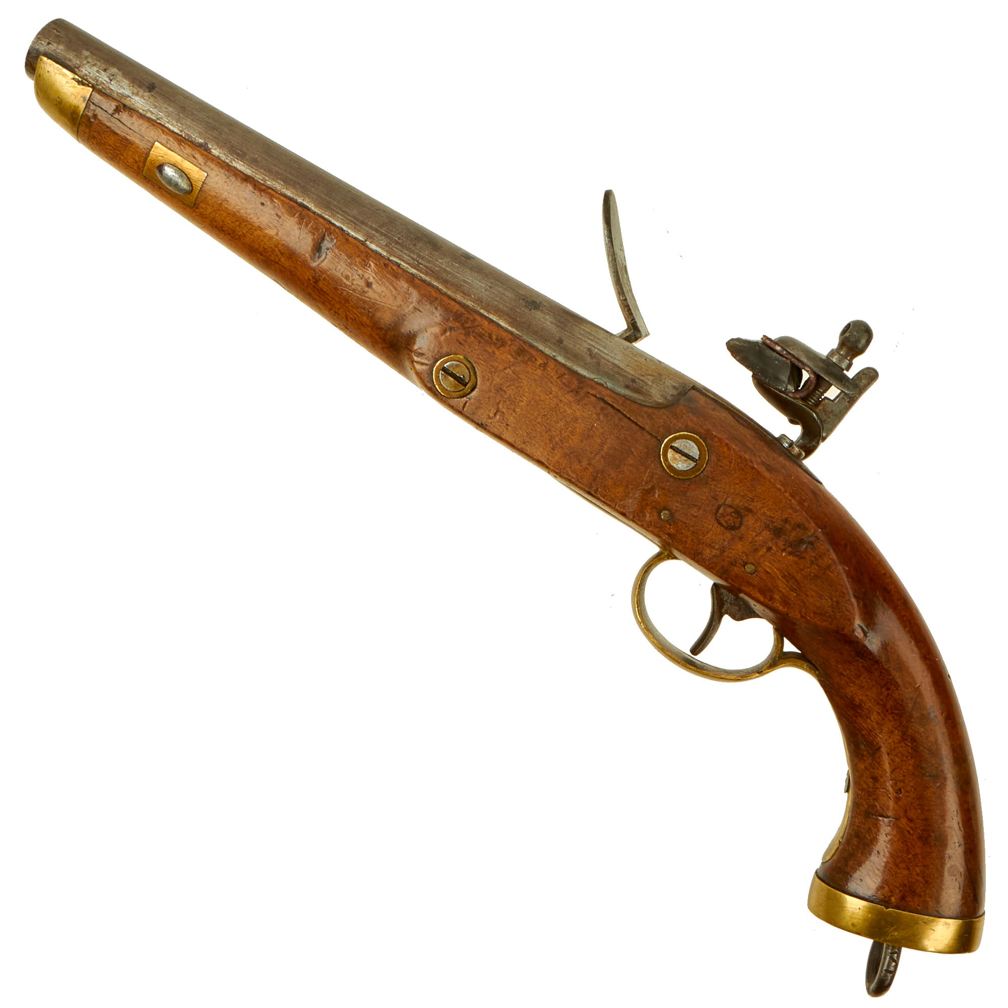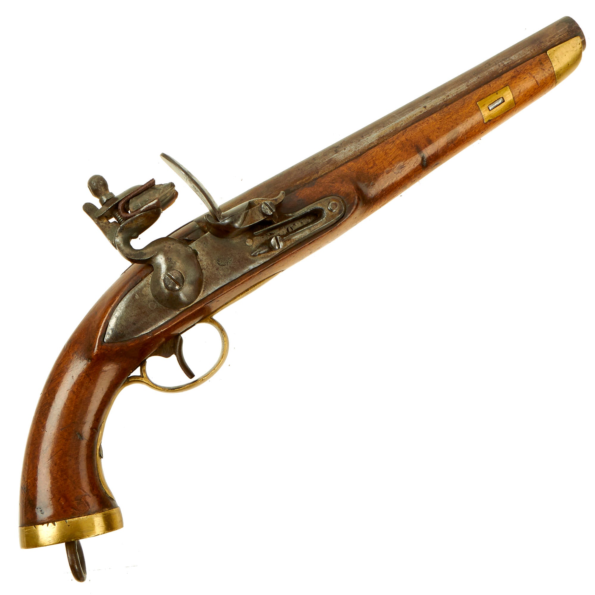 The pistol is fitted with a 9" barrel showing a small proof mark that we cannot make out. Its overall length is almost 16" and has a large lanyard ring on the bottom of the brass mounted butt cap. All the mounts are brass and the overall condition is really nice. The stock has a lovely honey color to it, and shows only light wear from use in service. There are no cracks or repairs that we can see. The lock is functional, holding correctly at half cock and only releasing at full.