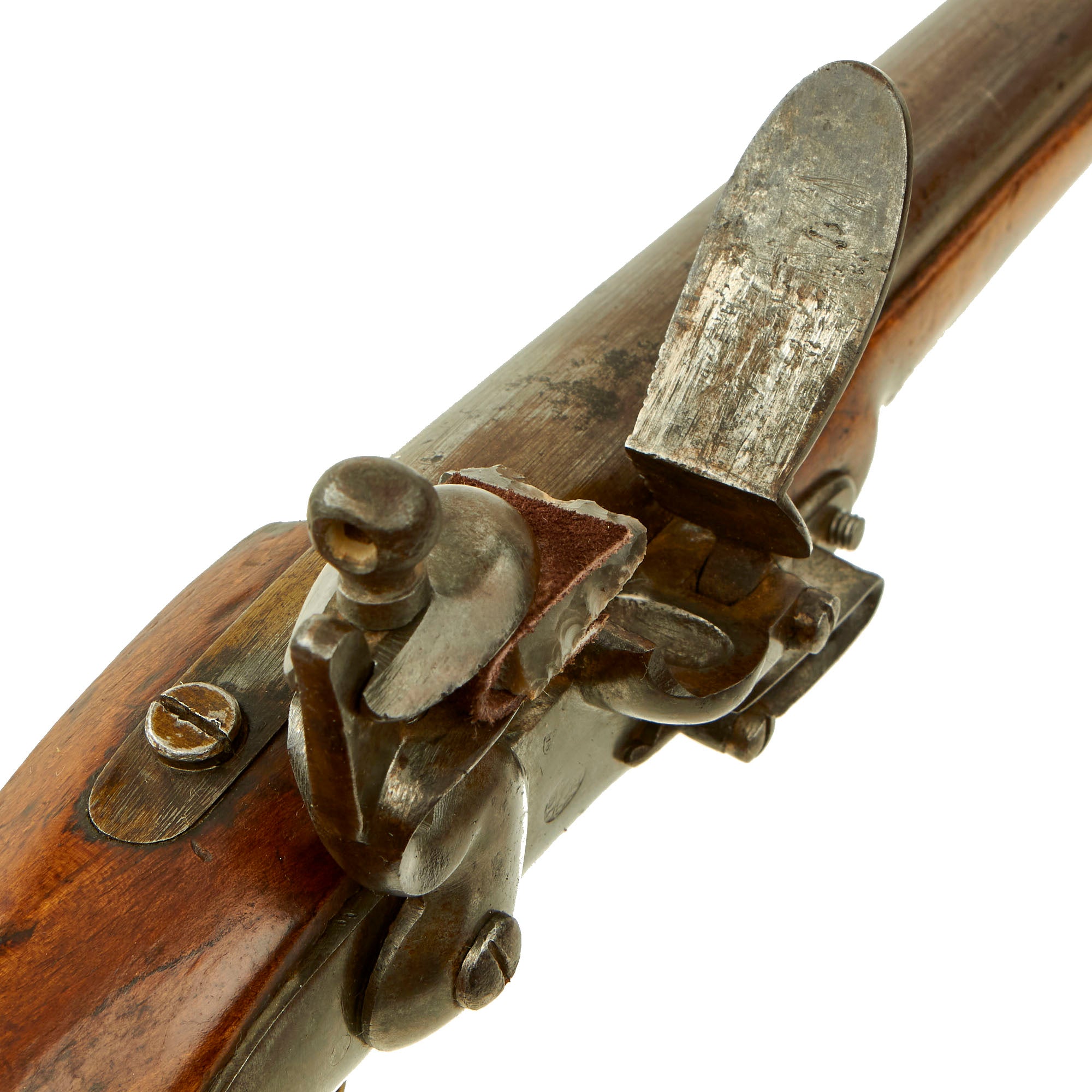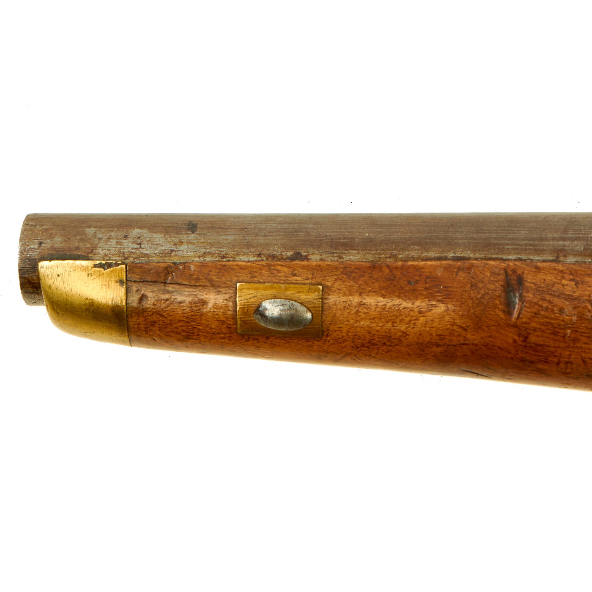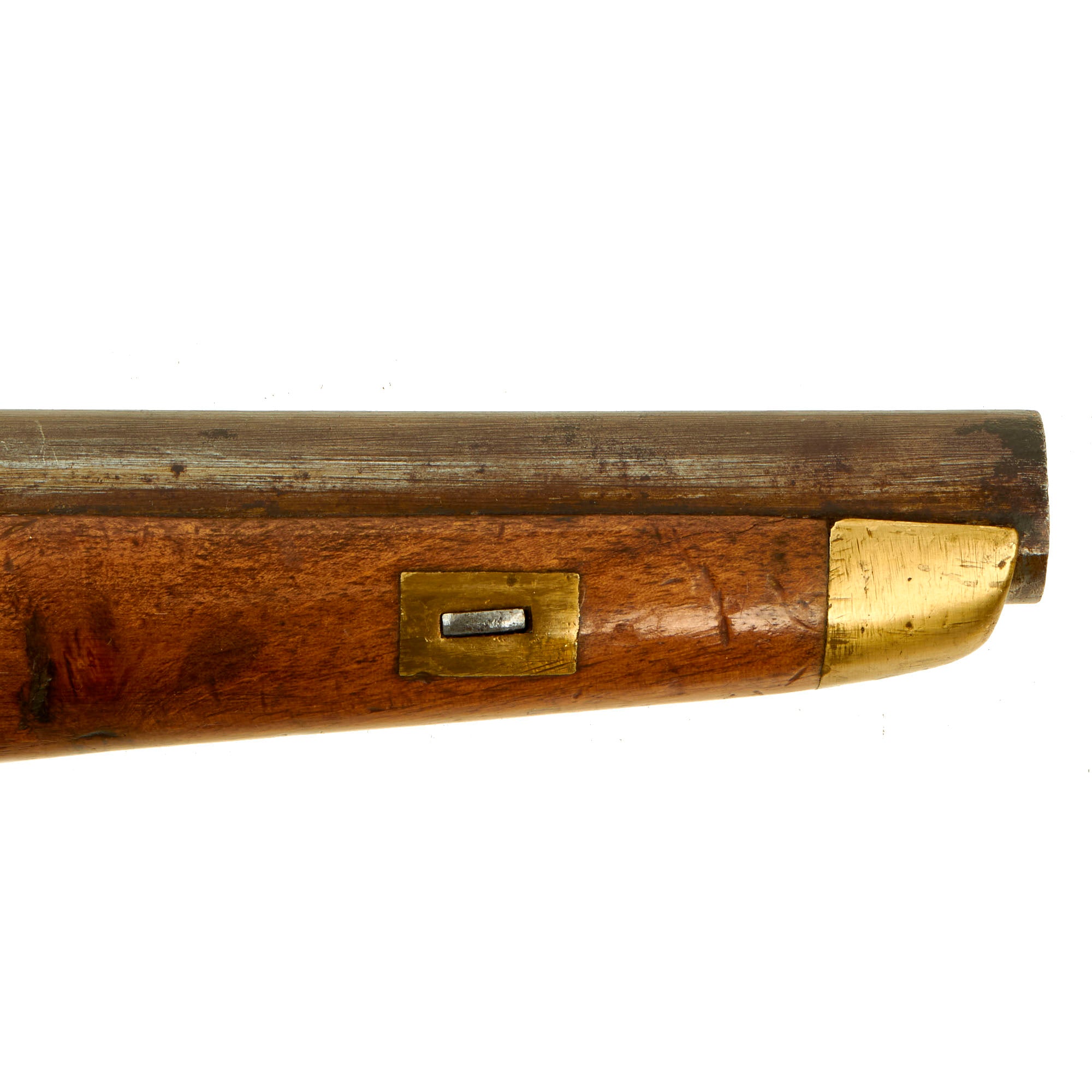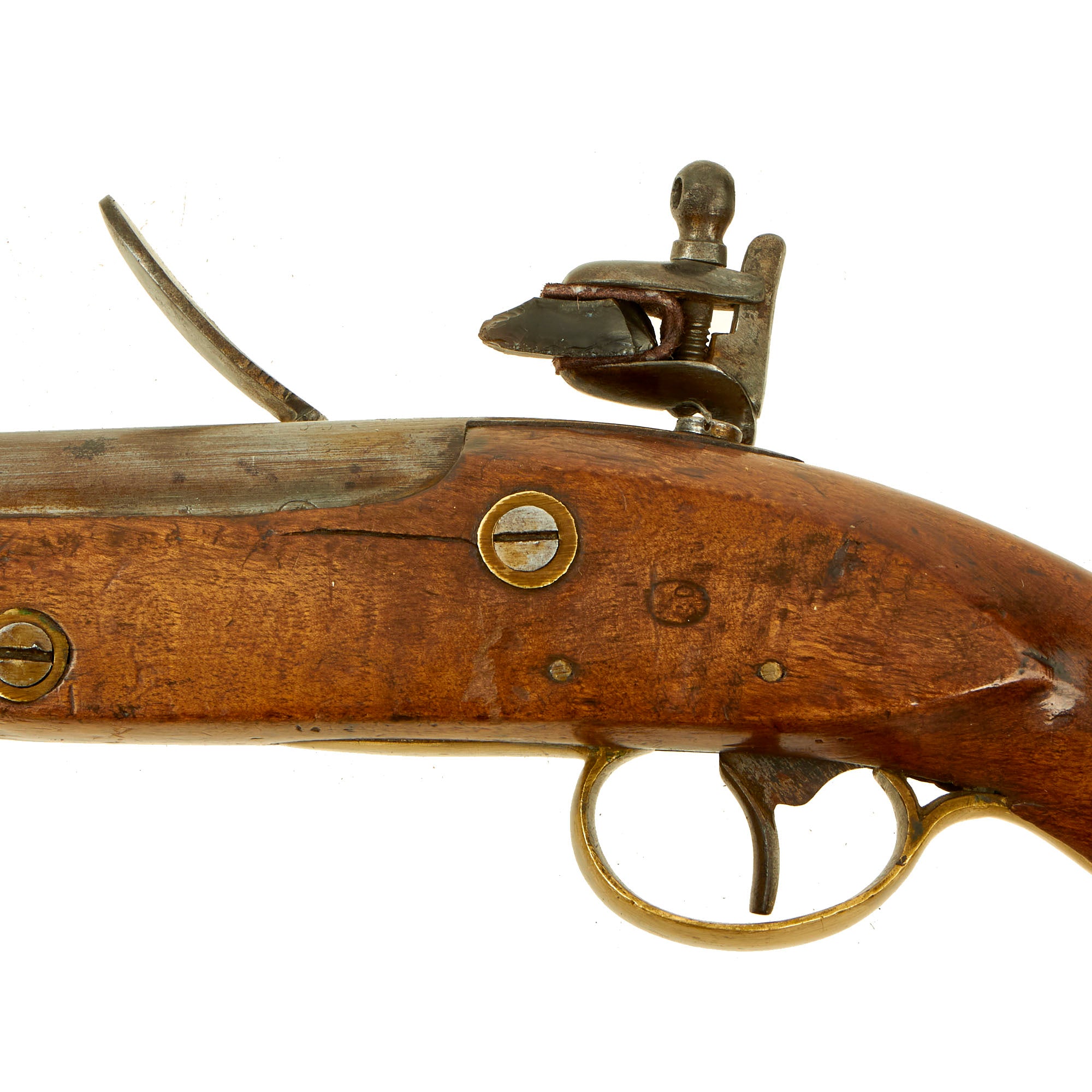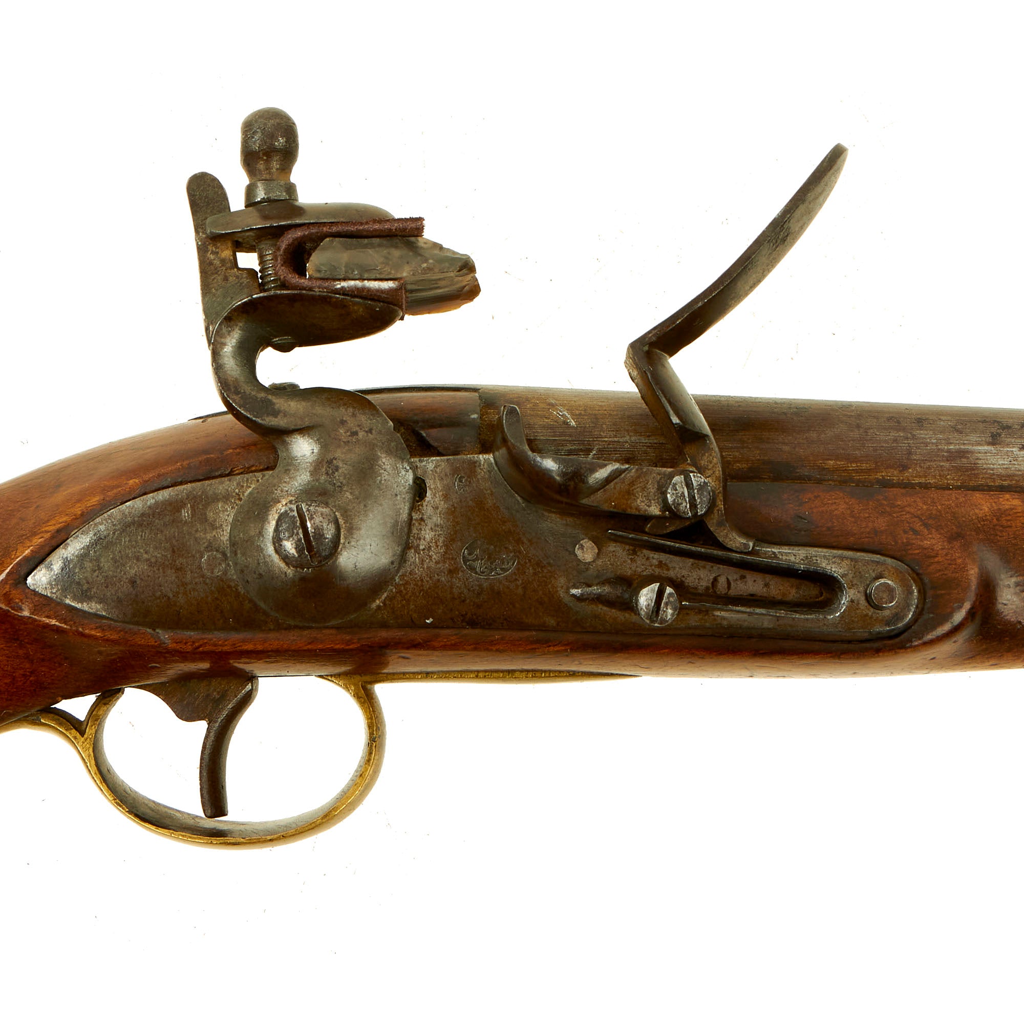 The pistol is fitted with a 9" barrel showing a small proof mark that we cannot make out. Its overall length is almost 16" and has a large lanyard ring on the bottom of the brass mounted butt cap. All the mounts are brass and the overall condition is really nice. The stock has a lovely honey color to it, and shows only light wear from use in service. There are no cracks or repairs that we can see. The lock is functional, holding correctly at half cock and only releasing at full.