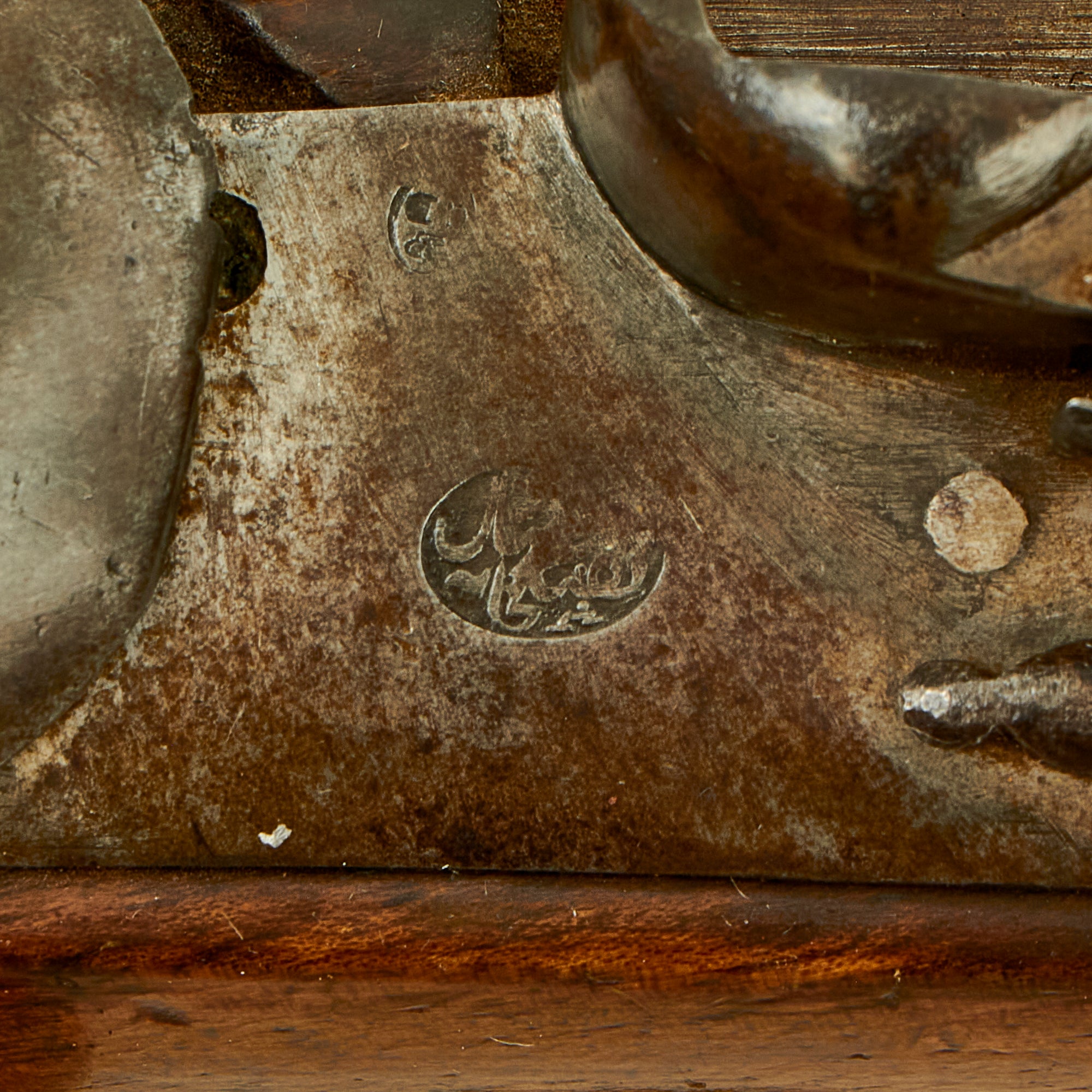 There is no provision for ramrod, the mounts are all of brass and the grade of manufacture is really quite high. Probably one of the most encountered original flintlock martial pistols from Europe encountered to day. There are few maker markings on the gun, except for some proofs and a small round cartouche in the middle of the lock plate. Close inspection shows that it looks to be "Pegon Script", which is a modified Arabic script used in the Dutch East Indies. These colonial possessions of Holland were being rapidly expanded during the early 19th century, and as with any Empire, arms were needed for defense. The design of the pistol is identical to other Dutch pistols from the time period, except for the different markings. The quality of manufacture is definitely European.