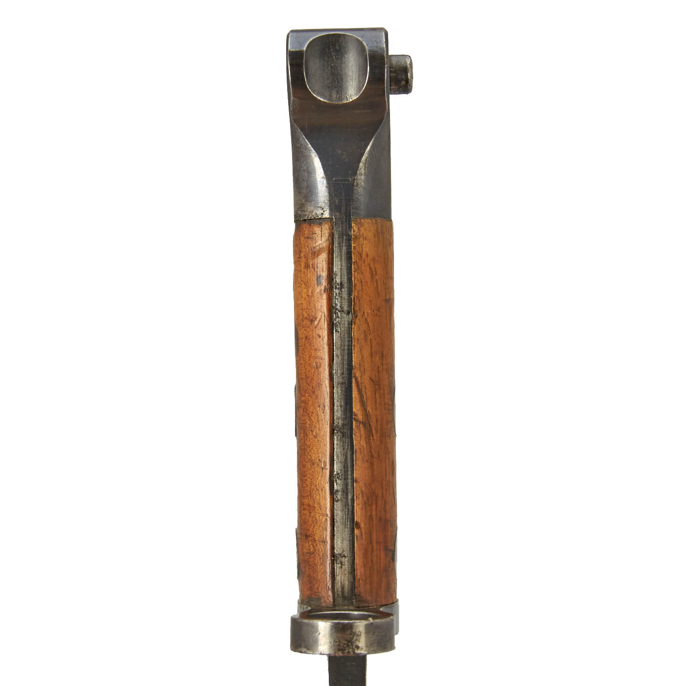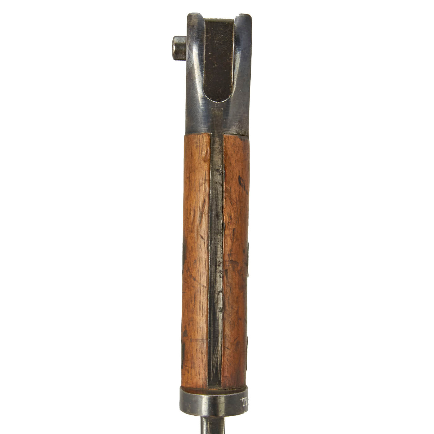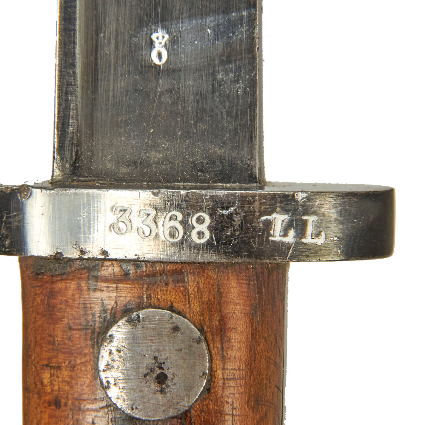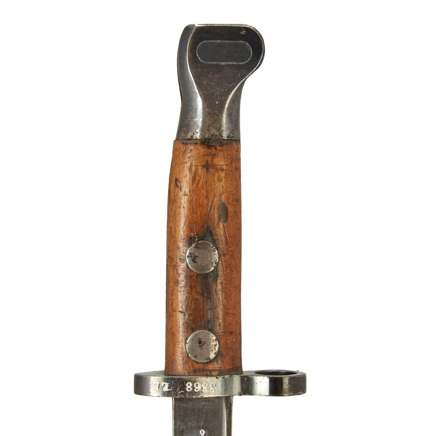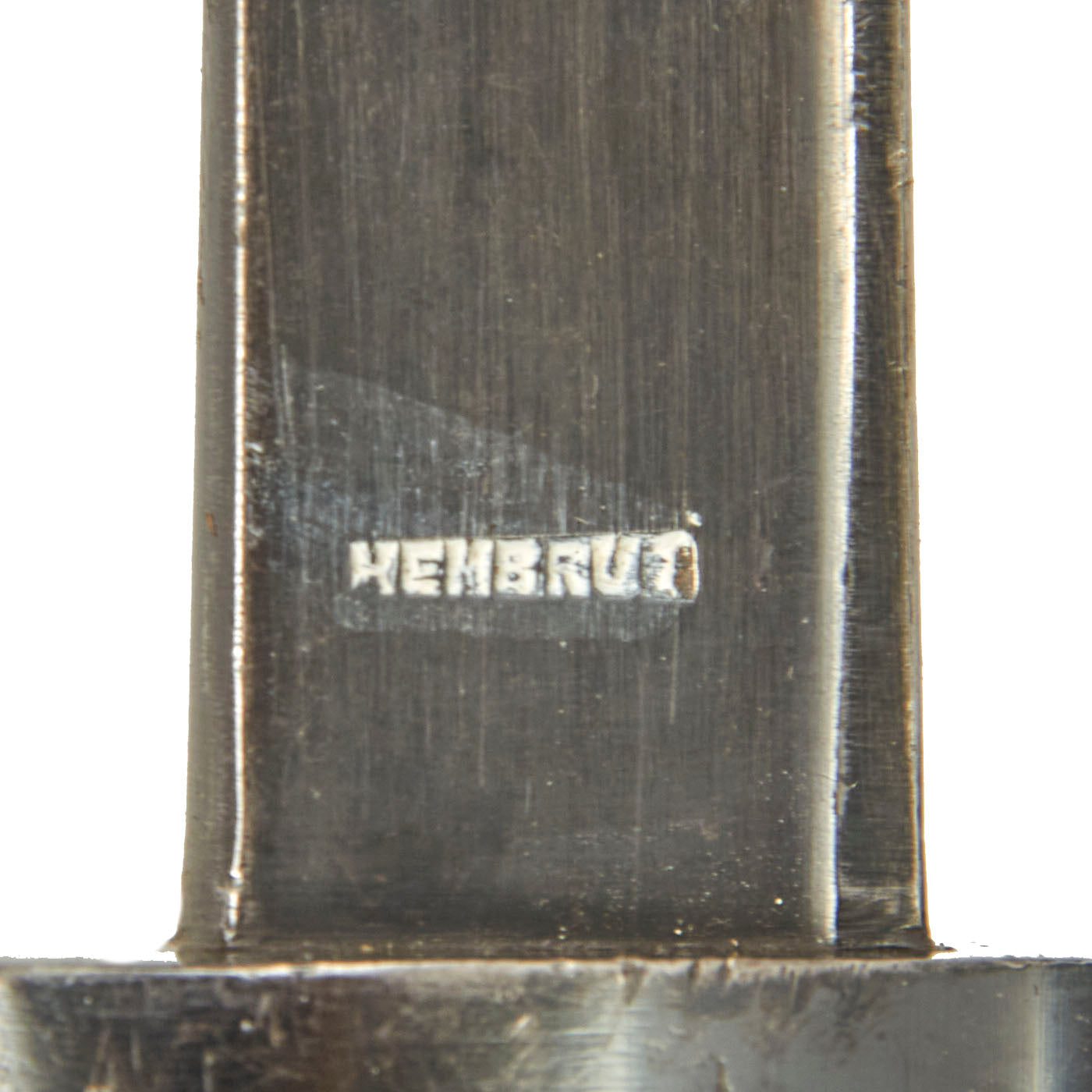 This is a typical example, showing much of the original blued finish on the bayonet, except where the blade has been shortened and re-profiled. The cross guard is marked with serial number 3368 LL, and the body of the blade with HEMBRUG. This was the trademark of Artillerie Inrichtingen, in Zaandam, referring to a swing bridge across the North Sea Canal that provided railroad access to the factory. This company began production of these bayonets in 1904, where previously foreign contractors had been used.
