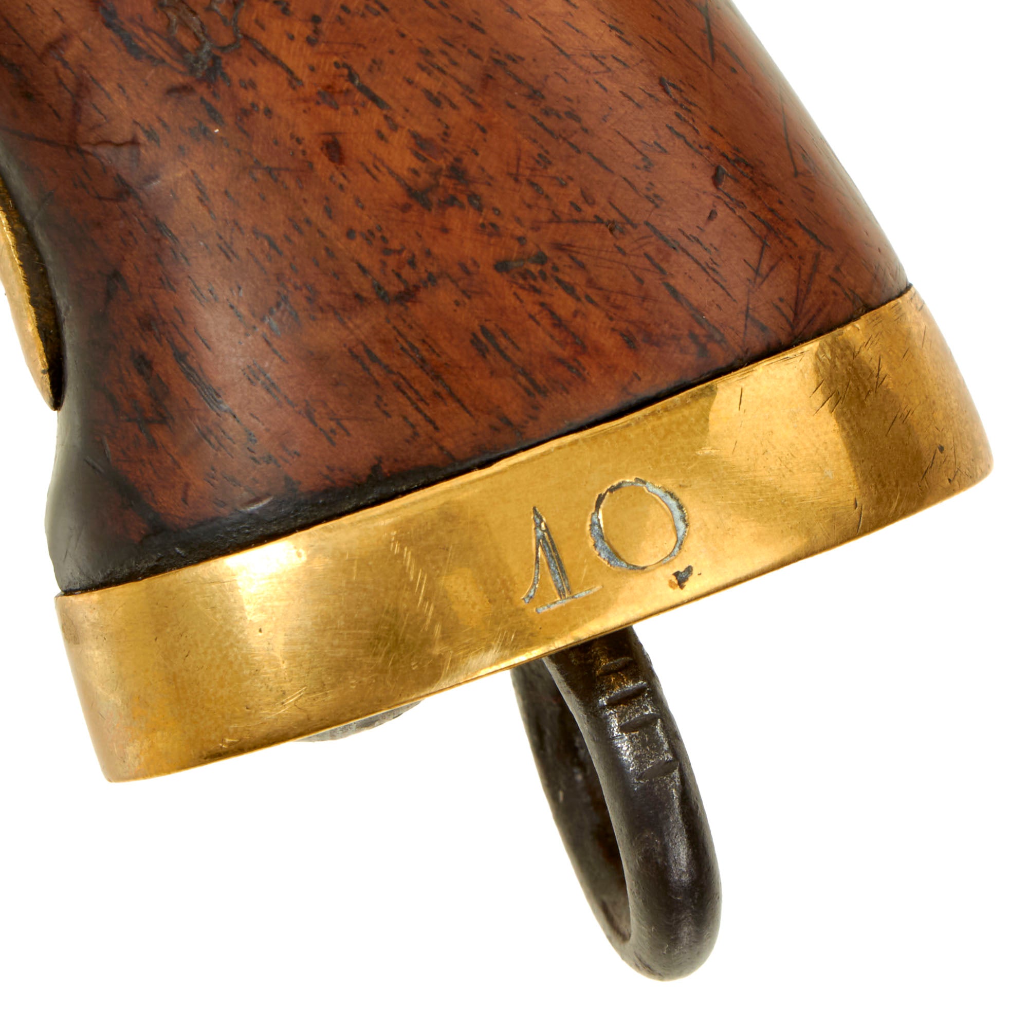 The pistol carbine's overall length is about 19" and it has a large lanyard ring on the bottom of the brass mounted butt cap. All the mounts are brass and the overall condition is really nice. The stock does show wear overall from service, with scratches and small dents, and there is a crack on the left side running from a lock screw to the breech, a very common location to see these. There are no repairs or other cracks that we can see, and the stock color is really quite lovely, showing a lot of "curl" in the grain. The lock is fully functional, holding correctly at half cock and firing at full.