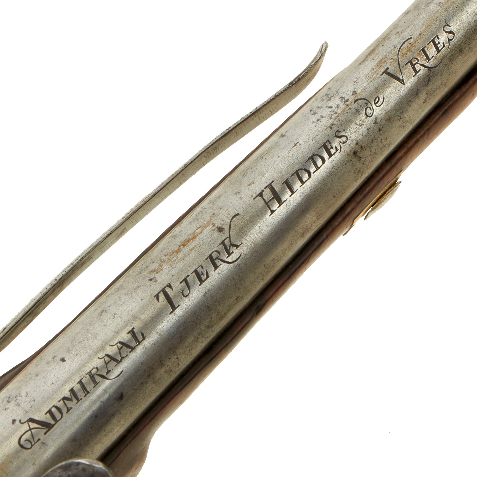 The top of the barrel shows a stylized ADMIRAL TJERK HIDDES de VRIES engraved on the top. Tjerk Hiddes de Vries (6 August 1622 – 6 August 1666) was a Dutch States Navy officer who rose to the rank of Admiral. The French, who could not pronounce his name, called him Kiërkides. His name was also given as Tsjerk, Tierck or Tjerck. He was appointed "Lieutenant-Admiral of Frisia" in 1665 during the Second Anglo-Dutch War, and greatly contributed to the Dutch victory during the Four Days' Battle in 1666. He unfortunately did not fare as well during the St James's Day Battle, and was severely wounded, during the engagement, which would lead to his demise two days later.