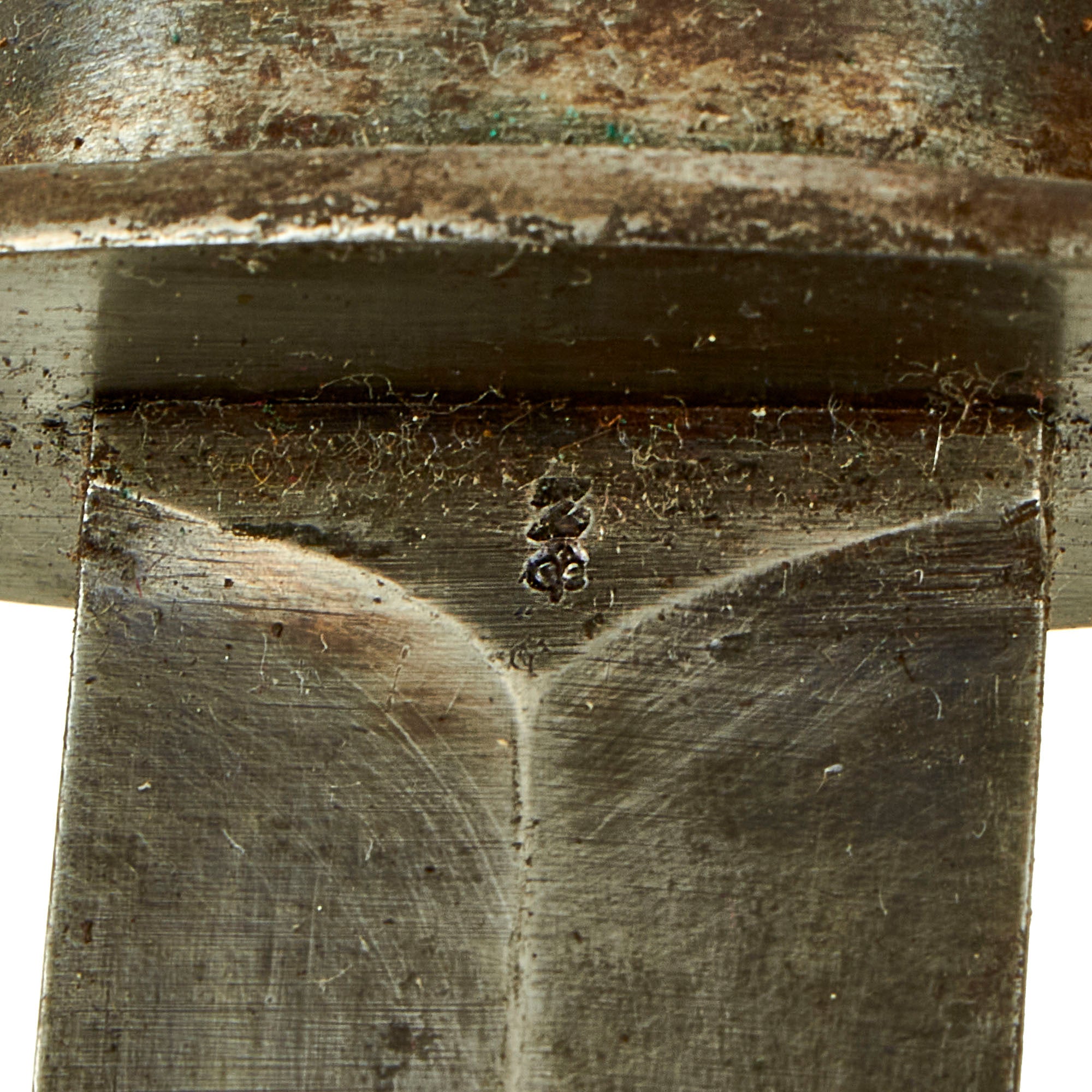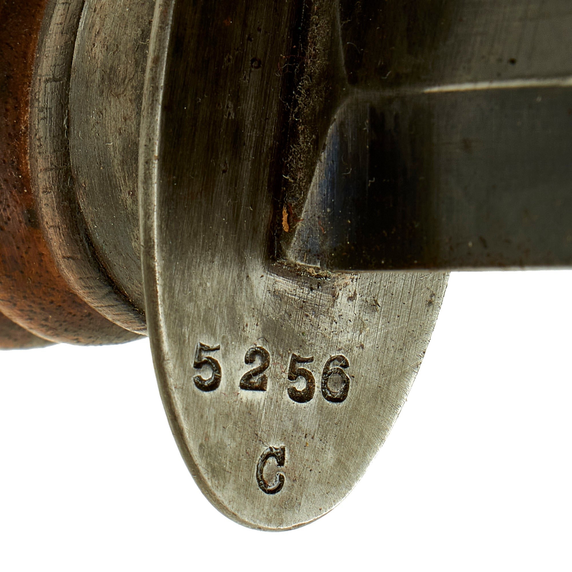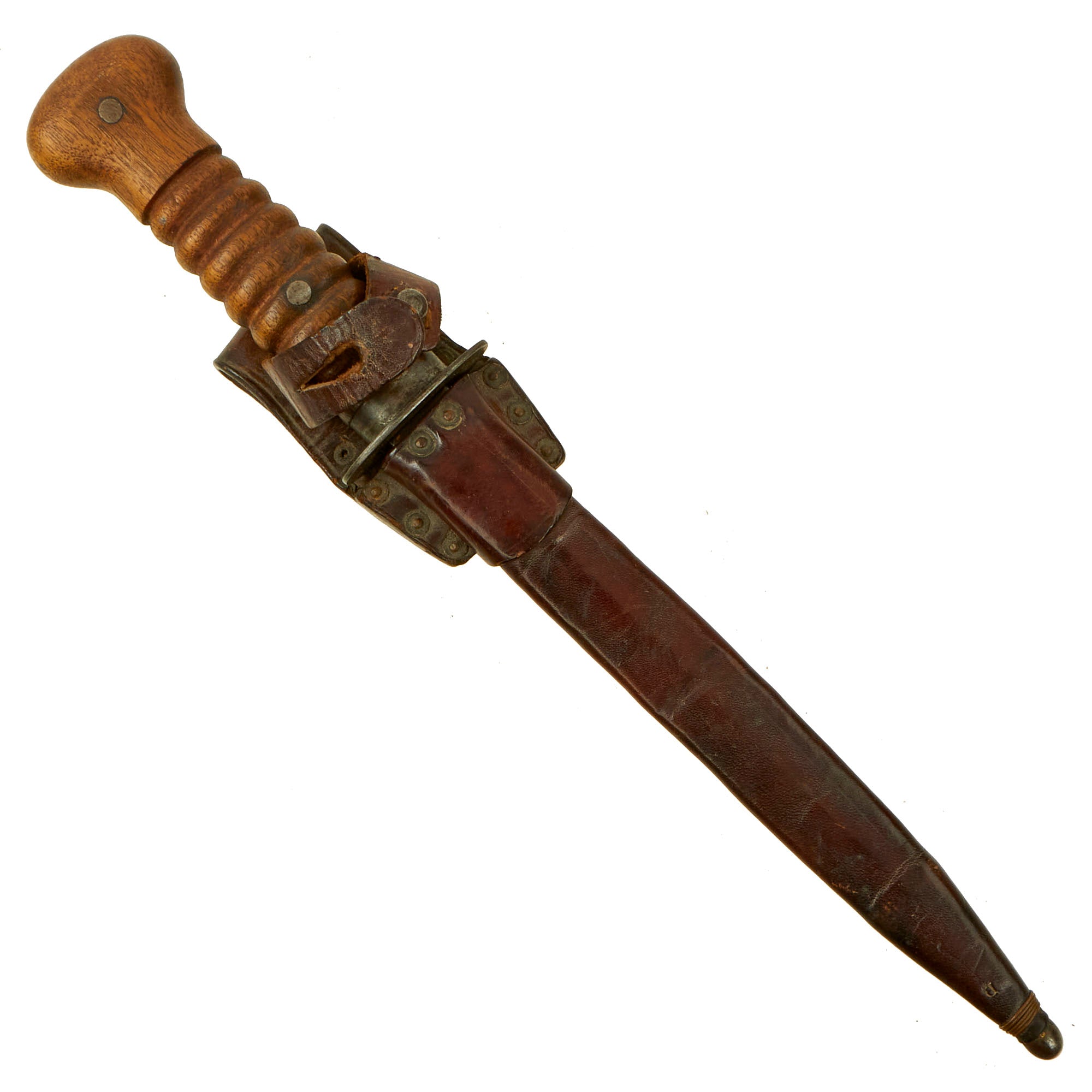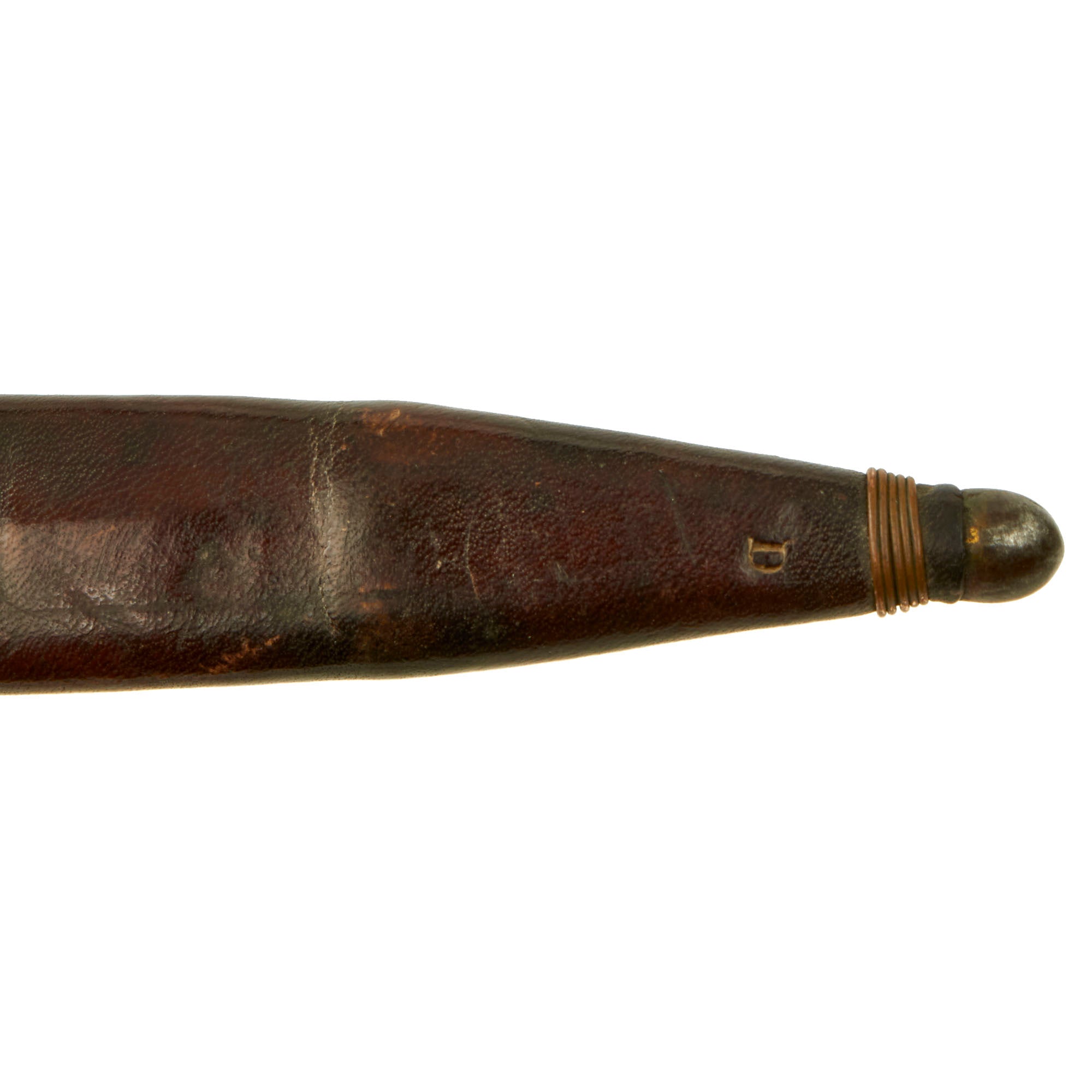 The front of the crossguard was stamped with the serial number of the knife, and this same serial number was marked on the rear of the frog, which the leather scabbard was attached to. The ferrule, ricasso and wooden pommel cap were all marked with military inspection marks. The knife was carried in a brown leather covered metal scabbard with a steel ball tip. The scabbard was permanently attached to a leather belt frog via rivets, and the frog included a retaining strap to secure the hilt of the knife.