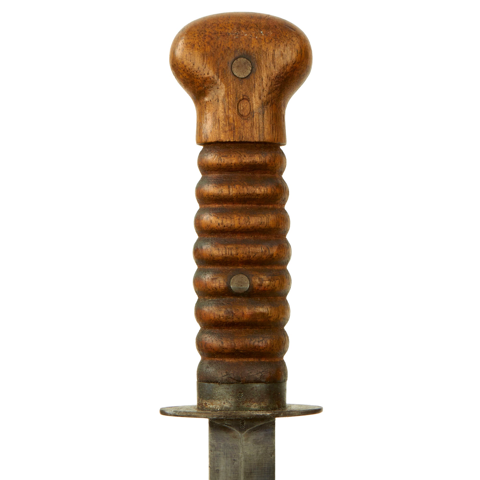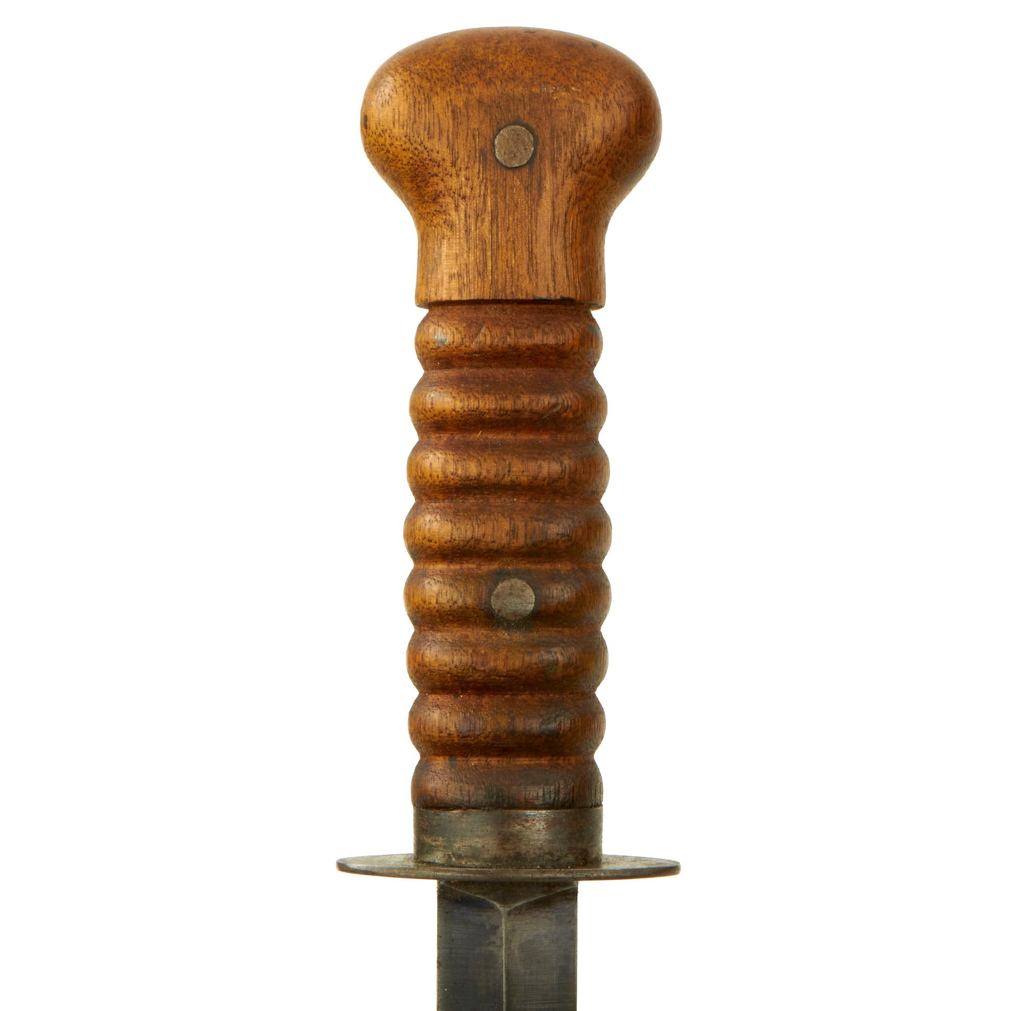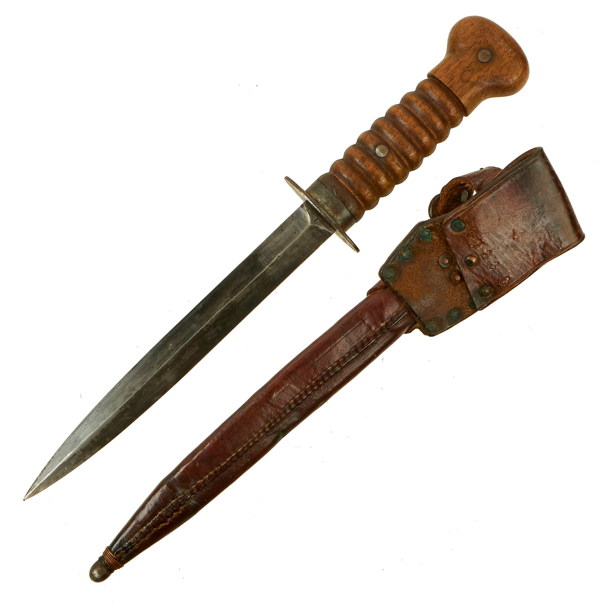 The knife, as originally produced, was manufactured with an 8" stiletto blade and had an overall length of about 13 1/4". The blade was heat blued and examples with large amounts of their original blade finish are truly striking. The solid wooden handle was oval in cross section, with eight grasping grooves to enhance the grip of the knife. The grip was otherwise smooth, with a bulbous pommel cap area. The blade was secured to the solid wood handle with a pair of rivets that were approximately 1/4" in diameter. A 3/16" wide metal ferrule reinforced the front section of the handle, butting up against an oval cross guard that was approximately 2 1/8" x 15/16". The ferrule and cross guard were heat blued as well.