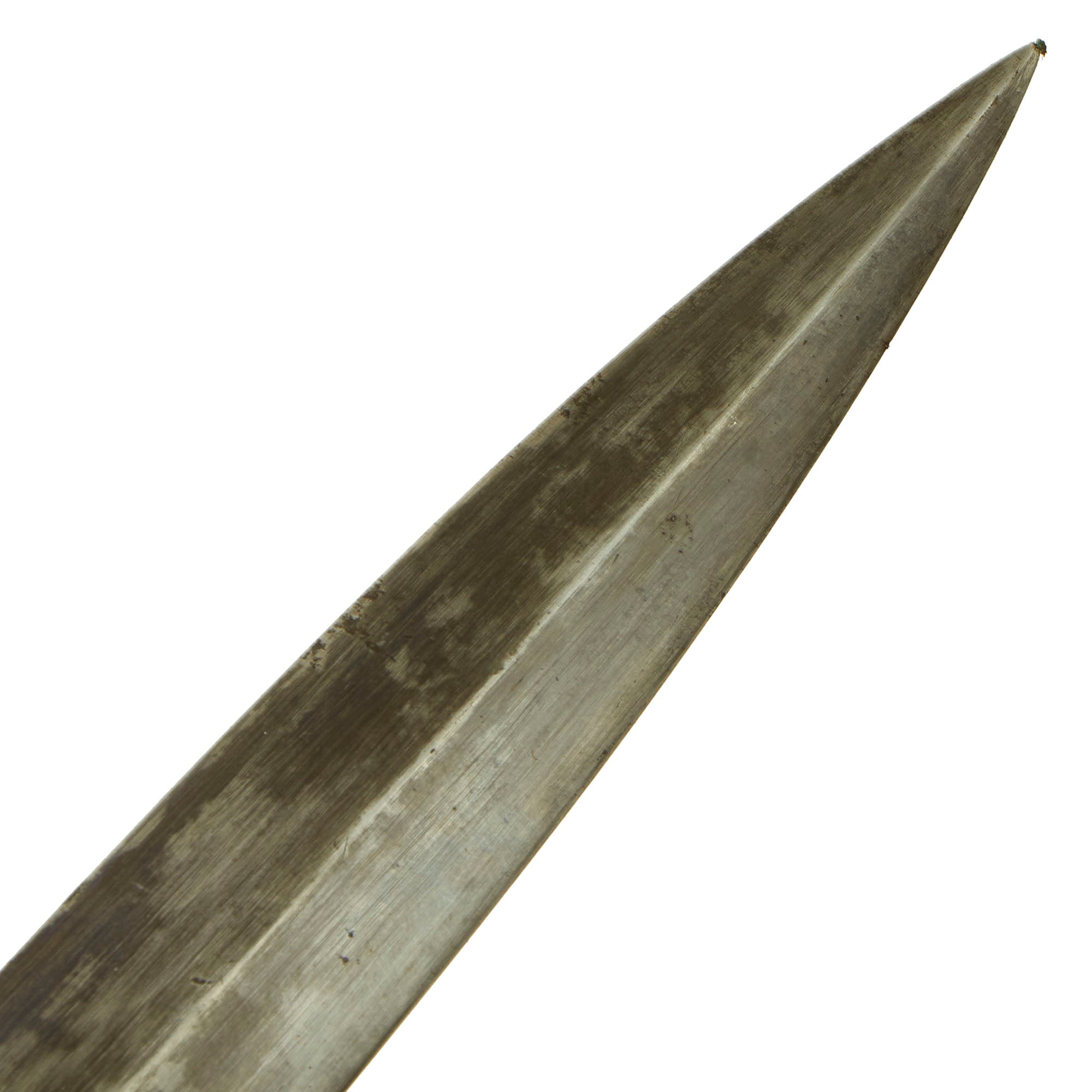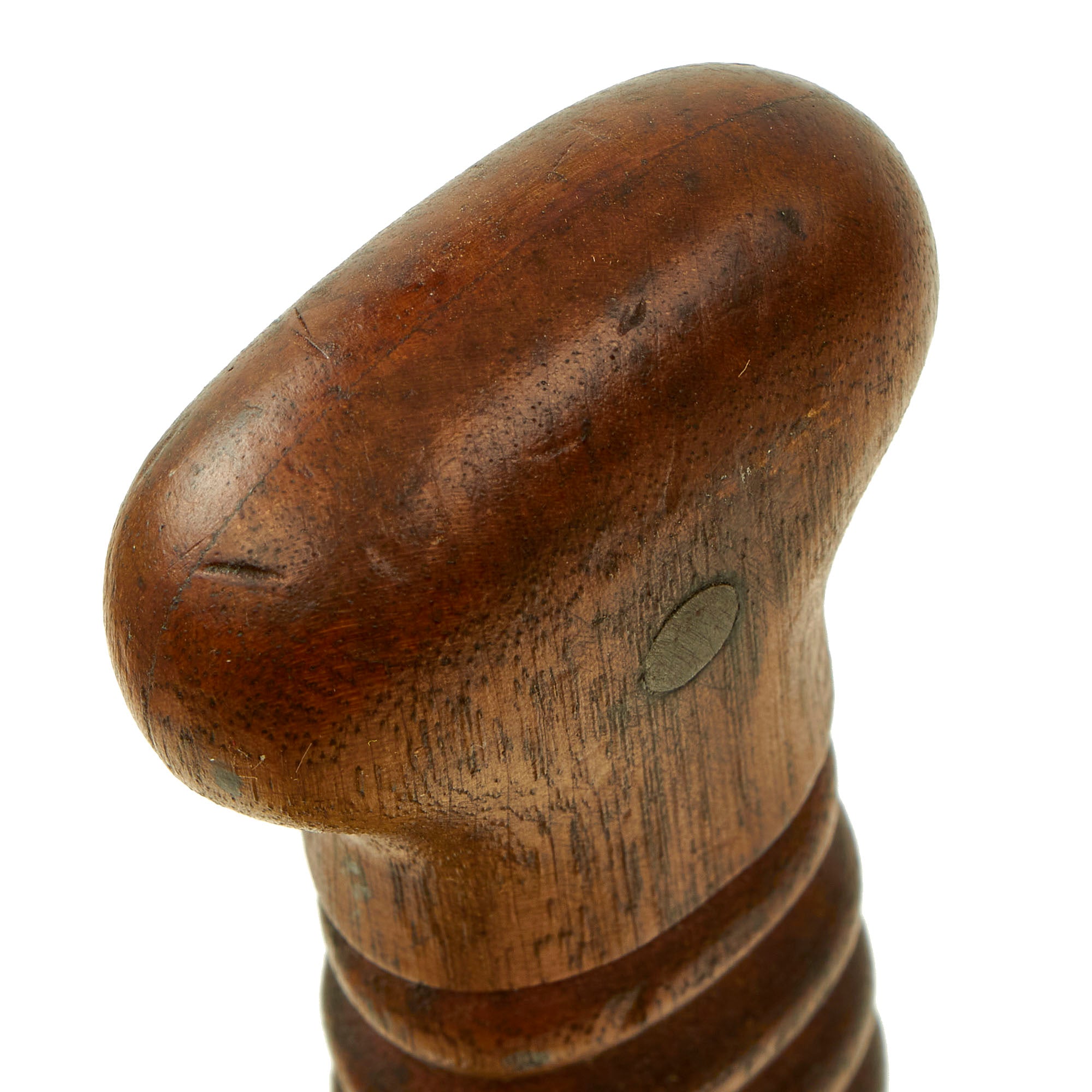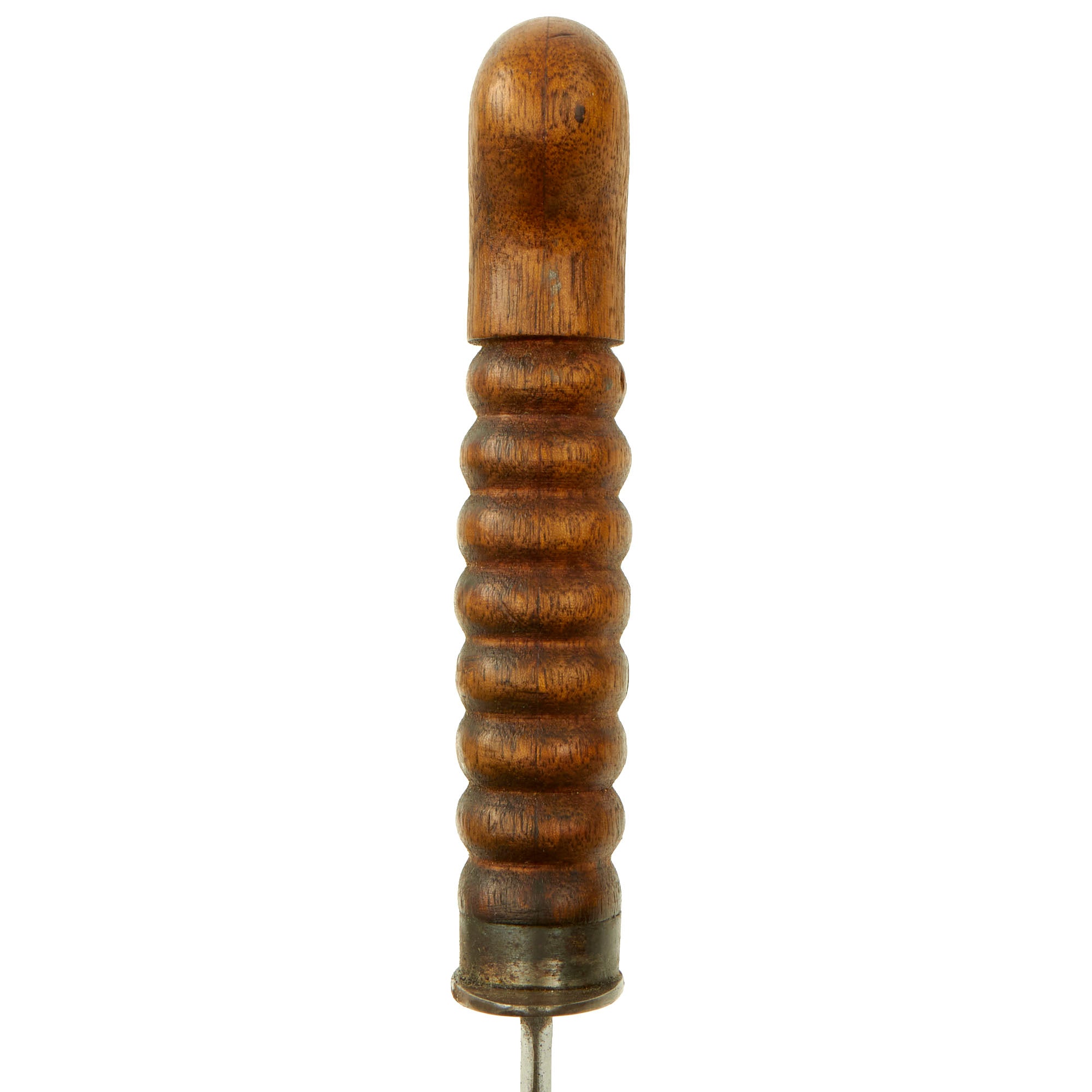 The knife, as originally produced, was manufactured with an 8" stiletto blade and had an overall length of about 13 1/4". The blade was heat blued and examples with large amounts of their original blade finish are truly striking. The solid wooden handle was oval in cross section, with eight grasping grooves to enhance the grip of the knife. The grip was otherwise smooth, with a bulbous pommel cap area. The blade was secured to the solid wood handle with a pair of rivets that were approximately 1/4" in diameter. A 3/16" wide metal ferrule reinforced the front section of the handle, butting up against an oval cross guard that was approximately 2 1/8" x 15/16". The ferrule and cross guard were heat blued as well.