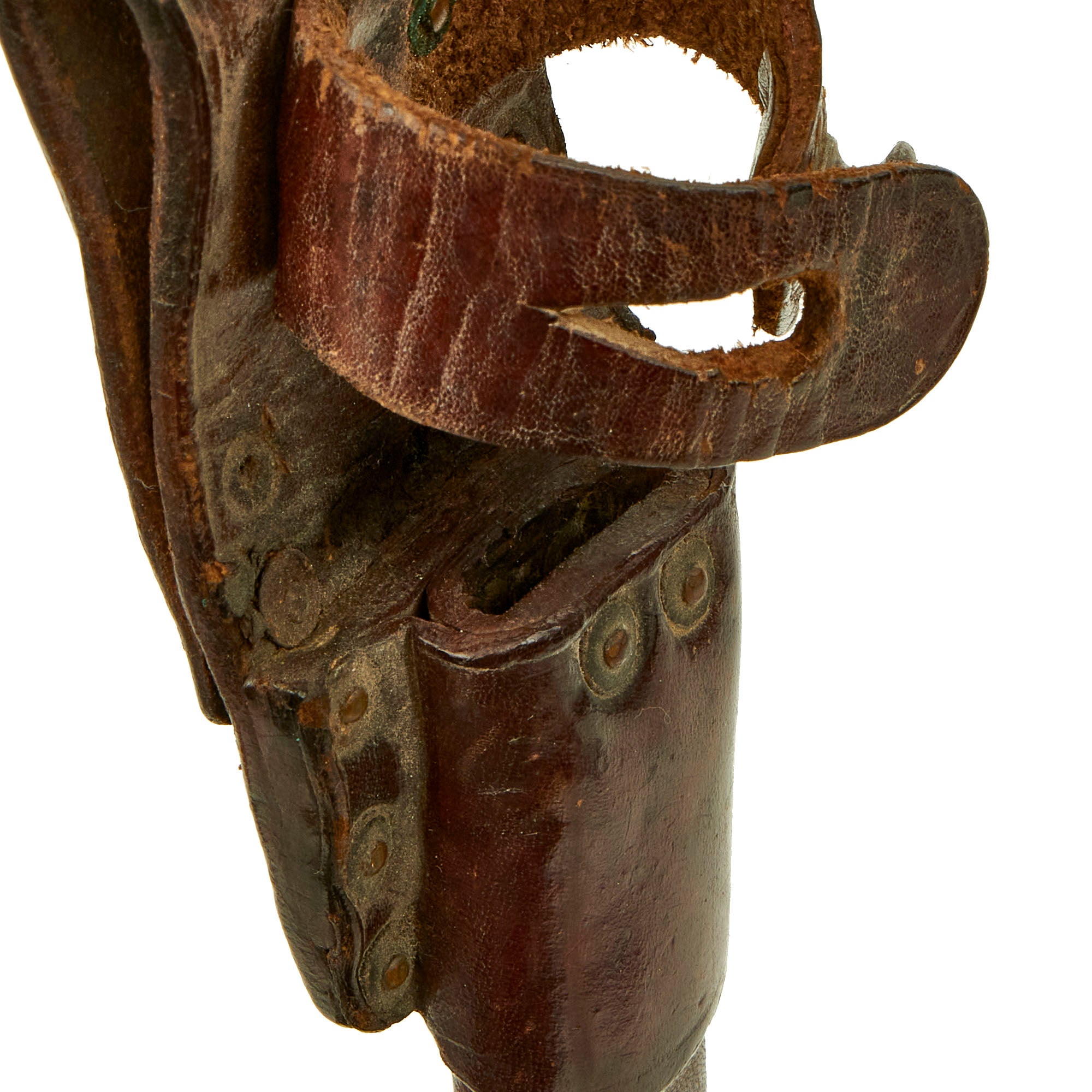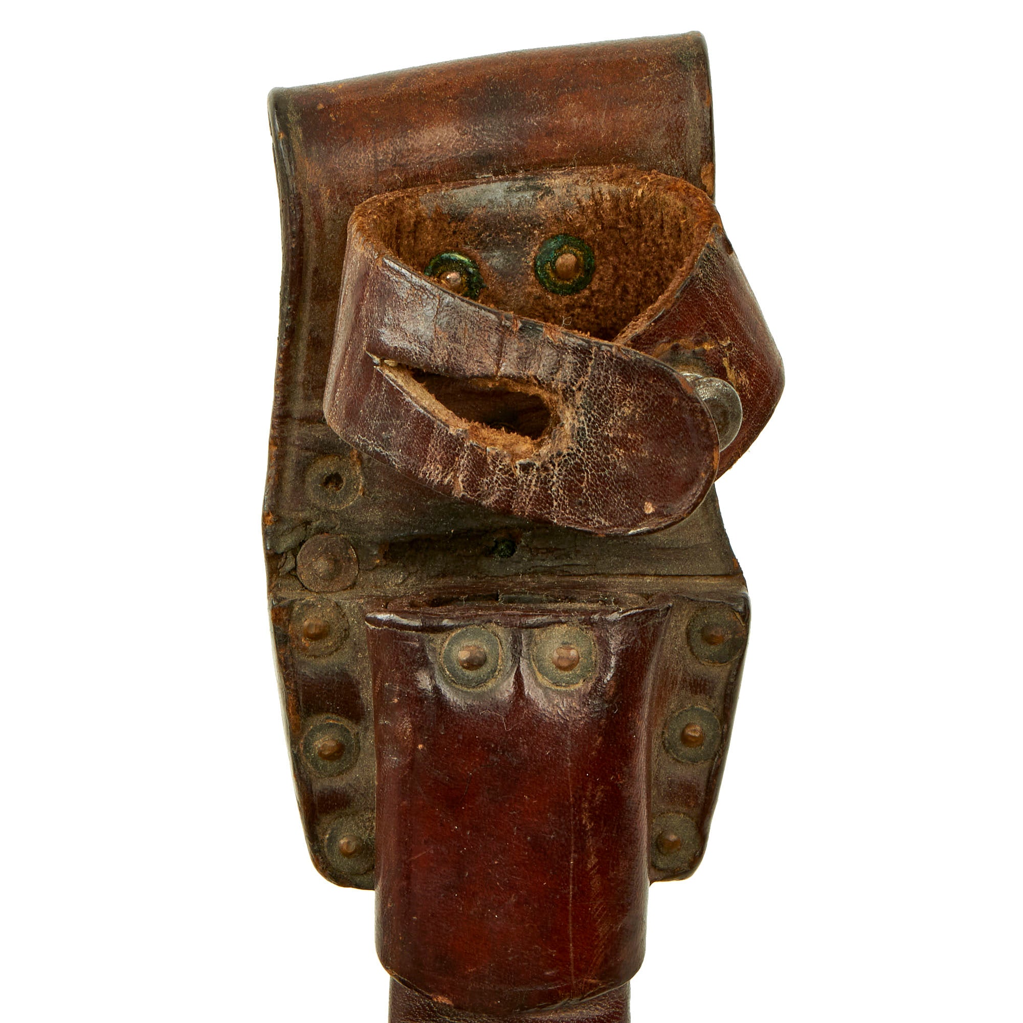 The leather covered metal scabbard is in very nice condition. The rear of the leather frog is marked with the serial number 3723 / G. The scabbard shows only some minor finish loss and light scuffing, all of which are the result of use in the field. The end of the front of the scabbard is stamped with what appears to read WW. The riveted leather frog is in FINE condition as well, and is securely attached. All of the original rivets are in place. The frog remains strong and supple and quite usable today. The original leather hilt-retaining strap is in place, along with the metal closure stud. As would be expected, the strap shows some moderate wear, crazing and light finish loss due to use. The strap still closes securely and retains the hilt as it should.