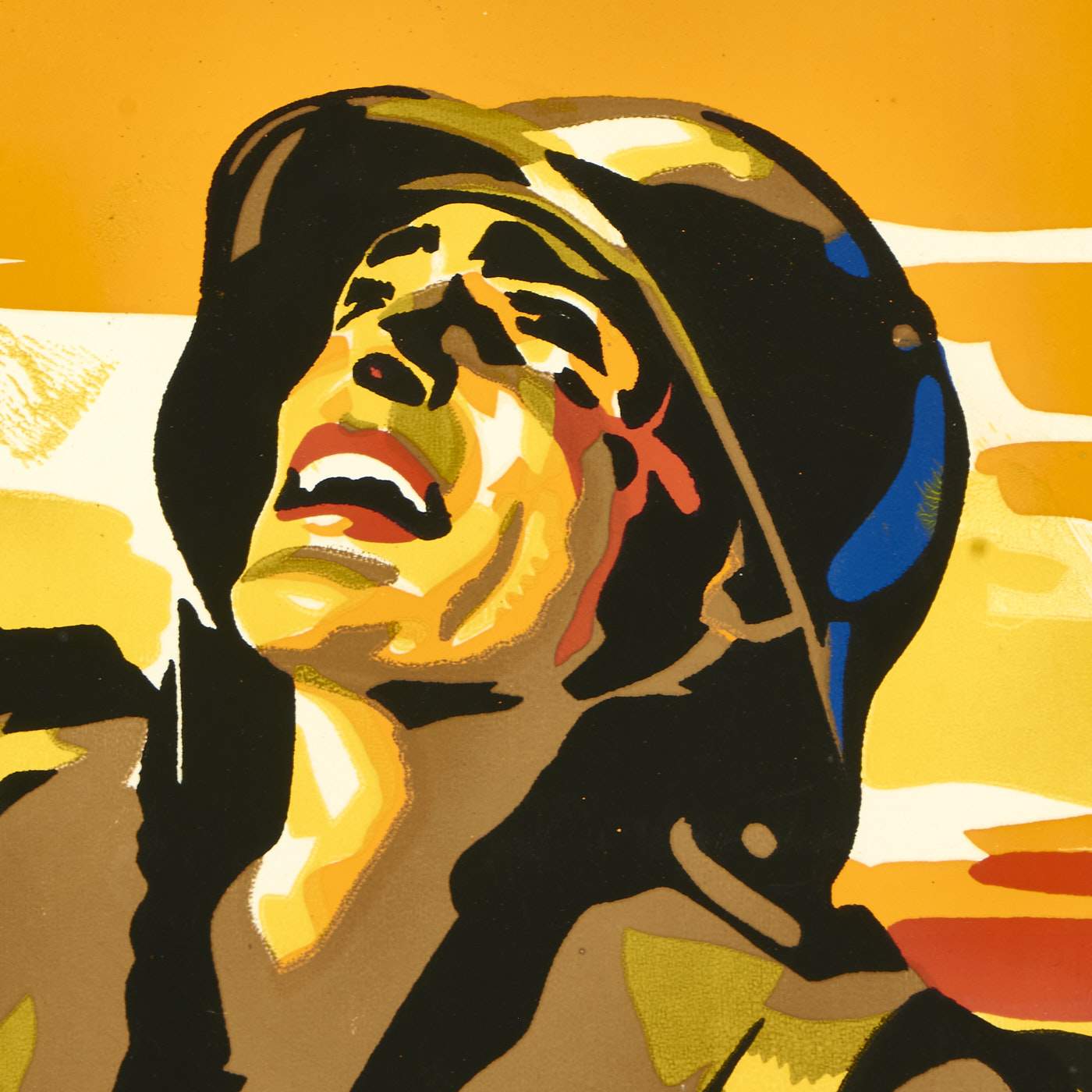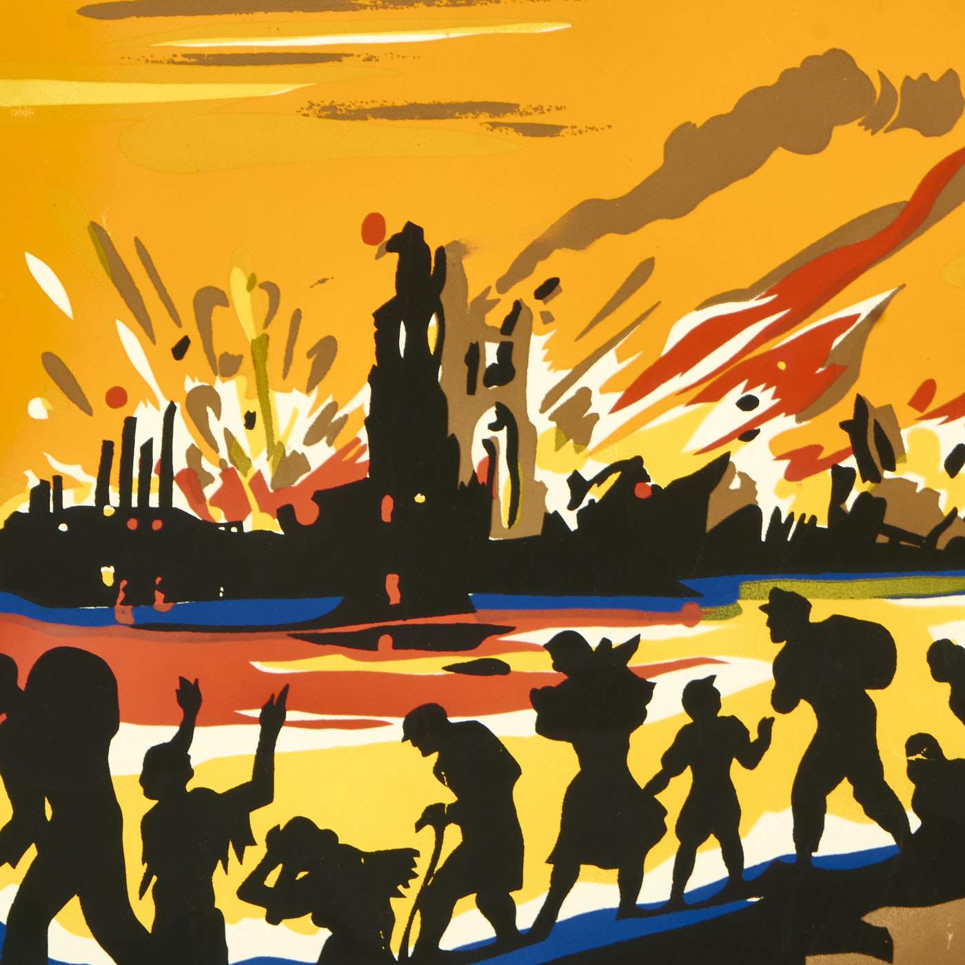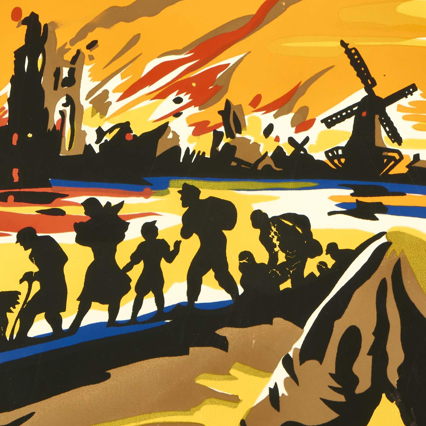 Holland the Home of a Free People, the 1940s Dutch World War II (WWII) war poster ("No Surrender!") featuring art of a soldier with a Dutch flag tied to his rifle while people flee a burning town in the background. Has incredible coloring, with deep orange background (color of the Dutch state) and vibrant colors of the burning in city on the horizon. This poster was printed to help raise funds by Dutch expatriates located overseas in order to provide foreign aid for the Dutch war effort.