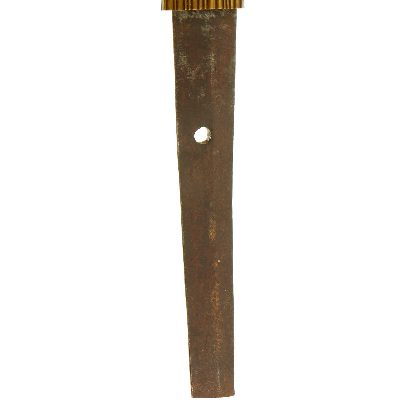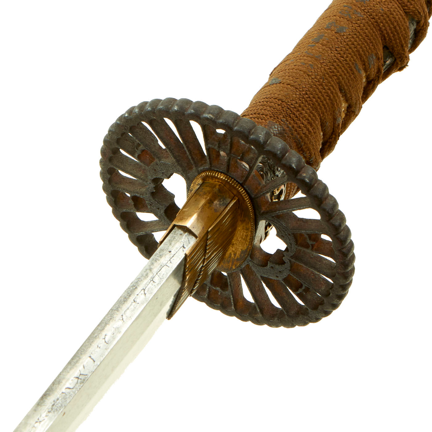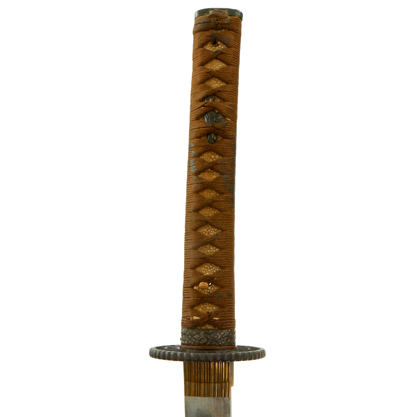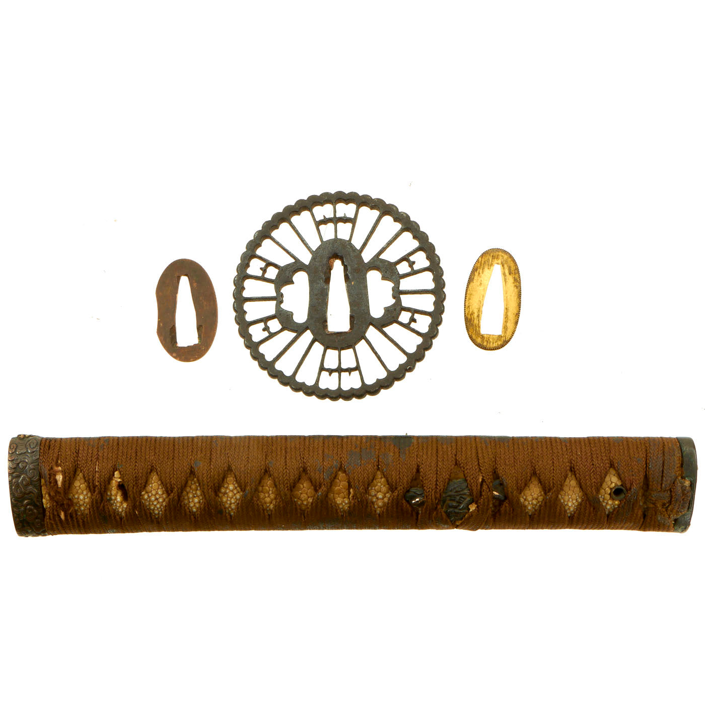 The tsuba (cross guard) is made of iron and is of the Maru Gata (round) shape, and is highly perforated with a ribbed outercircumference. There are two Hitsu-Ana accessory cutouts in the tsuba for the kogai (hair ornament) and kogatana (companion knife", though there are none included. There are two seppa (spacers) around the tsuba. The fuchi (collar) for the tsuka (handle) is embossed bronze, and looks to be a "cloud" design, and there is a bronze Kashira (End Cap) on the bottom, which has some embossed and gilt designs. There are two bronze menuki grip ornaments present, which are an intricate design that we cannot identify. The stingray (Sa-Me) grip is in very good condition, and the brown grip wrapping (Ito) shows light wear and staining, so it was most likely re-wrapped in the late 19th century, and possibly other times.