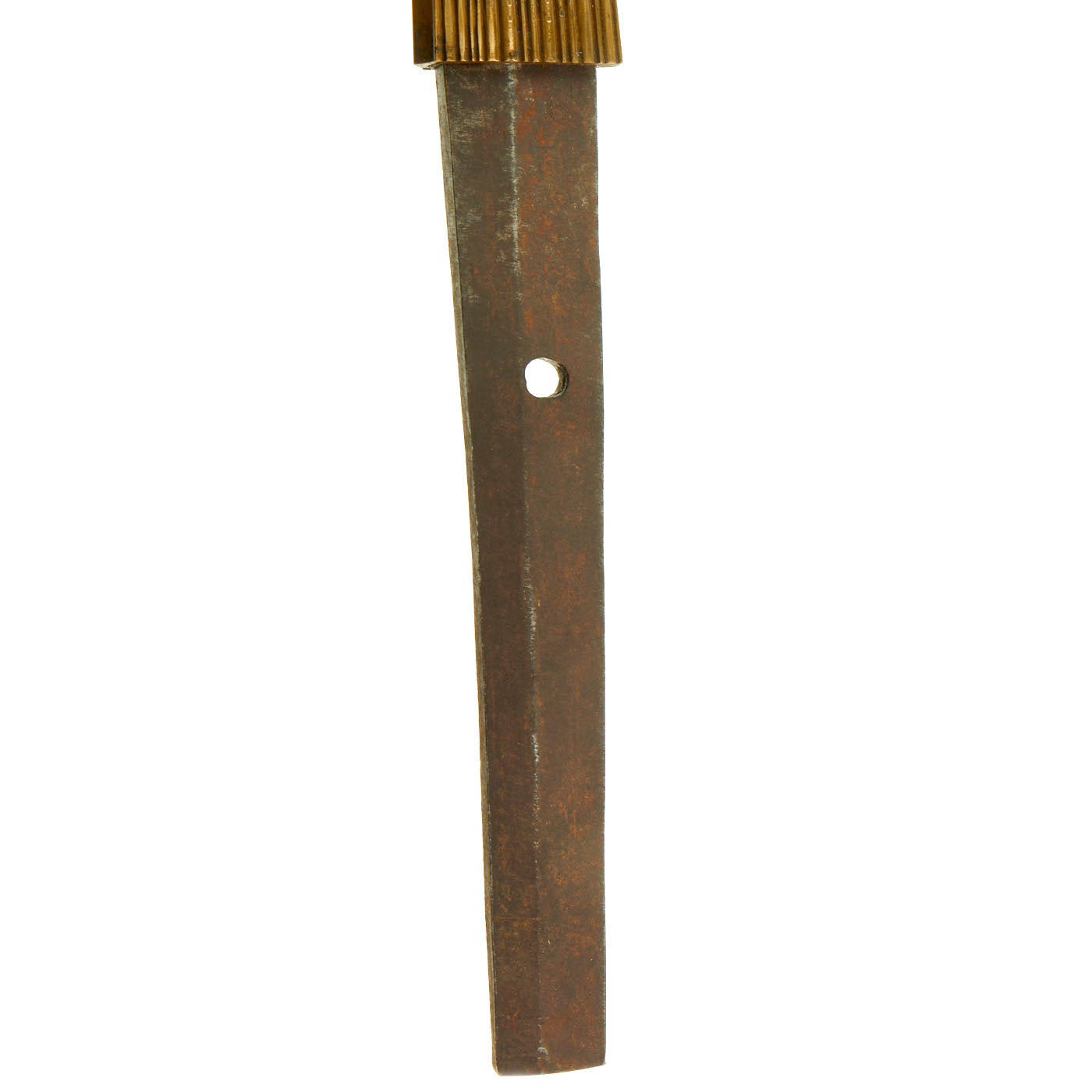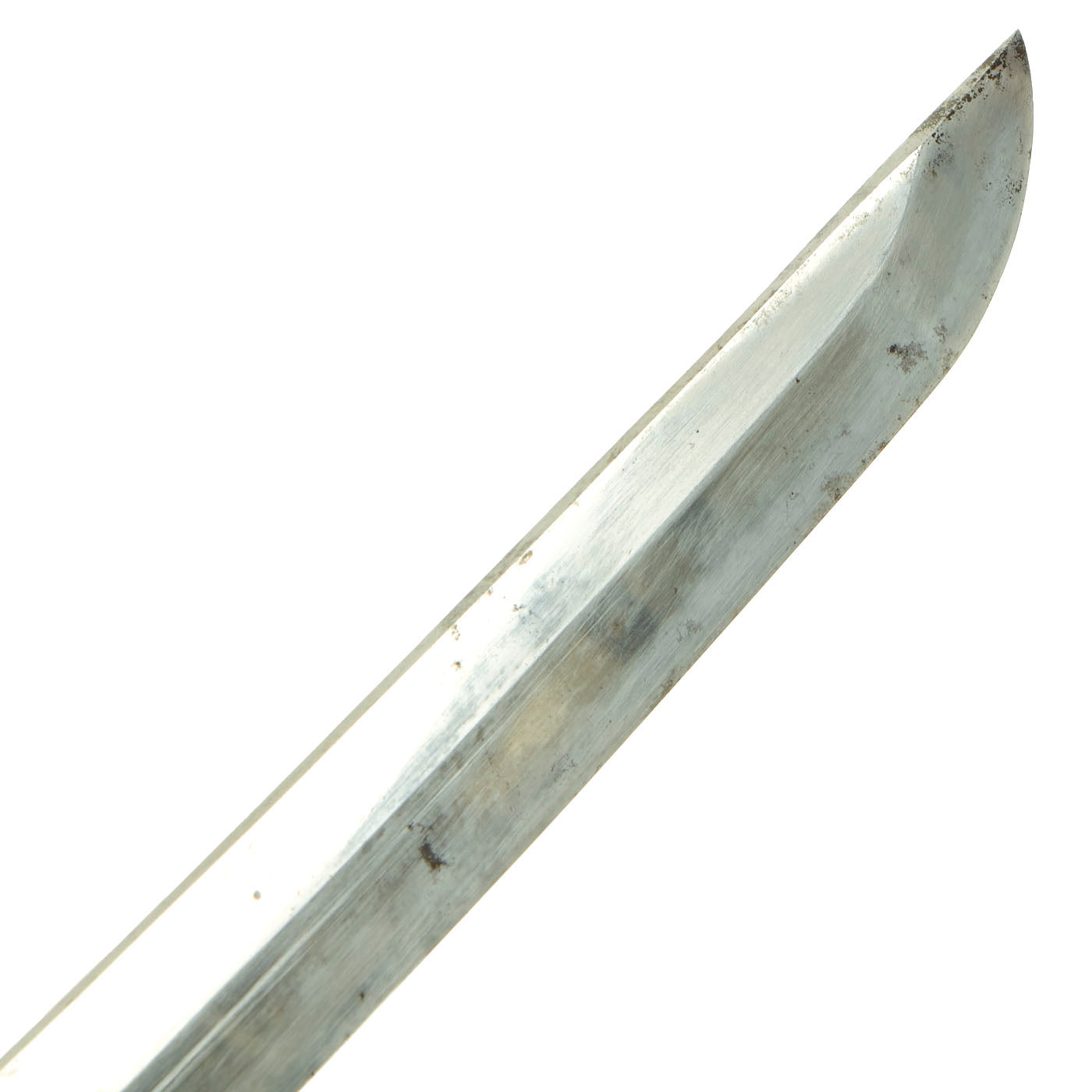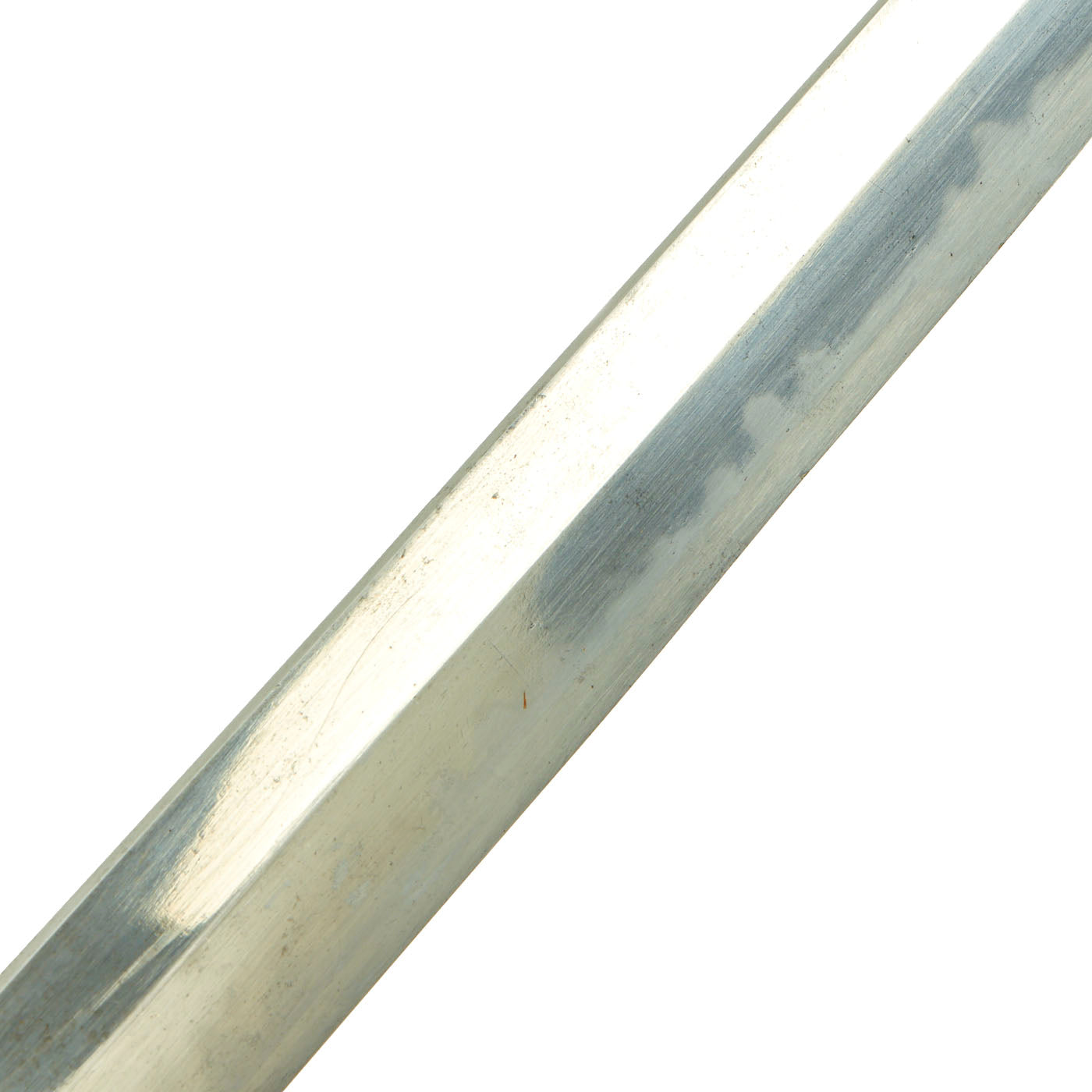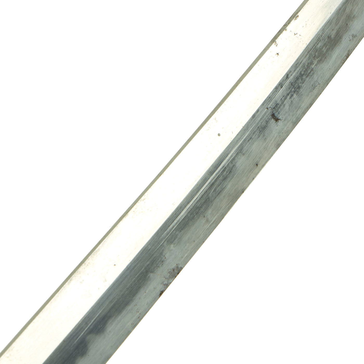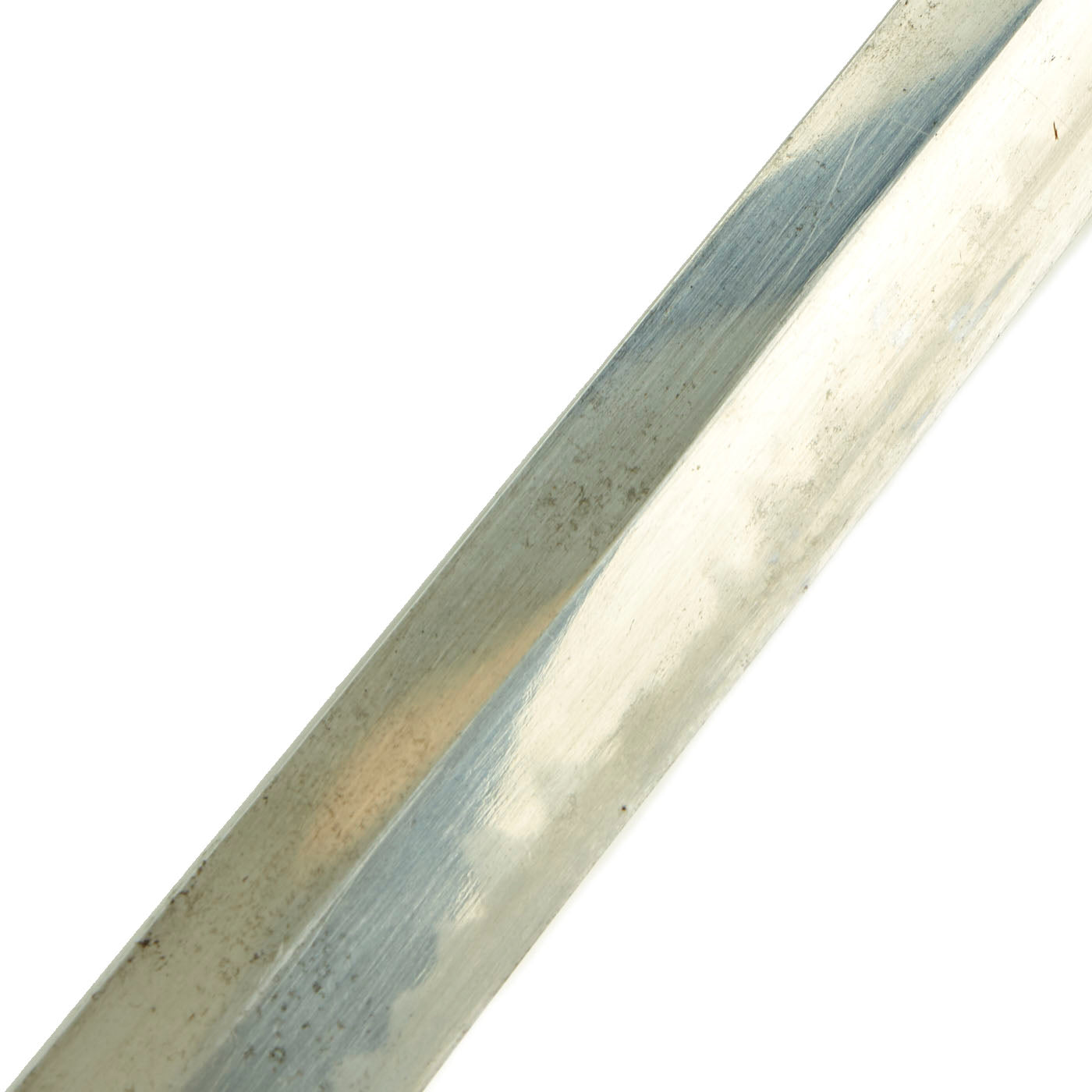 The blade of this example is 28 3/8 inches long, and the polish on the blade is unfortunately degraded, with some small areas of light oxidation and staining. This has made seeing aspects of the blade difficult, and it has definitely been some time since the last time it was fully polished. The edge does not have any major nicks or dents, and is still relatively sharp, so care should be taken. The tang (nakago) is of the futsu 普通 (regular) style, with a KIRI (cut) nakago-jiri (tang tip). It does not however look to have been cut down, so that may be how it was originally cut after forging.