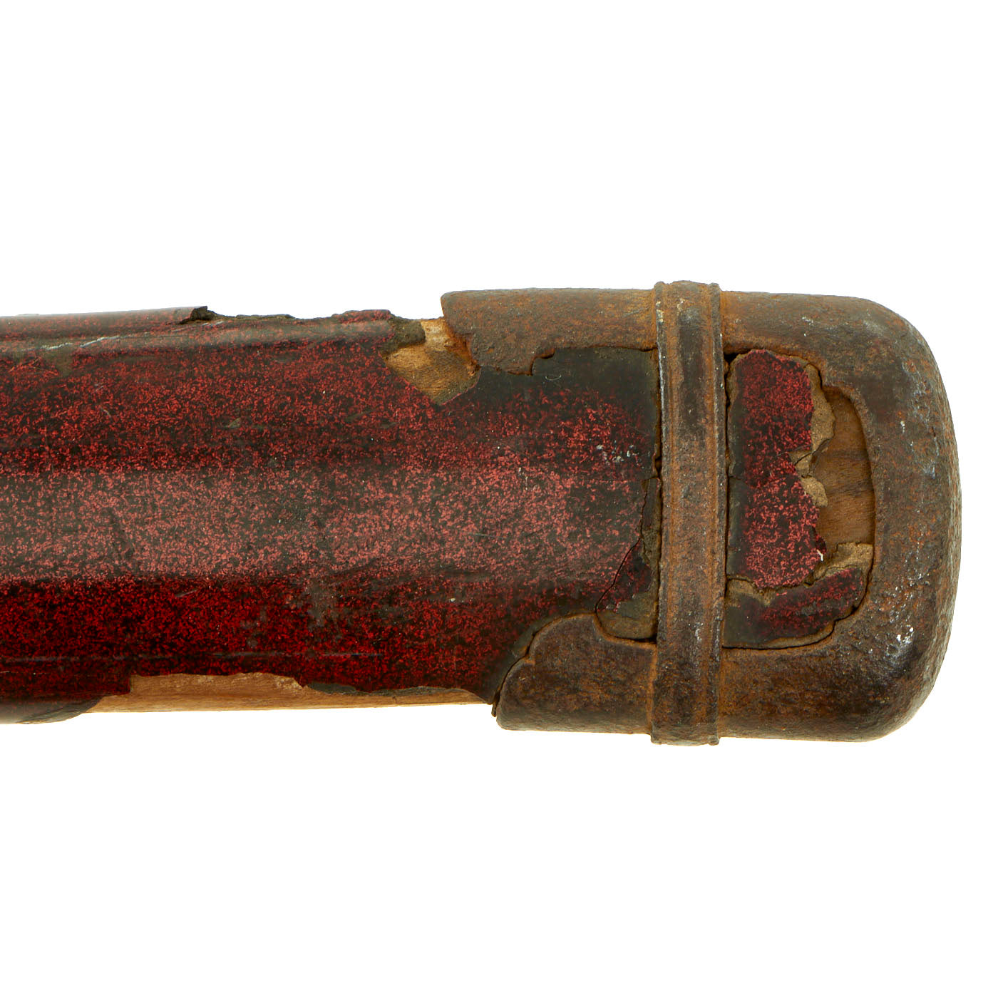The sword comes in a a well fitting wooden scabbard (saya), which has a very attractive red speckled black lacquer paint job. There are also three angled grooves in the body, which are gold highlighted, and a very nice iron end fitting (sayajiri), which shows oxidation. The scabbard is in very good condition, and definitely looks to be of great age. There is some splitting along the seams, and the lacquer has chipped away in those areas. The kurikata (knob) where a cord might be attached is missing, and it looks like there was a one time a koiguchi (scabbard mouth) fitting, which is now missing.