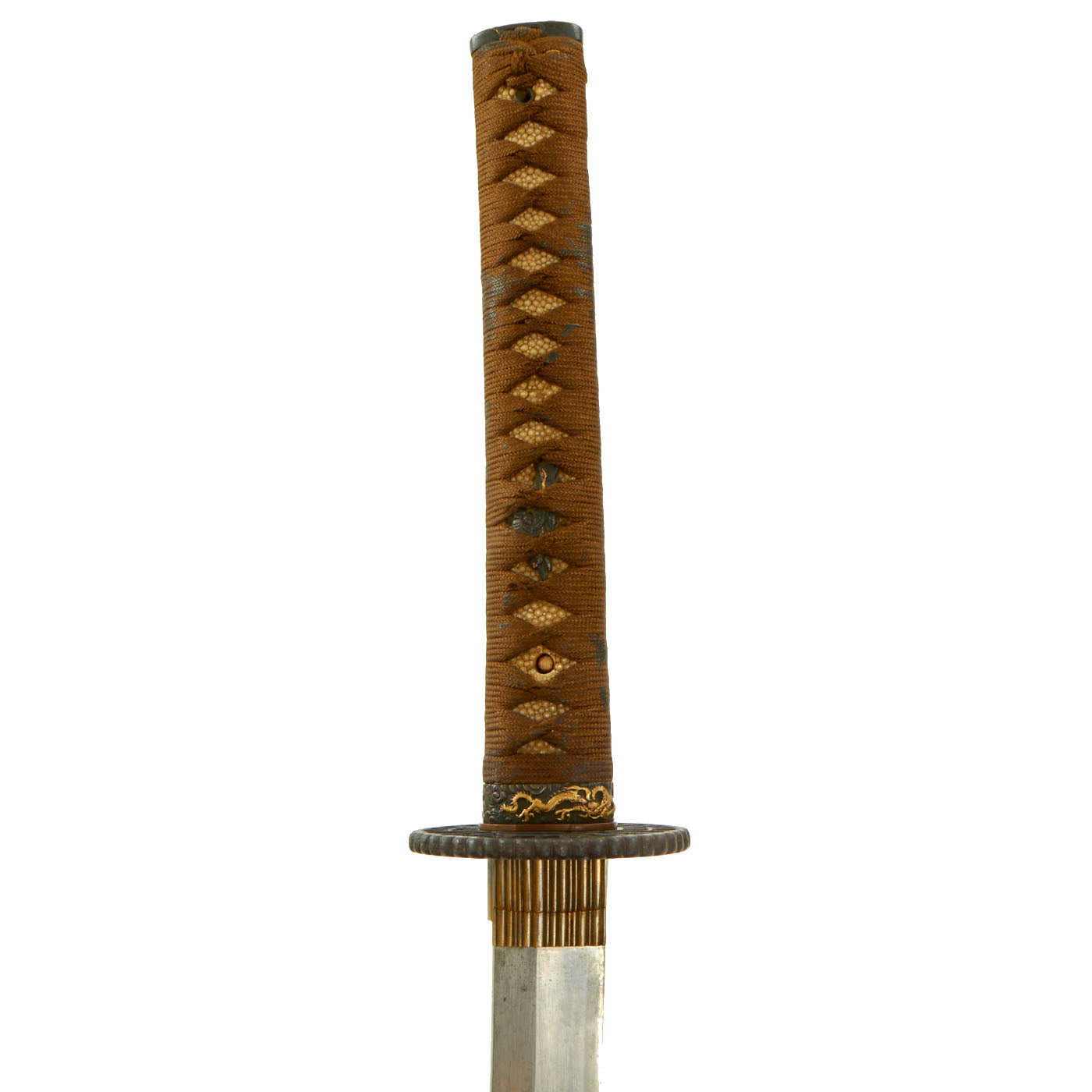 This example dates from the early Edo period (江戸時代, Edo jidai) or Tokugawa period (徳川時代, Tokugawa jidai) of Japanese history. This is the period between 1603 and 1867, when Japan was under the rule of the Tokugawa shogunate and the country's 300 regional daimyo. It is around the middle of the blade length range, and has a "Shinogi Zukuri" shape, the standard for the Katana.