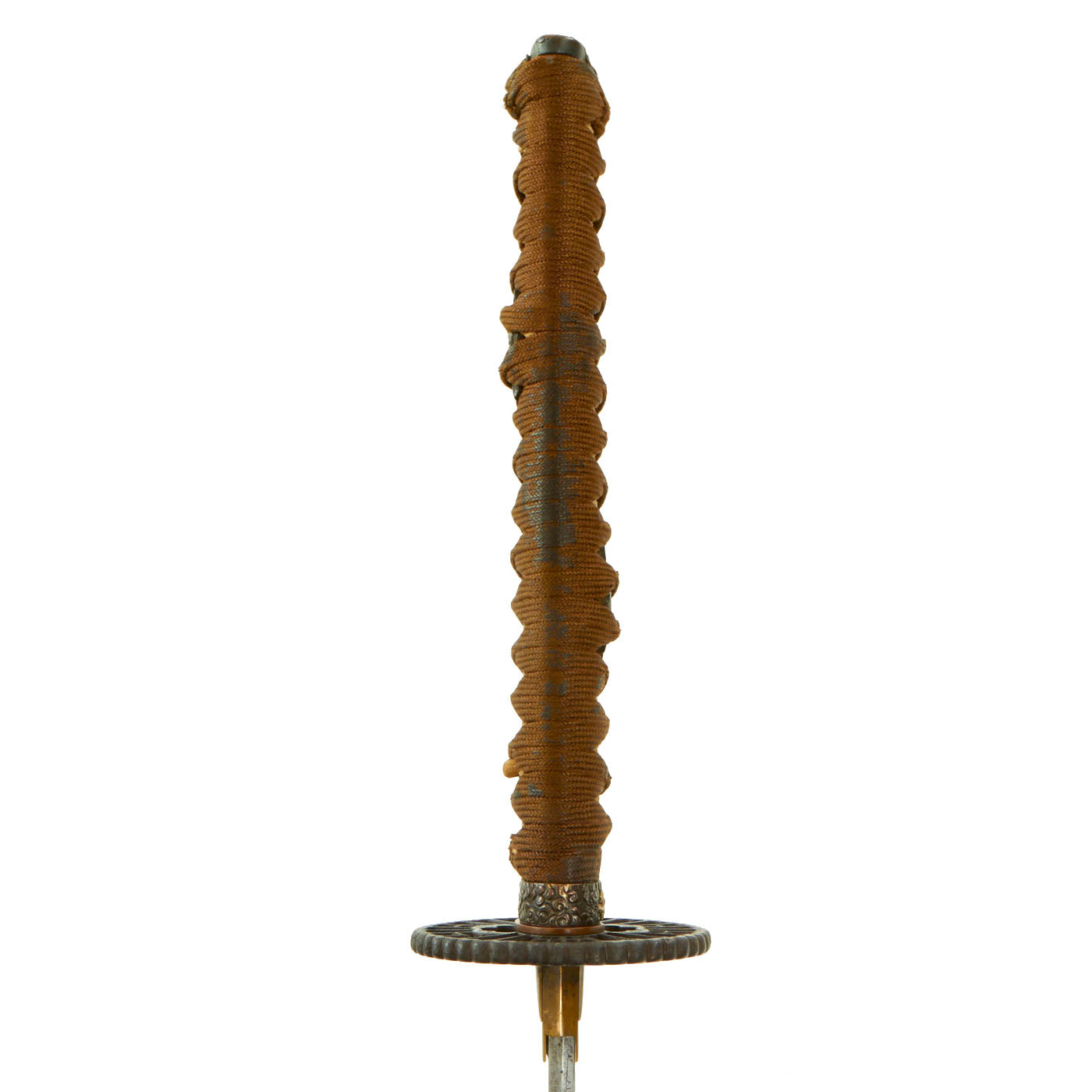 - Blade wounds (kizu) or lamination artifacts are present on the blade. Both ware (lamination lines) and fukure (carbon pits) are visible.