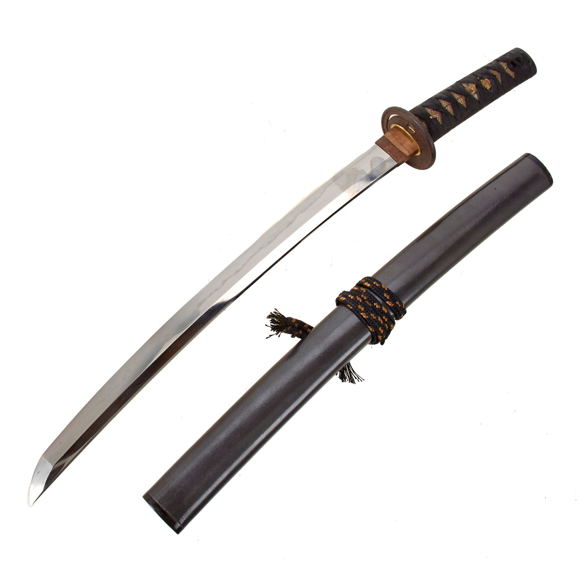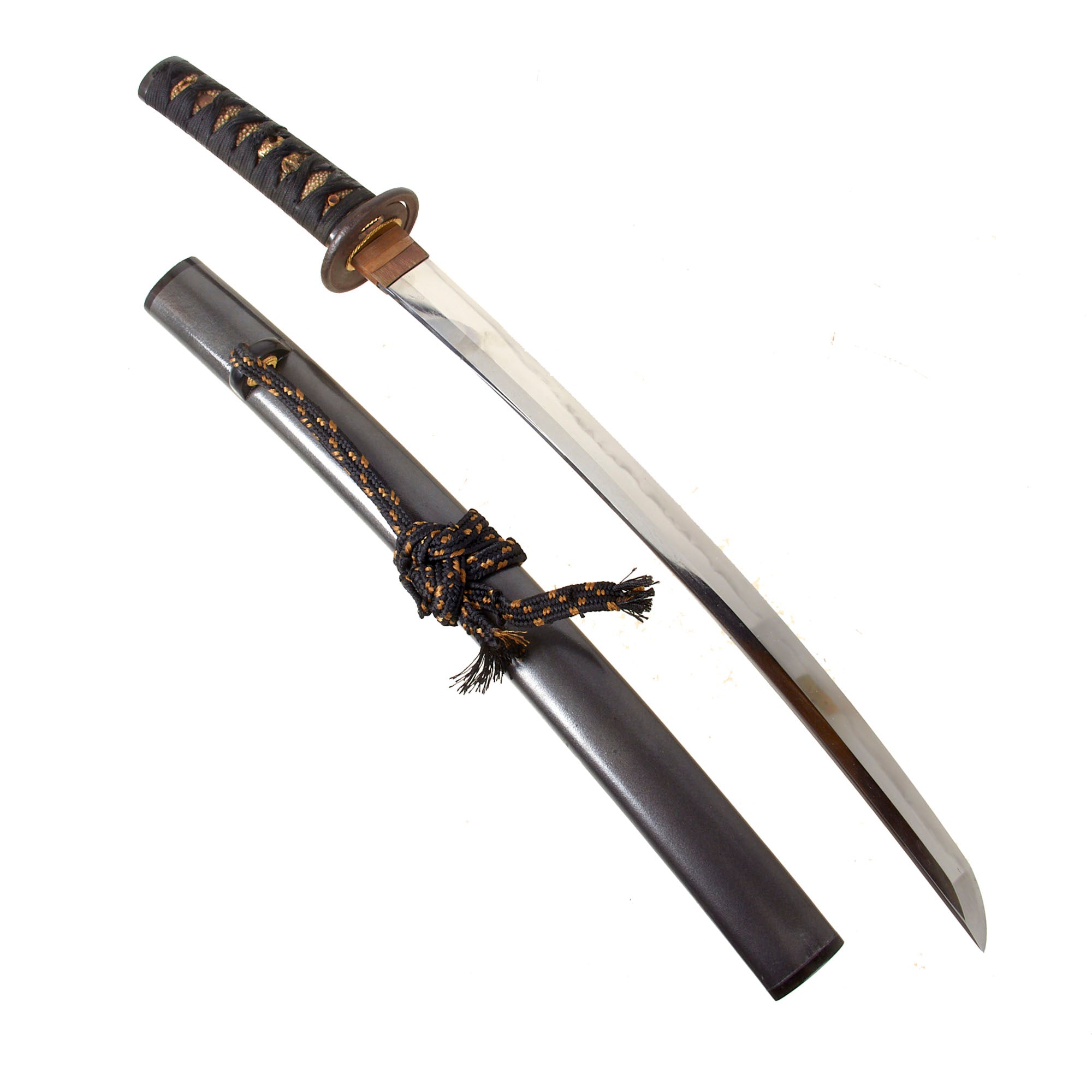 Blade length is approximately 17 inches and overall length 24 ⅛ inches. This classifies the sword as a wakizashi (Japanese: 脇差, "side inserted [sword]"), which is a shorter version of the Katana, with a blade length between 12 and 24 in. Katanas must be longer than 2 shaku (Japanese: 尺), which is approximately 12 inches in length. It has a futsu 普通 (regular) Nakago with an Haagari (asymmetrically rounded) nakago-jiri (tang tip). The blade shape is SHINOGI-ZUKURI (鎬造), meaning the blade has a “SHINOGI” or blade ridge. This is the "standard" shape for most Katana and longer wakizashi.