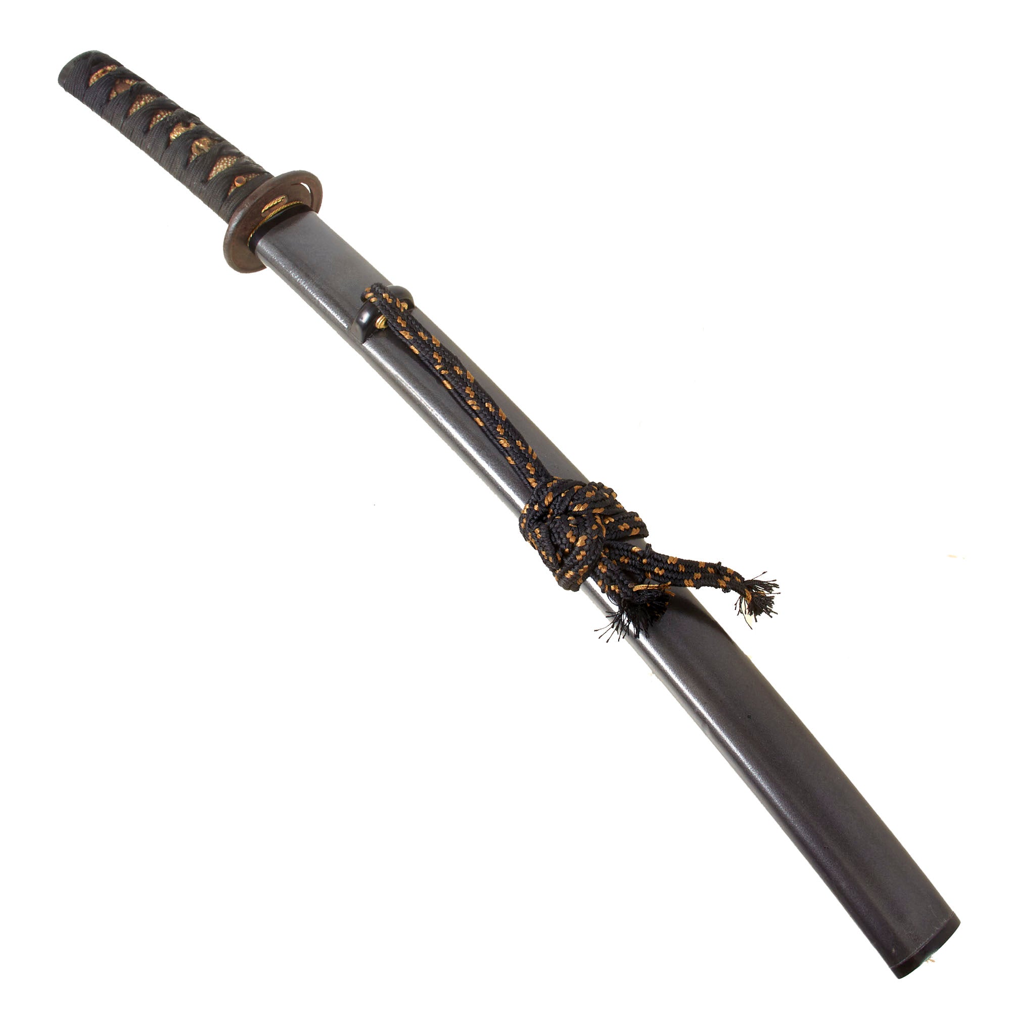 The sword comes well-fitting wooden scabbard (saya), which is finished with metallic gray URUSHI lacquer, and it looks to be a mid-late 20th century example, custom made to replace a scabbard that had degraded past the point of restoration. The scabbard has a KURIKATA sword knob with a SHITODOME fitting inside, and is alco fitted with a black SAGEO sword cord with gold highlights woven in. It is in excellent condition and fits the sword well.