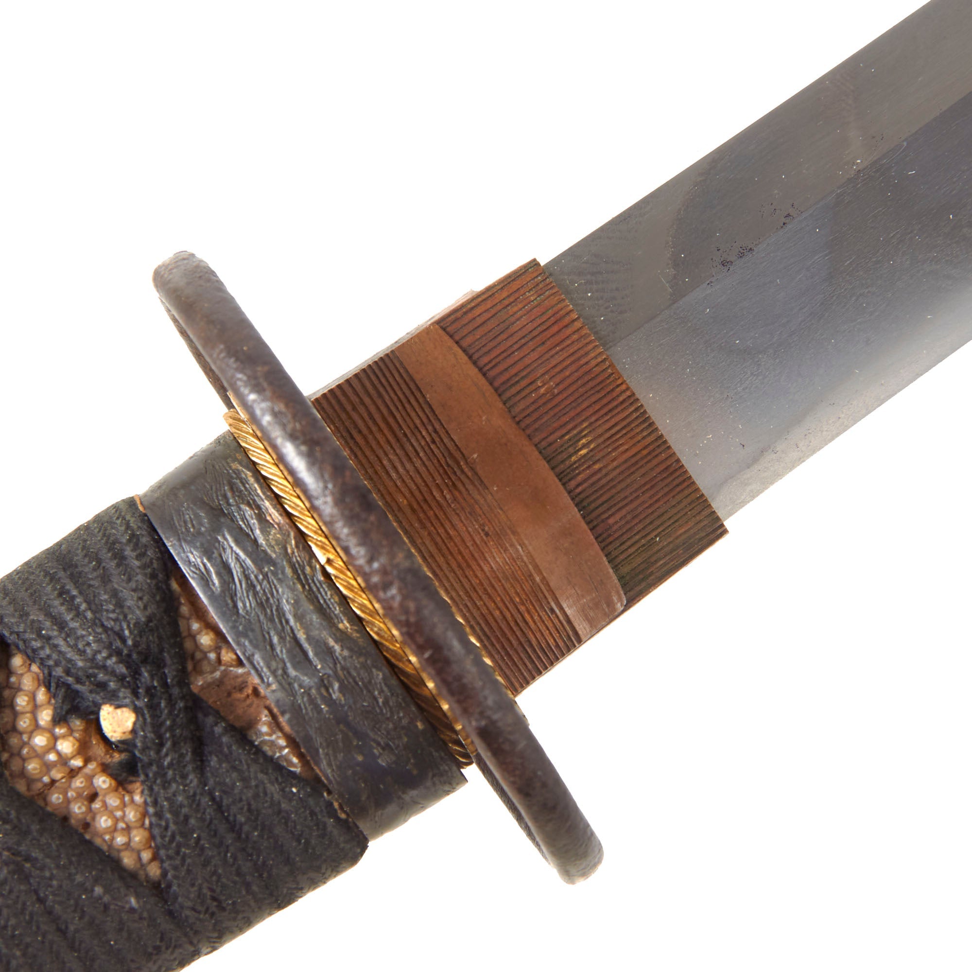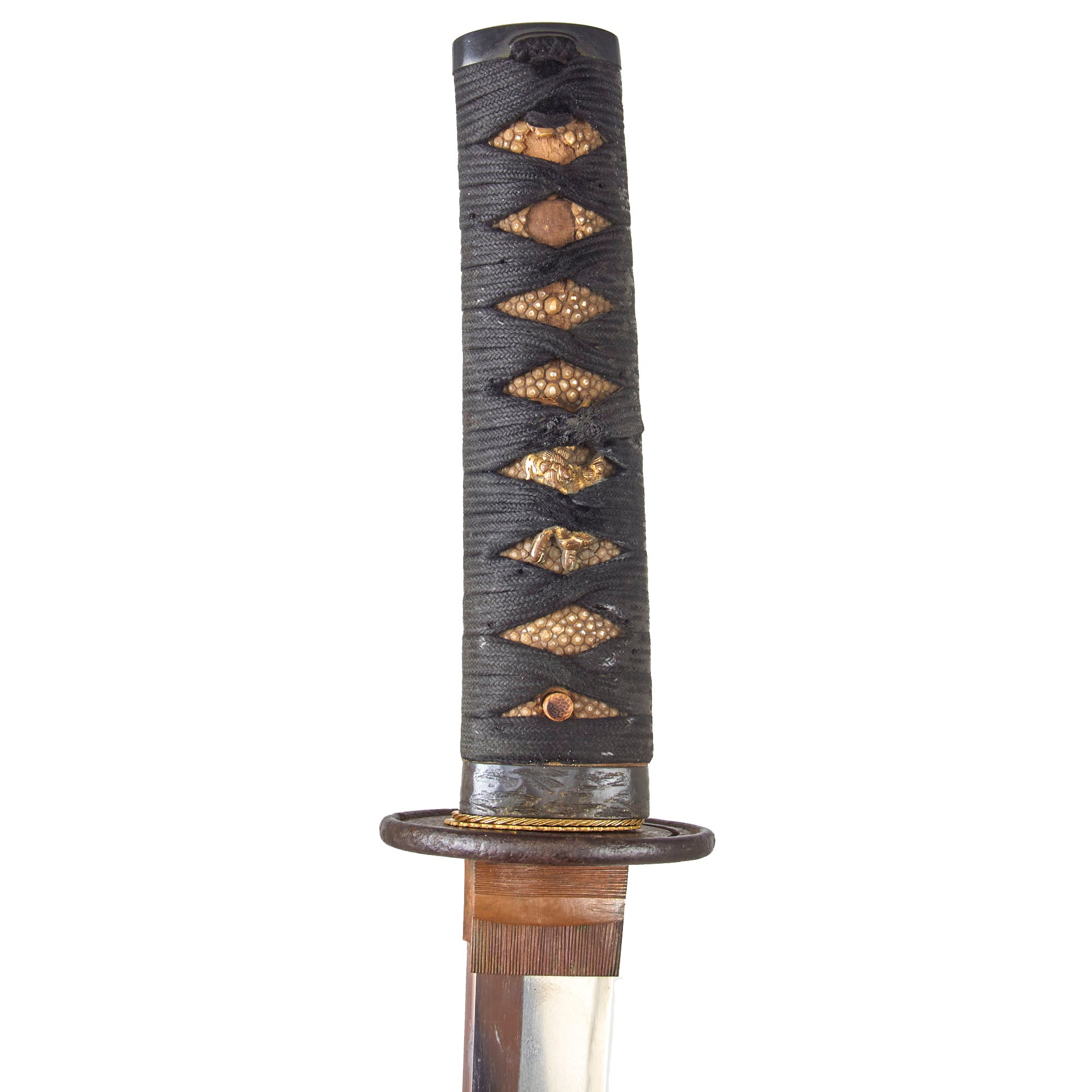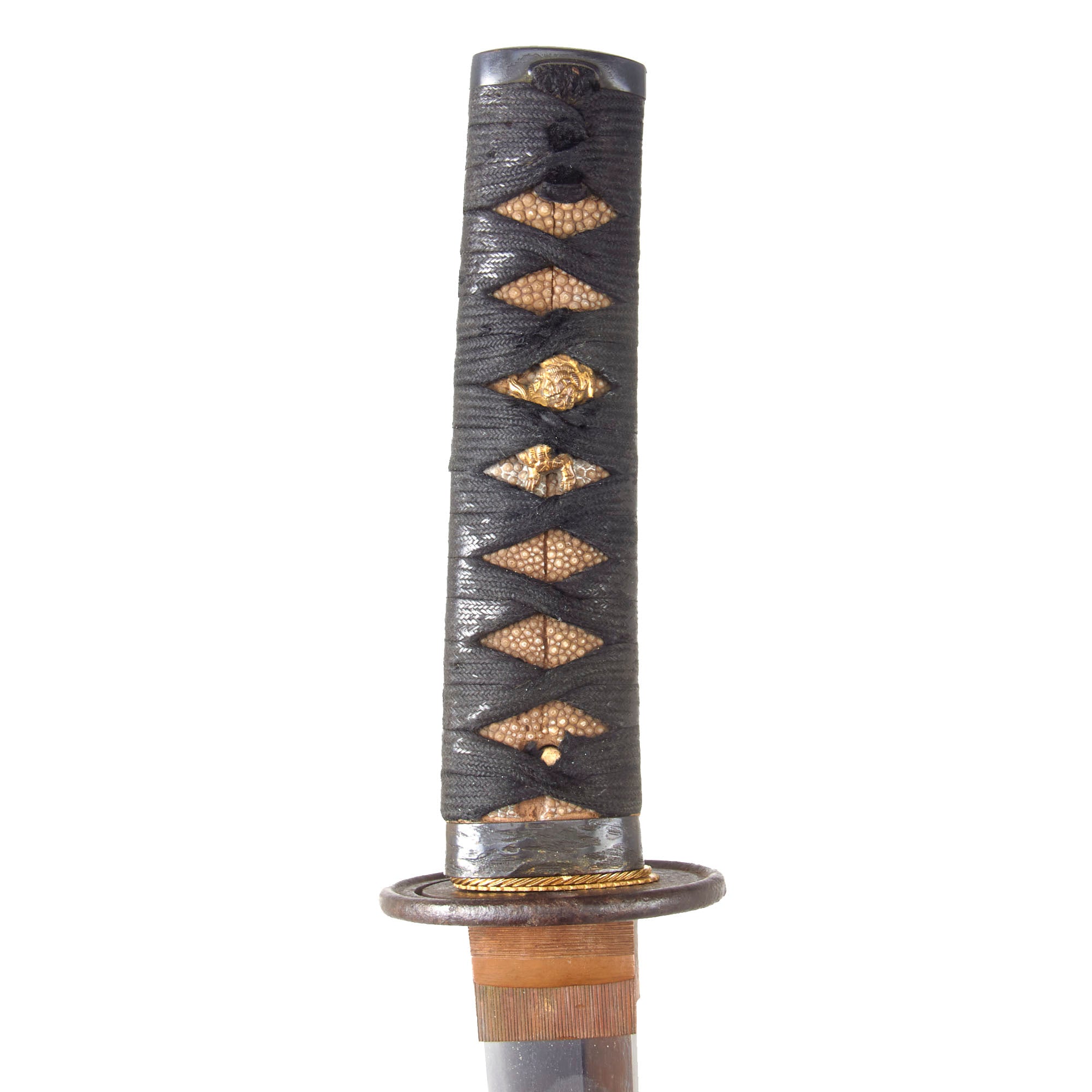 The fuchi (collar) for the tsuka (handle) is made from blacked copper, and has some textured designs, while the kashira (end cap) is made from the same material, but is relatively plain. There are two gold highlighted brass menuki grip ornaments, which look to be some type of animal like a wolf or dog. The stingray skin (Sa-Me) grip is in good shape, with some material missing from the grip on the "left" side. The black grip wrapping (Ito) shows some wear and staining from use as well as fraying. There is a single wooden securing peg (mekugi) still present which looks to be a recent replacement.