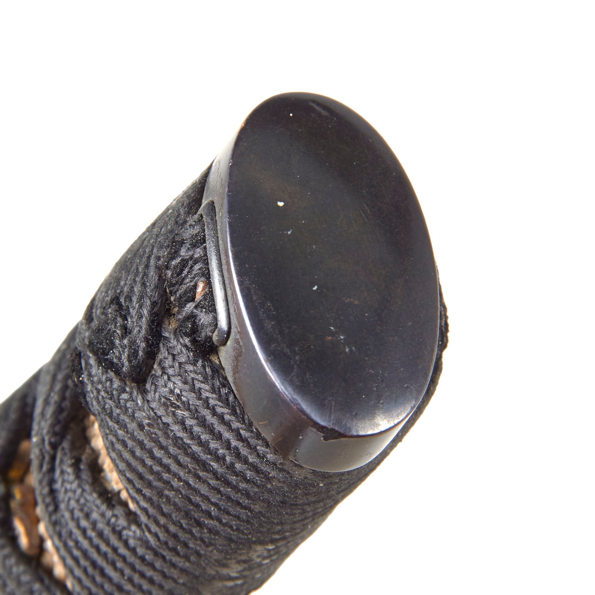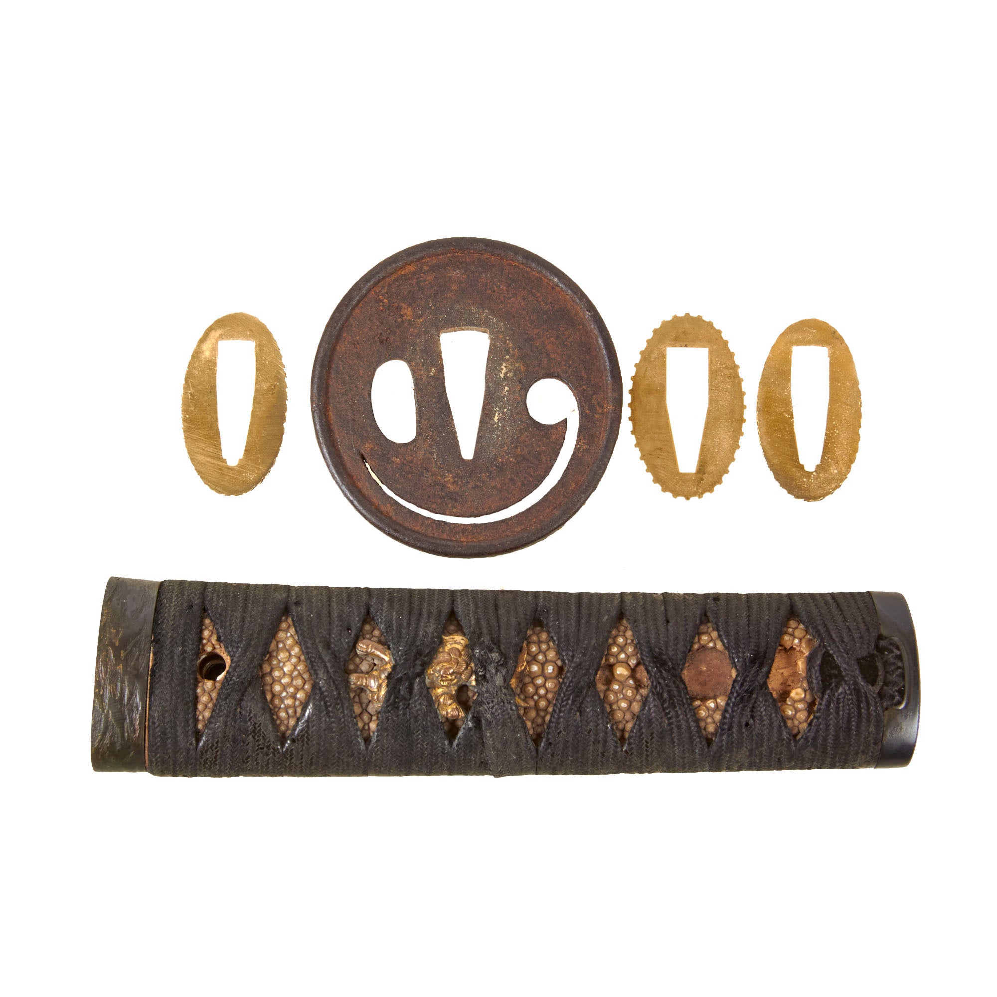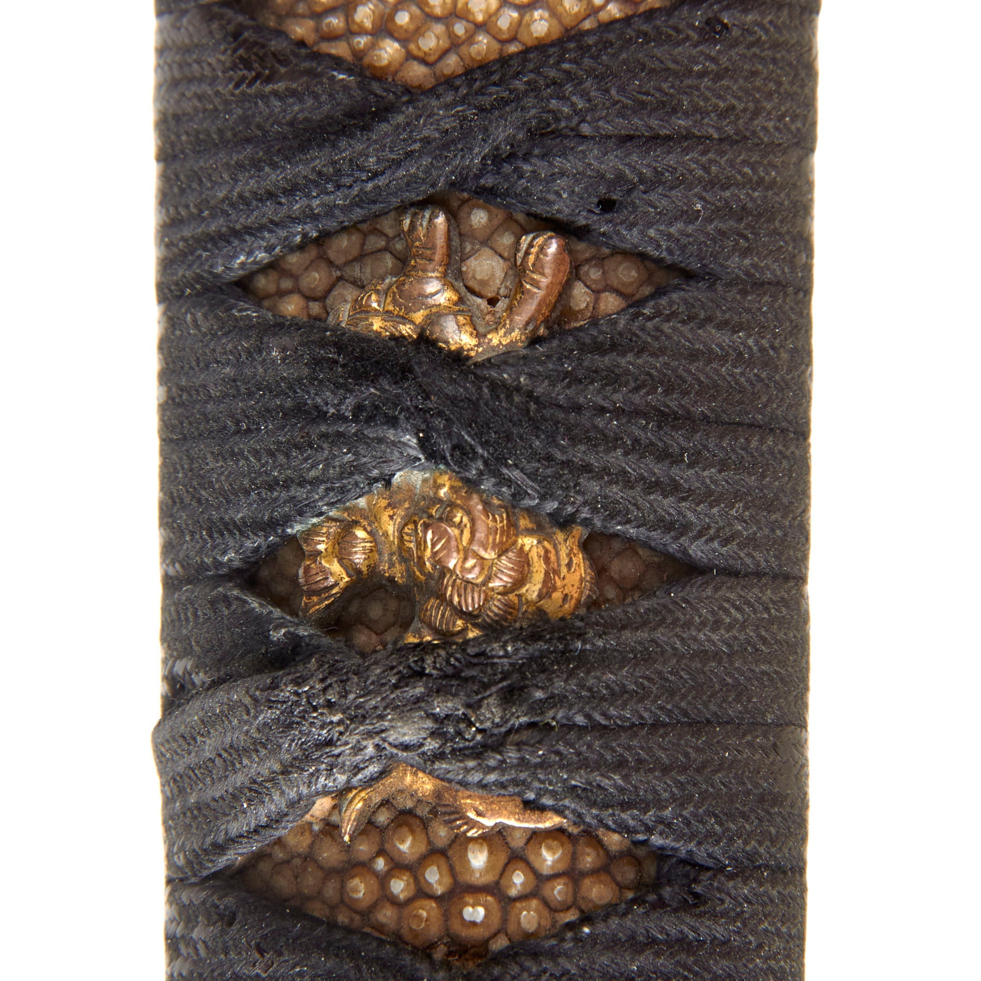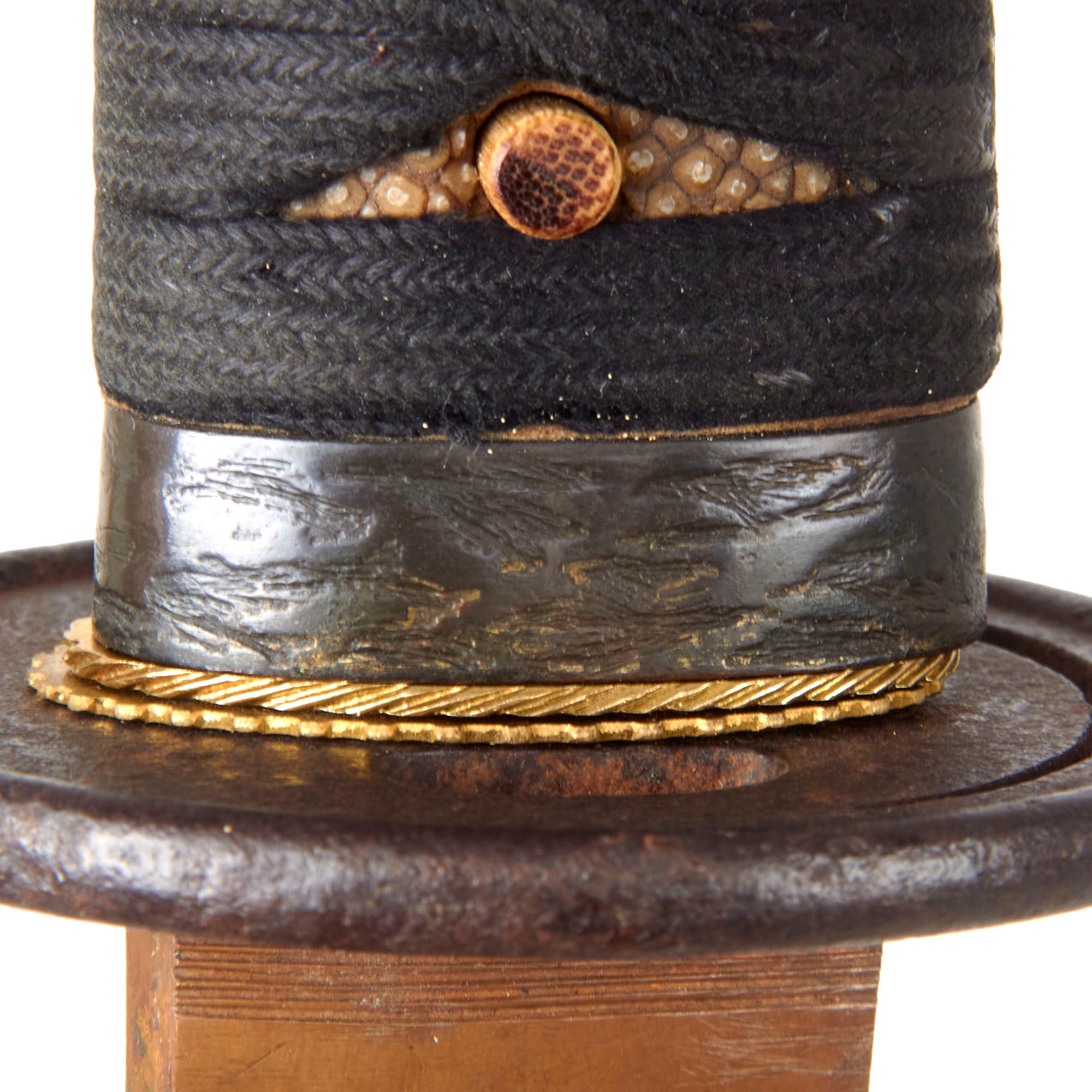 The fuchi (collar) for the tsuka (handle) is made from blacked copper, and has some textured designs, while the kashira (end cap) is made from the same material, but is relatively plain. There are two gold highlighted brass menuki grip ornaments, which look to be some type of animal like a wolf or dog. The stingray skin (Sa-Me) grip is in good shape, with some material missing from the grip on the "left" side. The black grip wrapping (Ito) shows some wear and staining from use as well as fraying. There is a single wooden securing peg (mekugi) still present which looks to be a recent replacement.