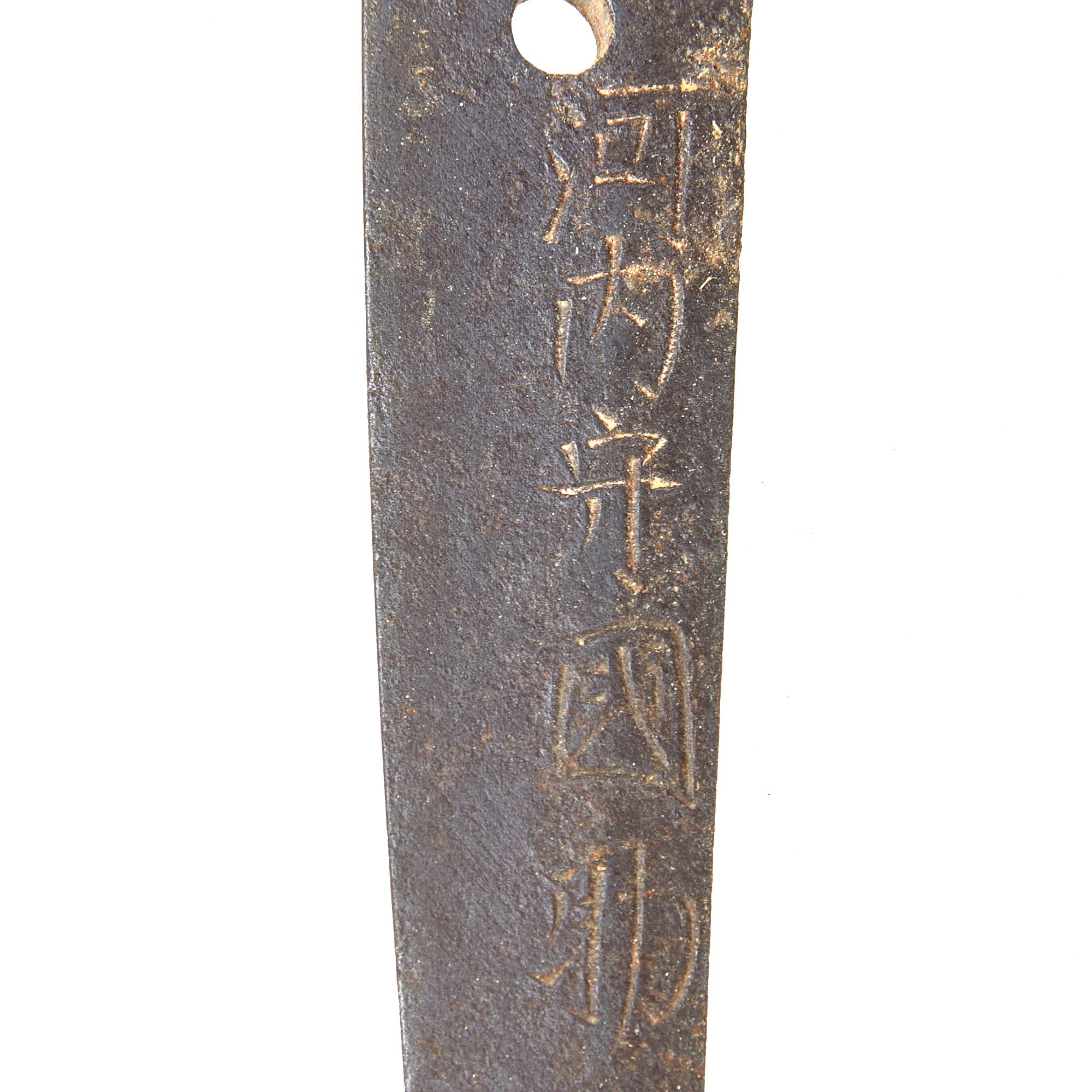 Age and wear have made the YASURIME (鑢目 - file marks) on the tang faint, and given it a lovely patina, with some areas of oxidation scaling. There still is some of the TAGANE-MAKURA (raised area around the mei) present, and the TAGANE (chisel marks) are quite faint, however the MEI signature is still relatively easy to read. As best we can tell it reads 河 内 守 國 助, read as KAWACHI NO KAMI KUNISUKE, indicating that the smith named “Kunisuke” made it. The characters before this are honorific titles bestowed for good work to the smith.