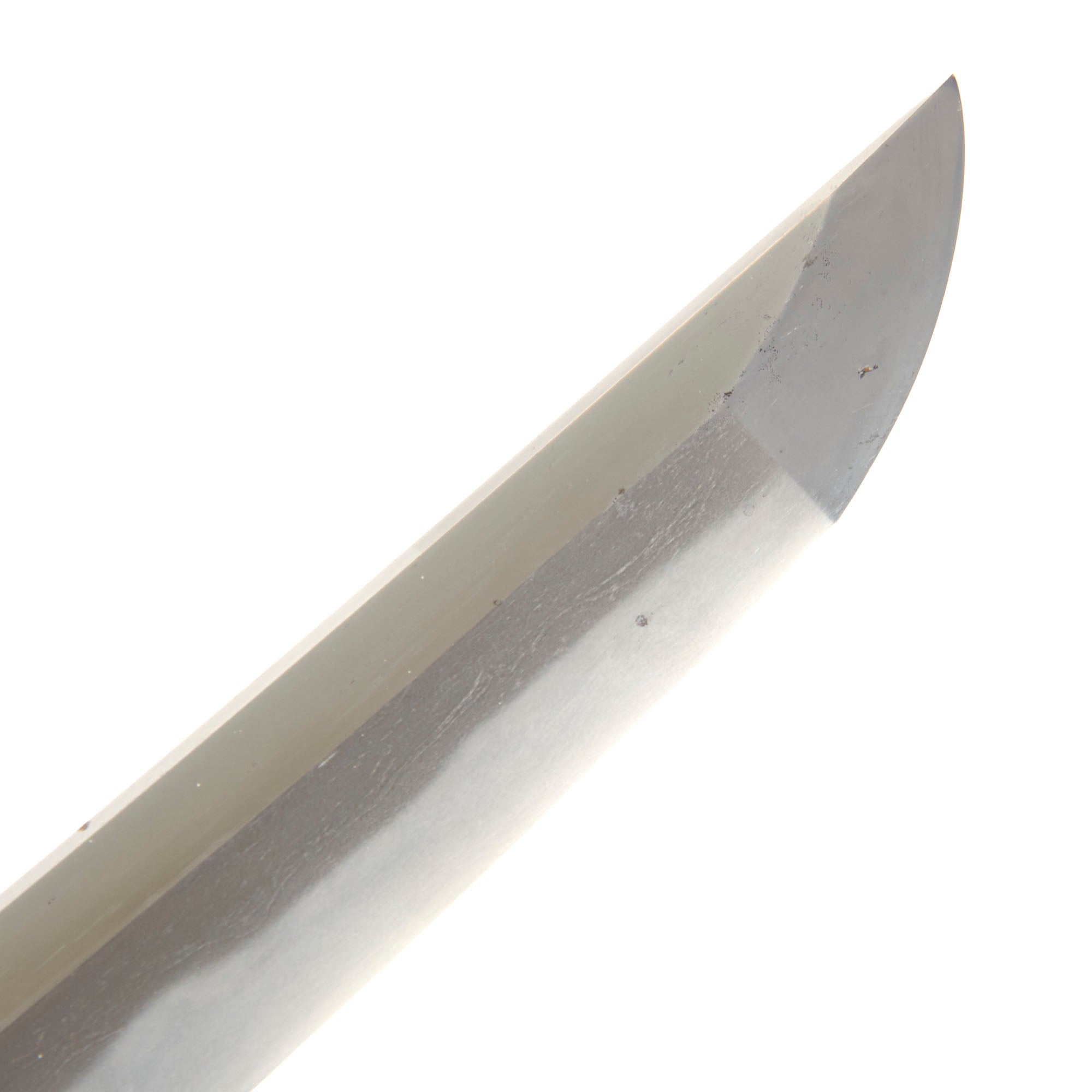 The blade has a proper geometric KISSAKI (切先 - point of blade) with a clear YOKOTE (横手 - line between ji and kissaki). The BOSHI ( 帽子 - tip temper line) is of the Ō-MARU (大丸- large round turnback) shape, and is fully visible with some great internal activity and a clear transition. We can see some HAKIKAKE (掃掛けBrush Stroke) activity as well. The blade has various KIZU (blade wounds), including WARE , which are lamination seams from the forging process, only possible on traditionally made blades. This is really a great blade, with lots of aspects to enjoy. With the long delay for traditional togishi polishing, blades like this that are ready to display and appreciate are definitely in demand.