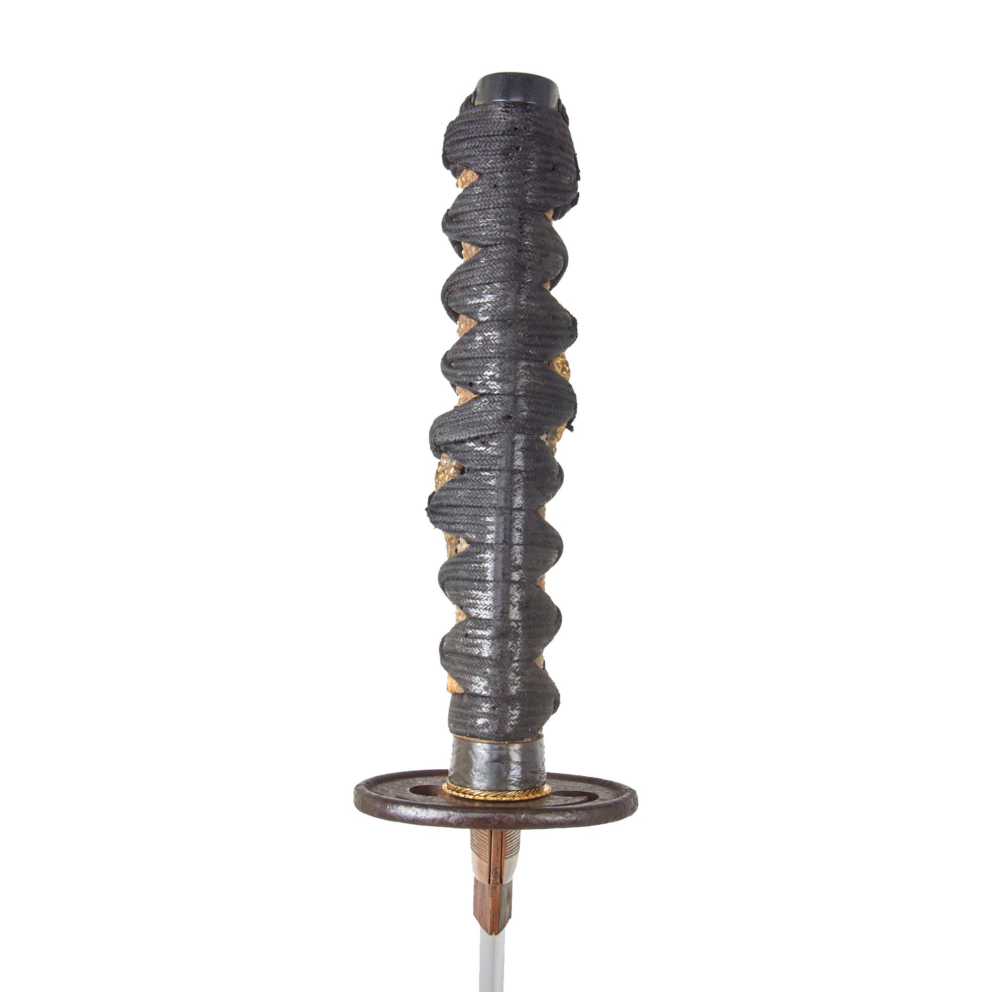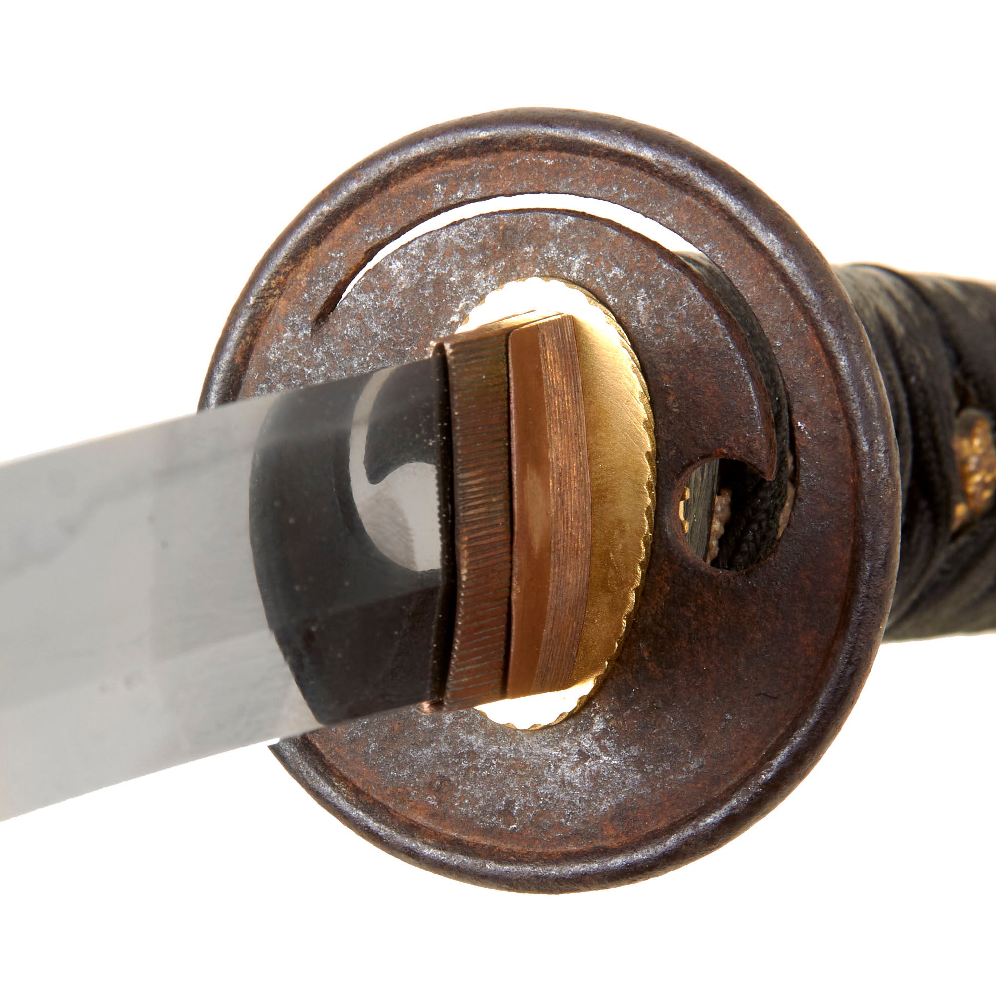 The tsuba (cross guard) is made of iron and is of the MARU GATA (sound) shape, without any adornments visible, though there is a single TOMOE (巴) shaped perforation, which looks like a comma. This is an ancient symbol in East Asia, used in the classic "yin and yang" symbol. It has a single Hitsu-ana accessory hole for the Kozuka (kogatana handle). This allows the knife to be taken out without unsheathing the sword, though there is not one included in this setting. There are three brass seppa to help keep the tsuba from wobbling. The sword has a two piece copper blade collar (habaki), typical of the Edo period.