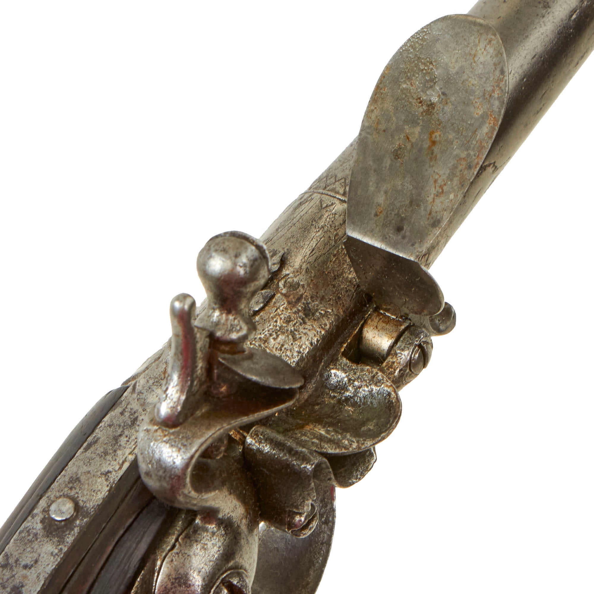 The short pistol is relatively spartan compared to some we have seen, though there is definitely some lovely engraving around the frame area, which is continuous with the barrel. Aside from the maker mark, we were not able to find any other marking on the pistol, though there does appear to be a good amount of wear around the breech area, so if there were proofs, they may have worn away. It looks to feature some type of safety on the rear of the "lock plate", but it does not move at present.