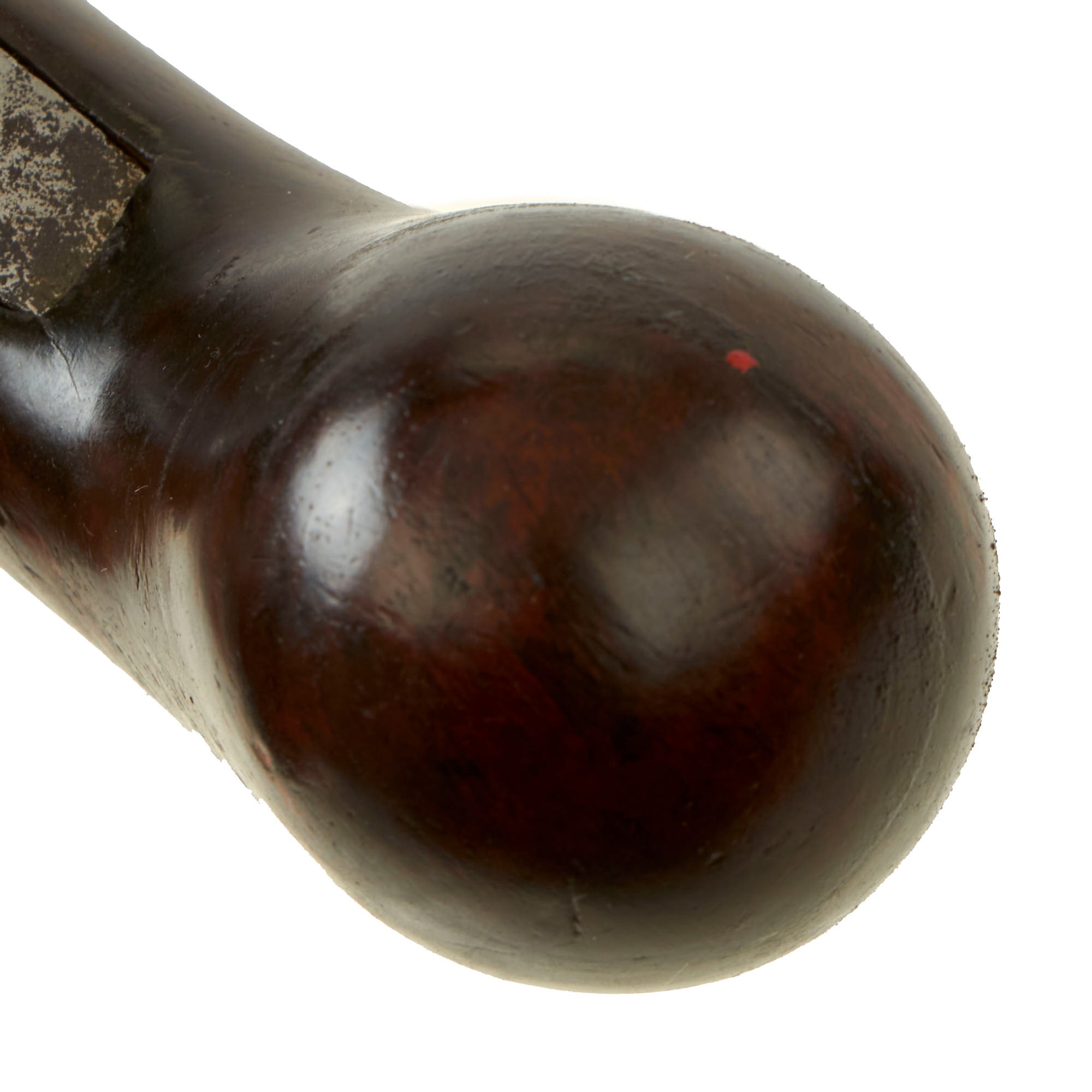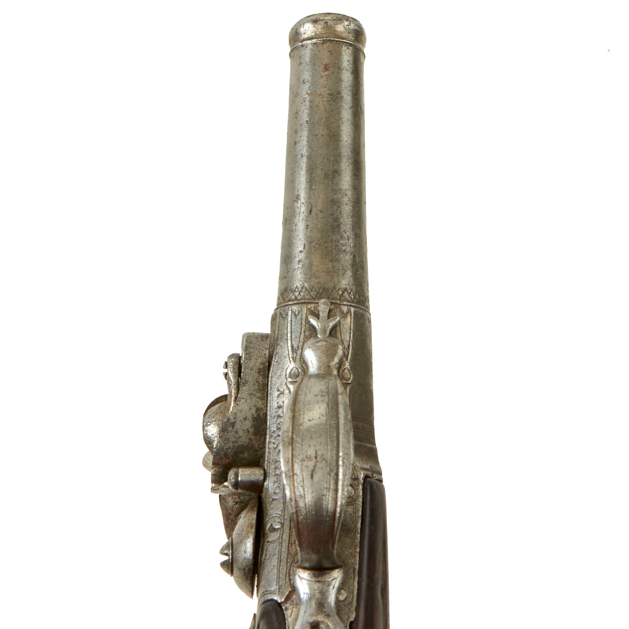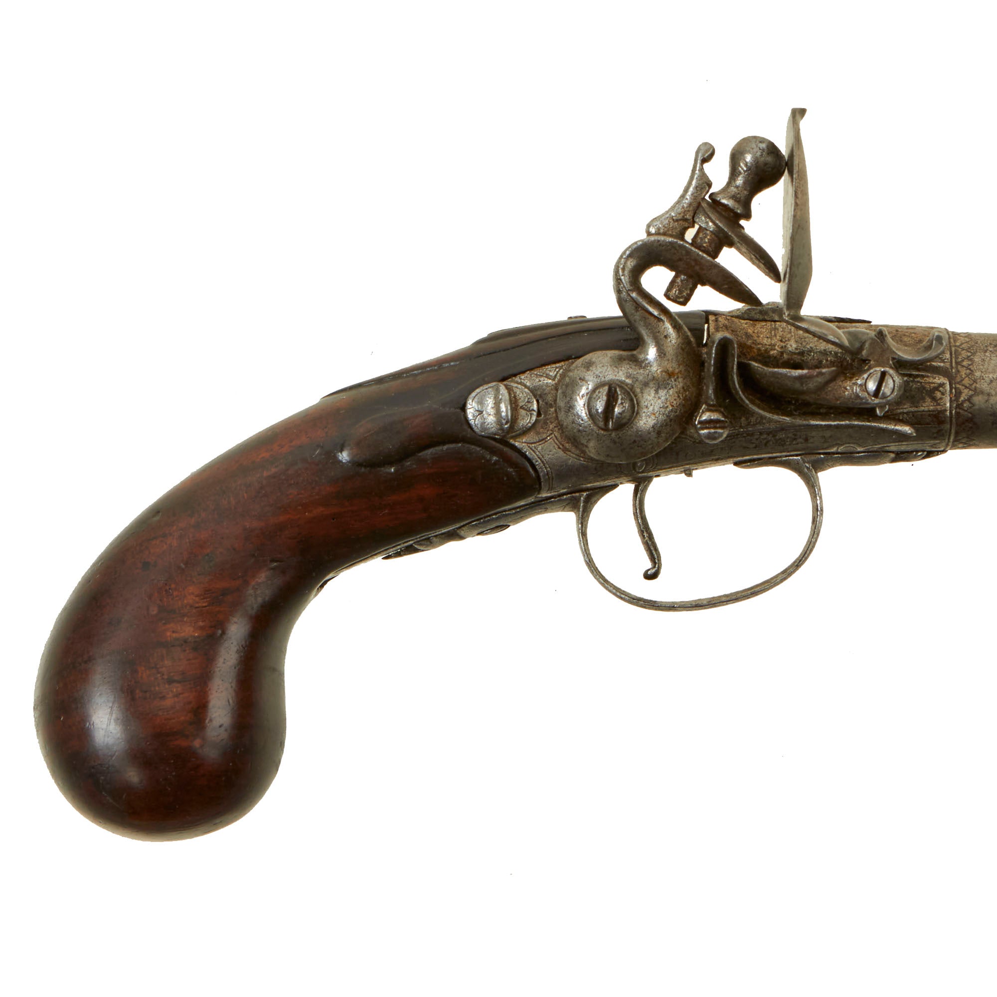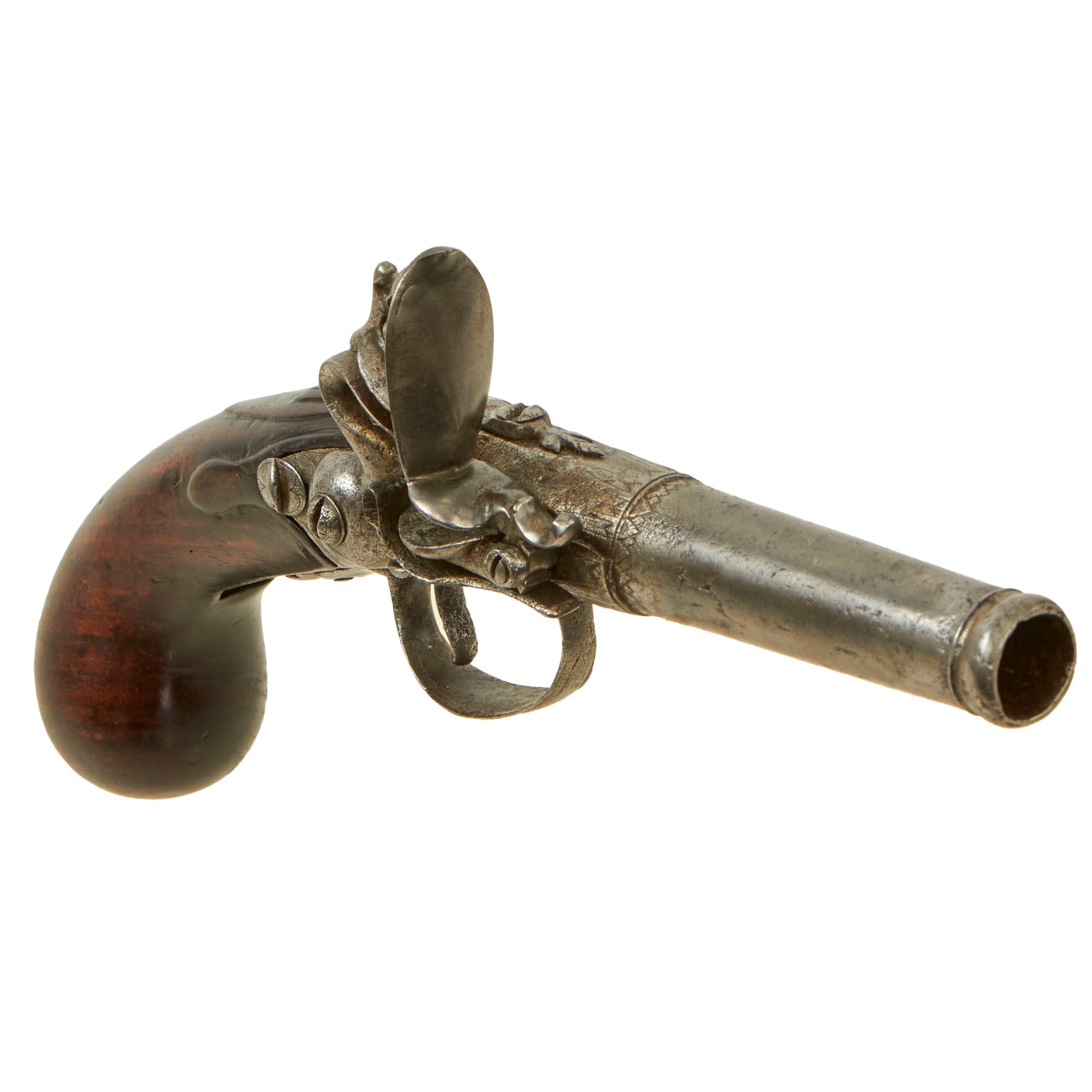 The pistol measures 9 inches in overall length, with a 4 3/8 inch cannon barrel in the typical "Queen Anne" style, however in this case it is not removable. The pistol has an iron trigger guard, and there is no provision for a ramrod. The dark English Walnut butt grip is lovely, and has some carving around the barrel tang, and sides. The color is truly lovely, and there is a hairline crack on the right hand side of the grip. Condition is very nice, with a lovely patina of age. The lock functions, holding correctly at half cock and firing at full.