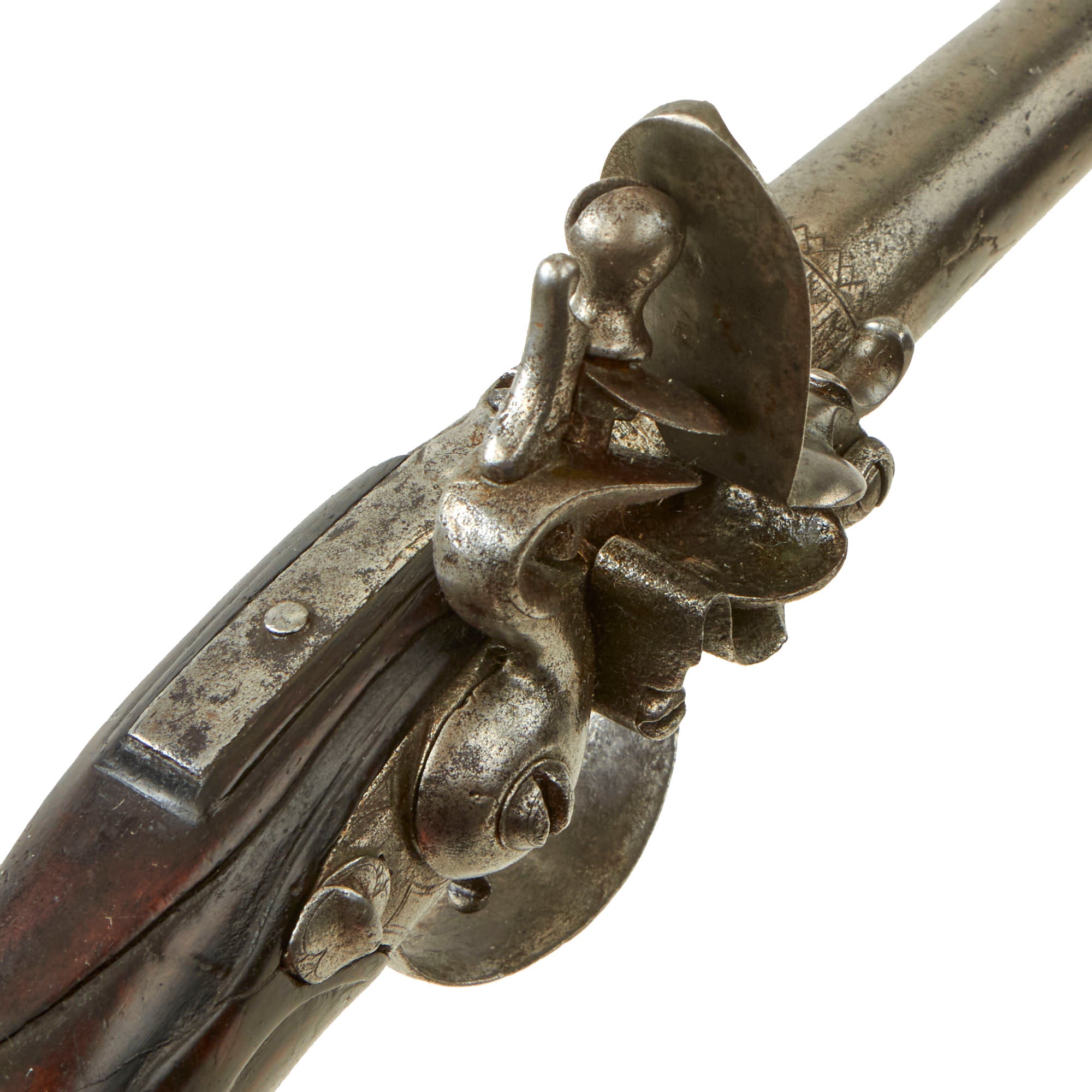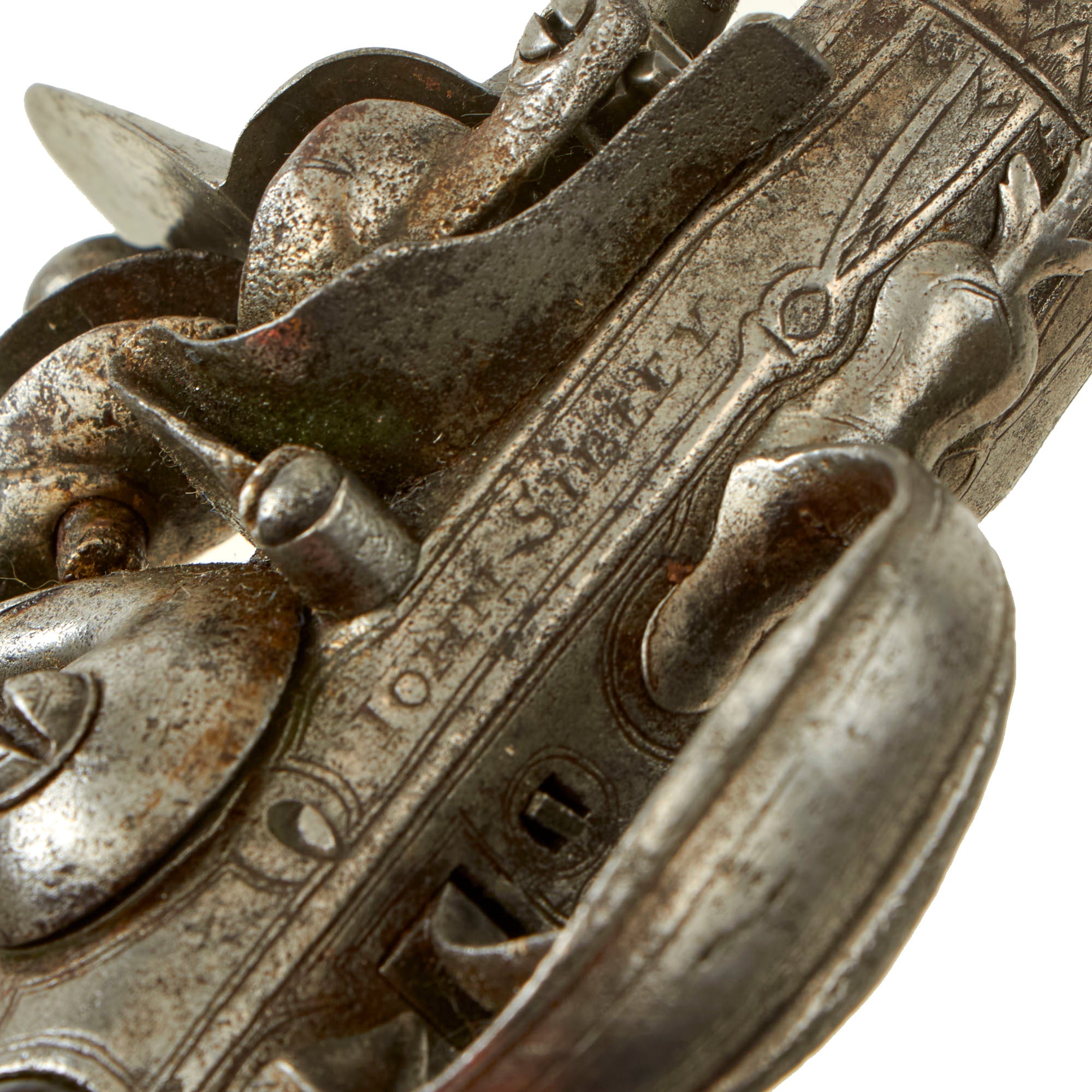 Original Item: Only one available. This is a very rare "Queen Anne" style pistol with a single piece iron frame and barrel, made in a relatively short length compared to what we usually see. It is marked on the bottom of the lock under the frizzen spring by maker IOHN SIBLEY of London. Known to have made Holster Pistols for Queen's Anne's Army, John Sibley became one of London's premier Gun Makers by the end of the 17th Century. He also made guns under contract for the Hudson Bay Company. As was the custom of the time, the J in his name was "Latinized" to I, which did not have the letter J.