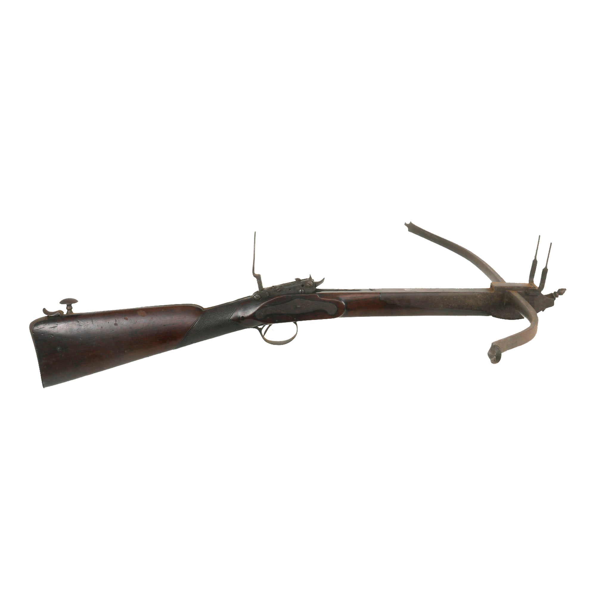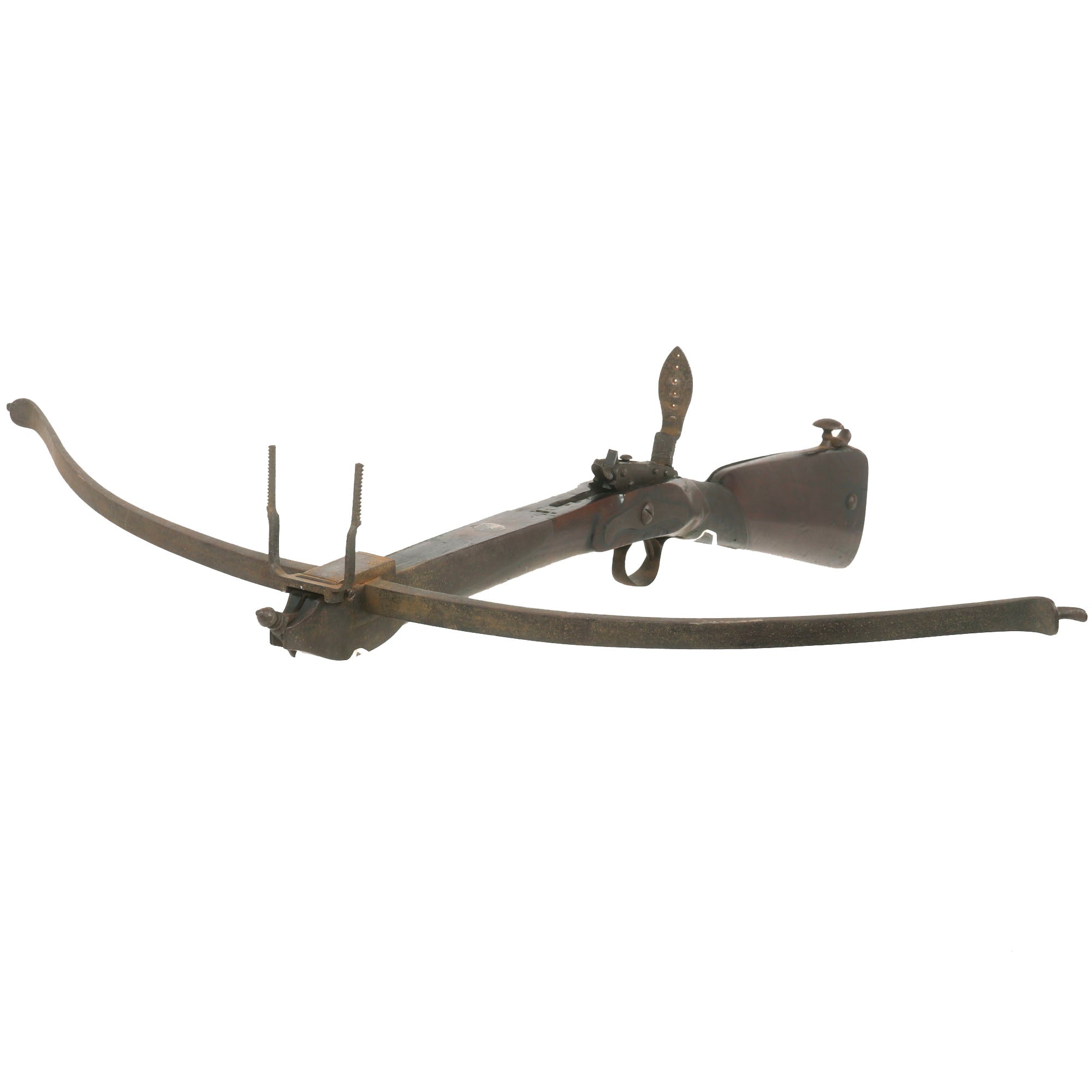 Original Early 18th Century European Continental Wood & Steel Crossbow with Built-in Spanner & Cocking Mechanism