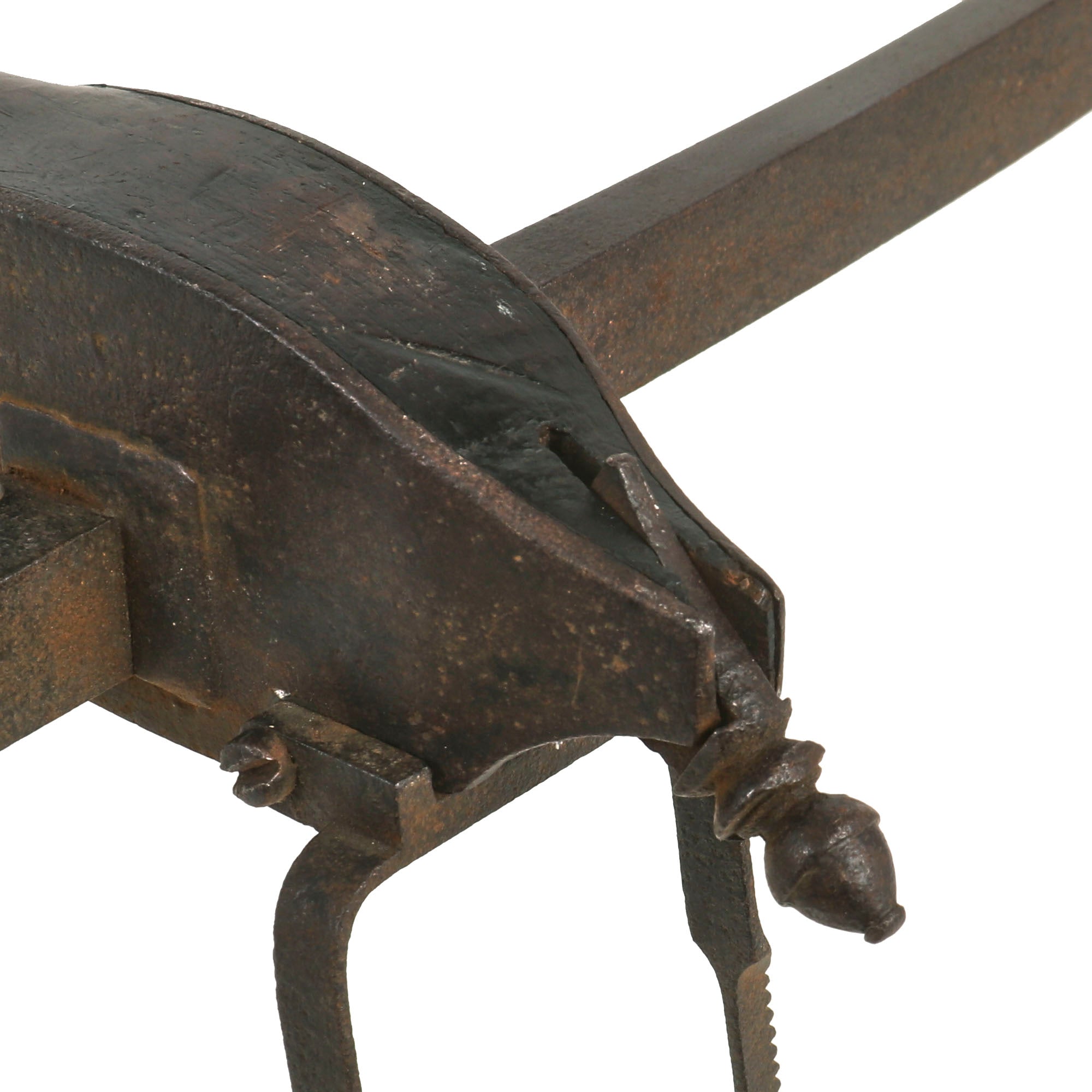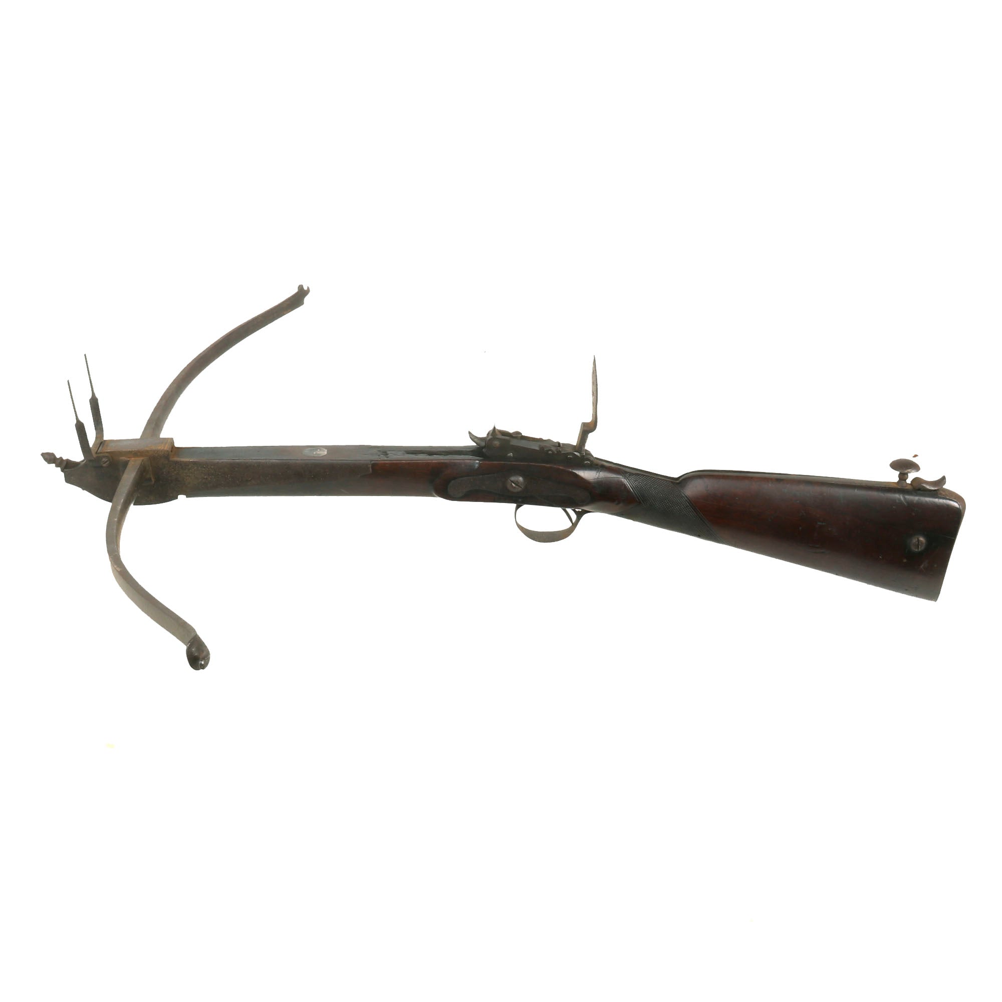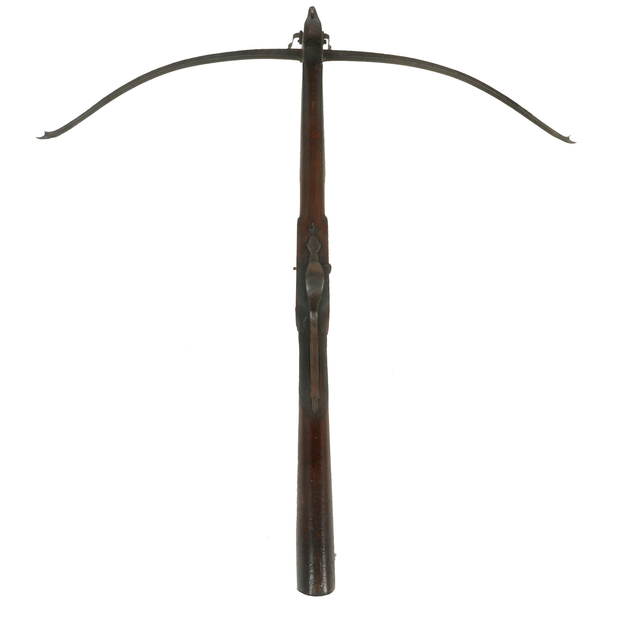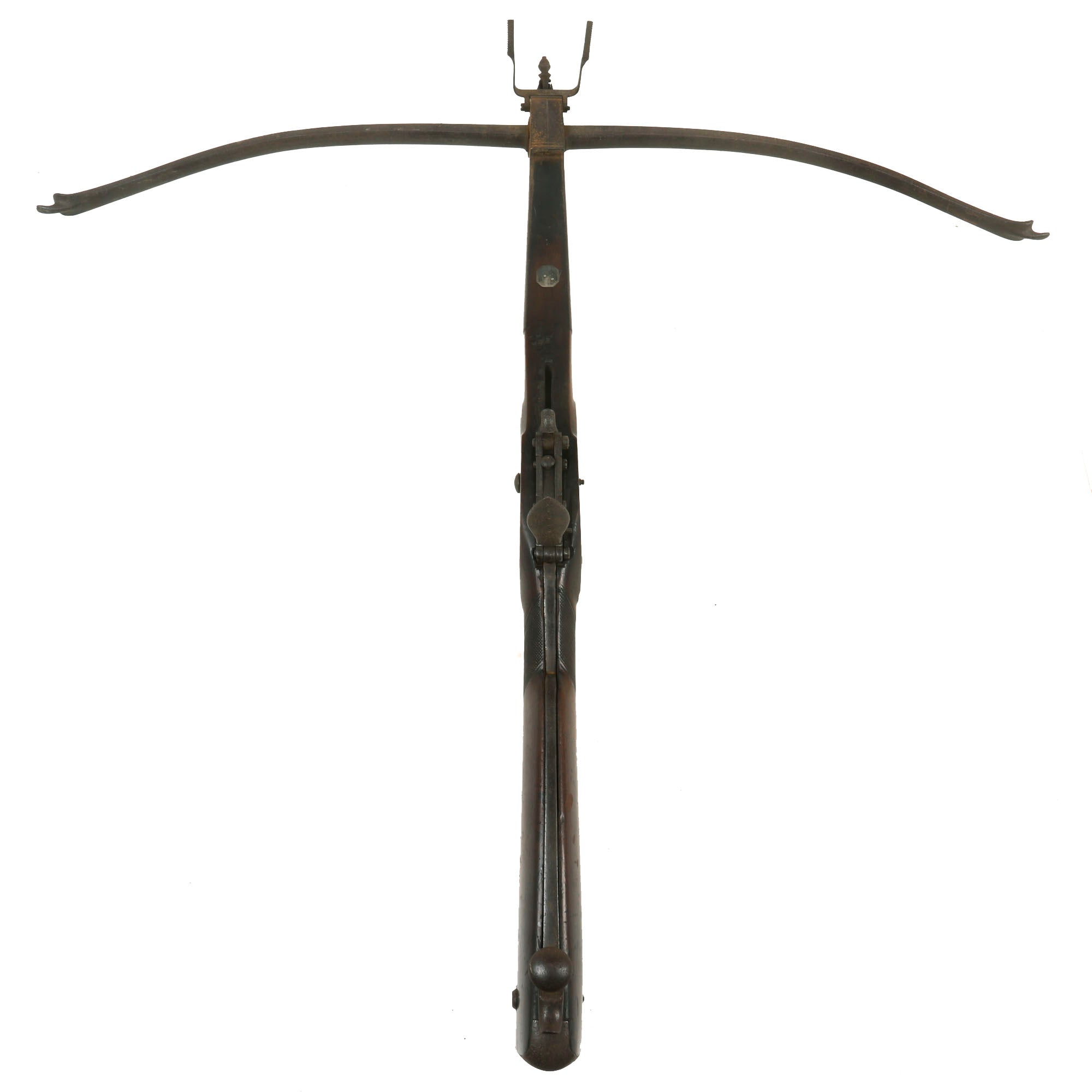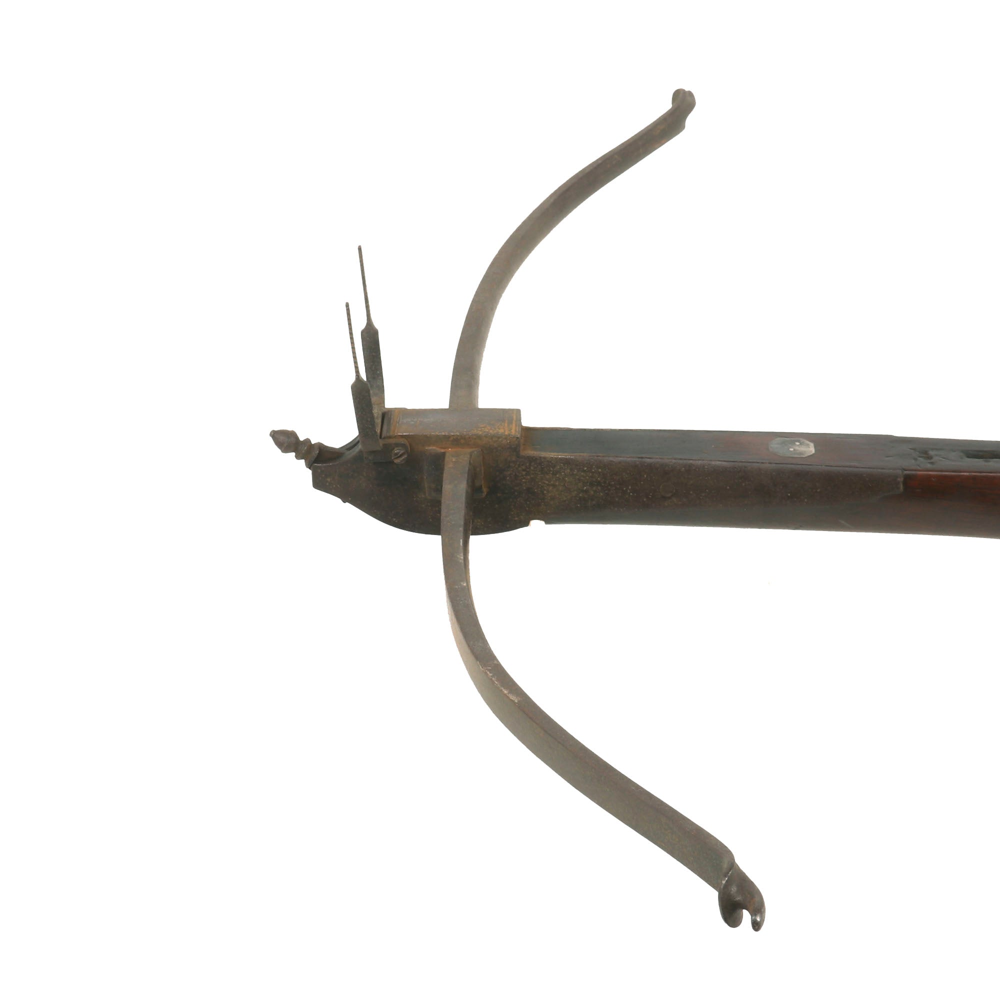 • Original Item: One-of-a-kind. This is a lovely early 18th century crossbow from the European Continent, featuring a gorgeous fruitwood stock, shaped much like a gun stock. It features a gorgeous built-in spanner which is built into the length of the buttstock, with a knob at the back to raise it forward. The crossbow features steel fittings of butt plate, trigger guard, side plates, nose fitting, and even the "lock" mechanism that holds the string back. The flight groove on top is well executed though it is not lined with metal or horn. The "bow" portion is in great shape without any serious damage. The crossbow also features a great front sight which folds down.