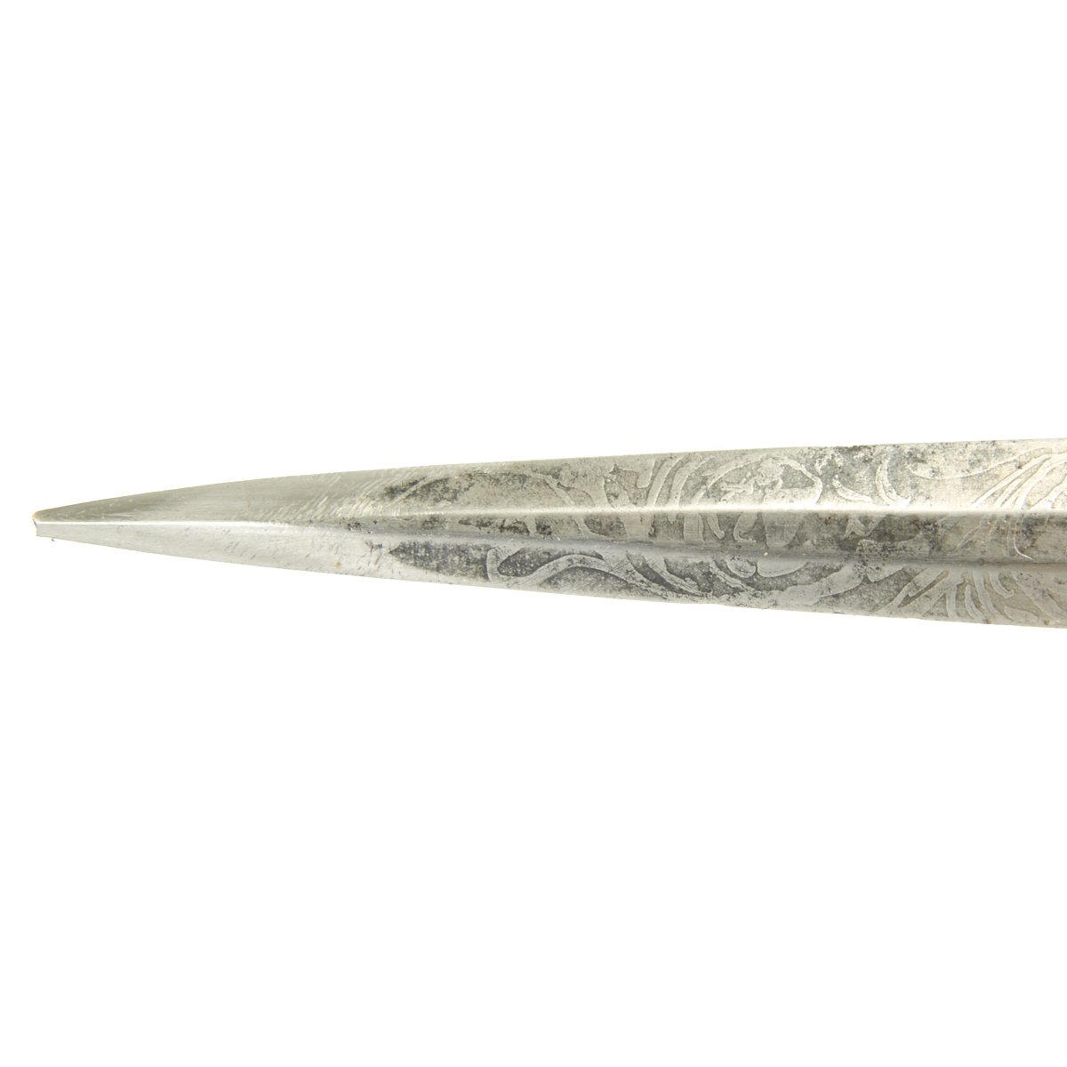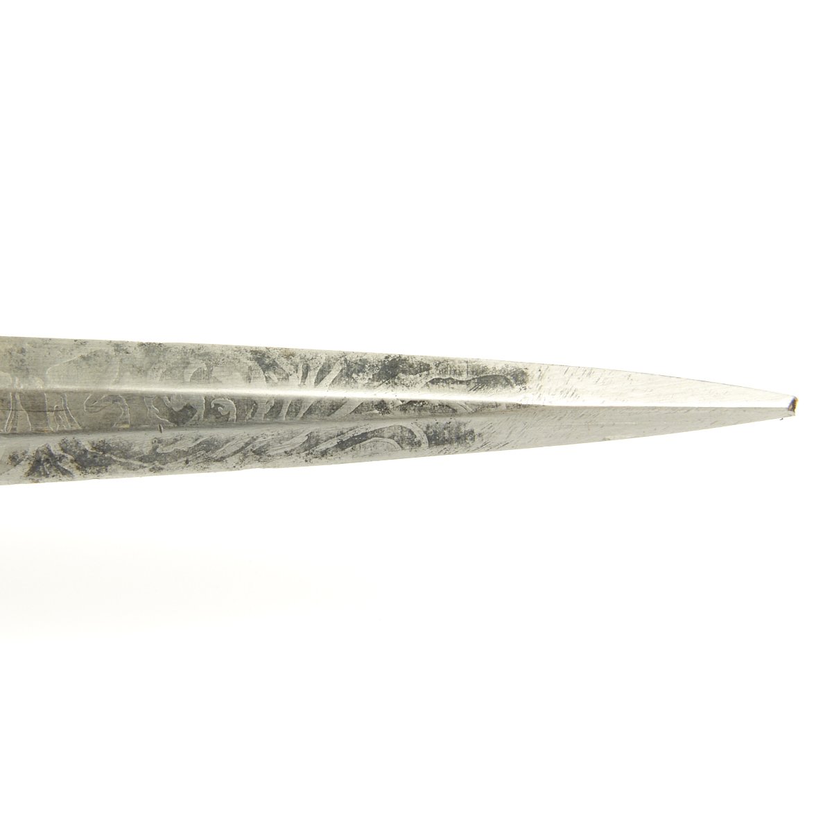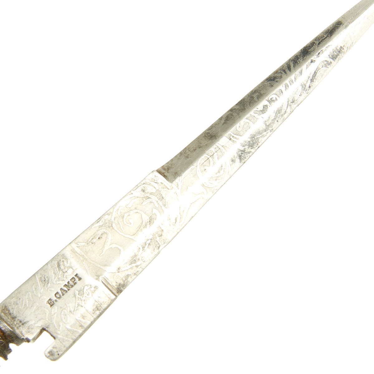The other side of the blade also marked in script probably in Corsican which we cannot discern. Beautifully constructed, a true quality item and presumably we all know what for. Complete in a silver mounted hard leather scabbard.