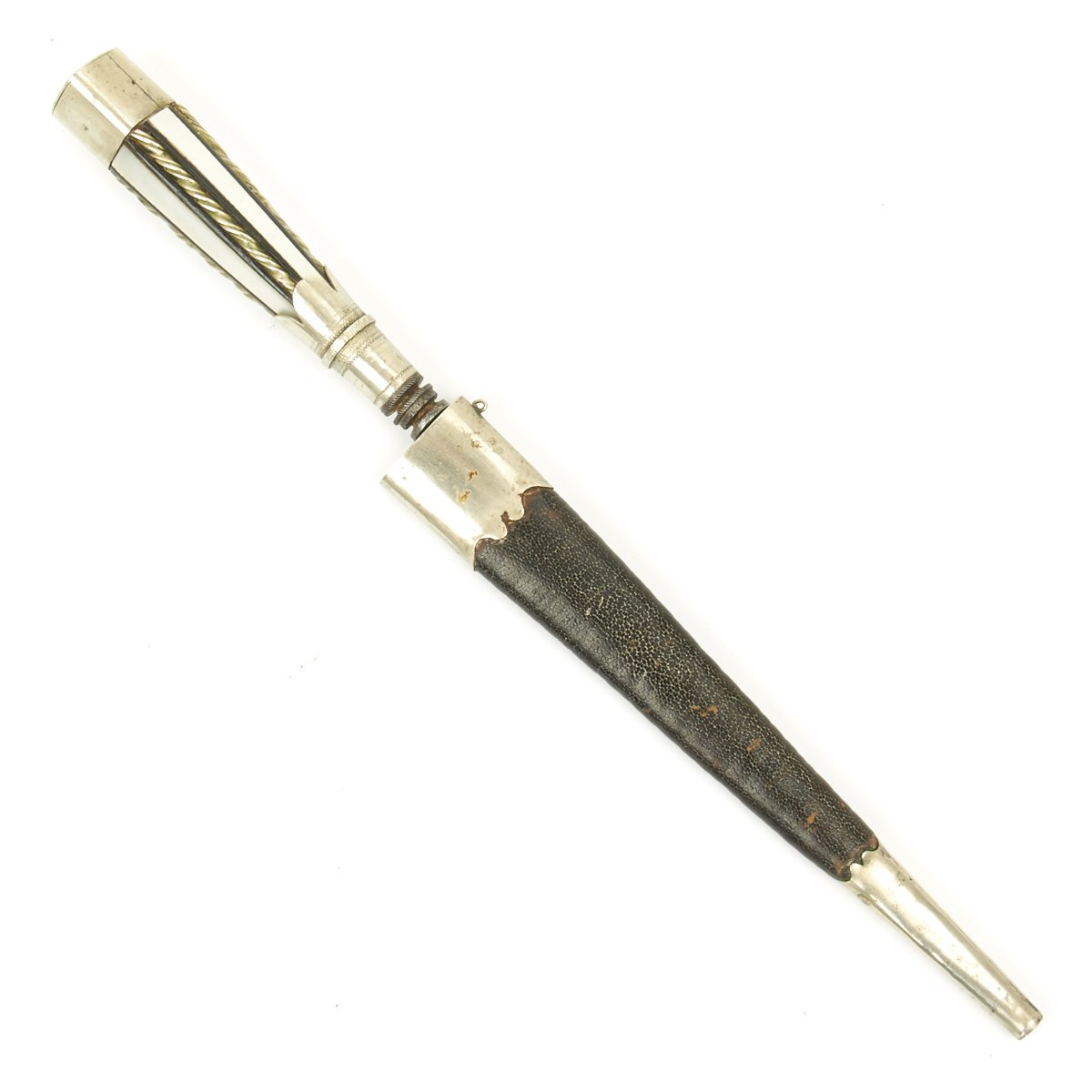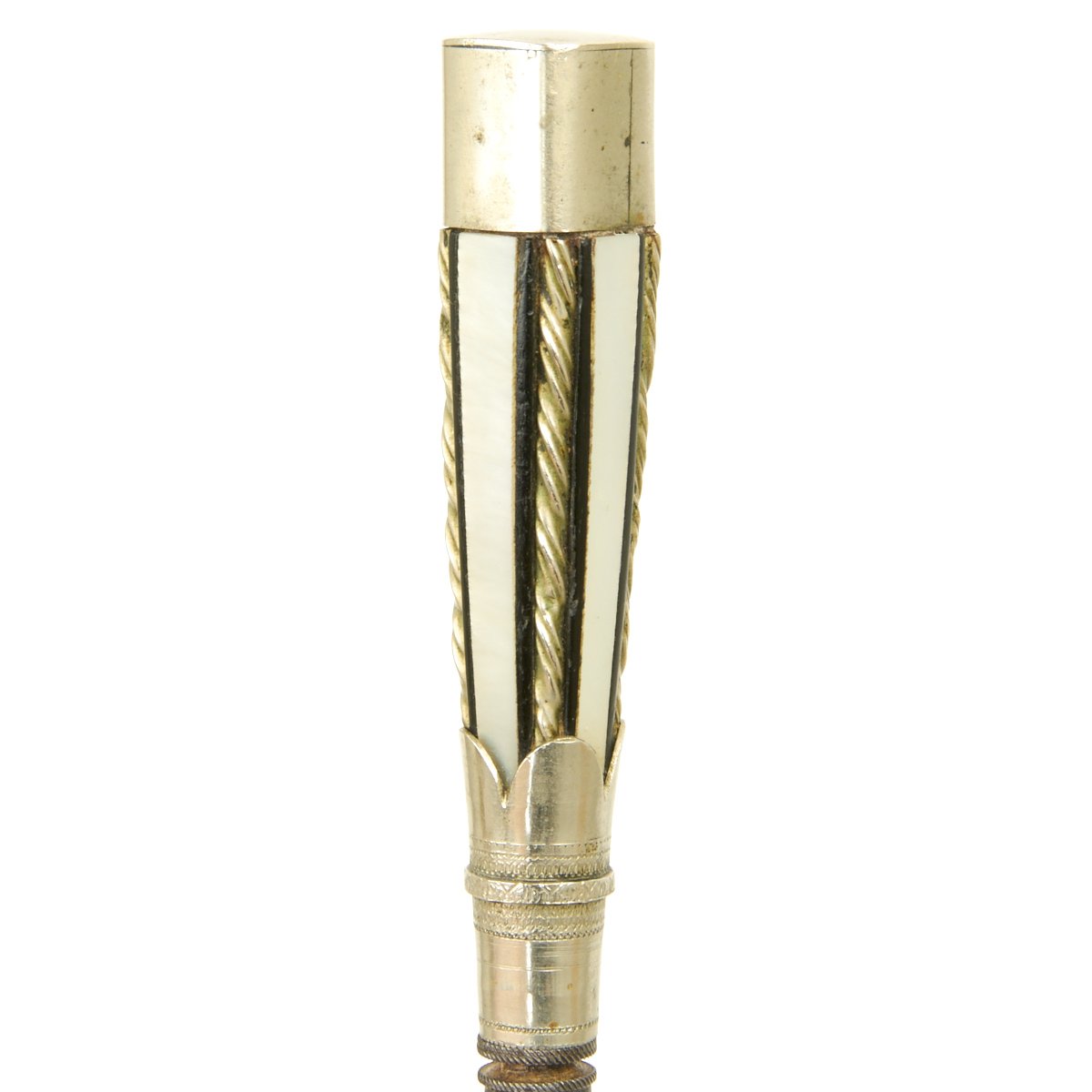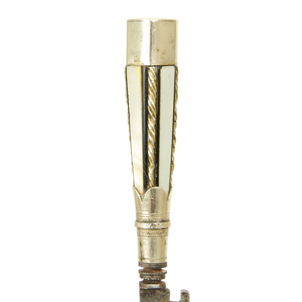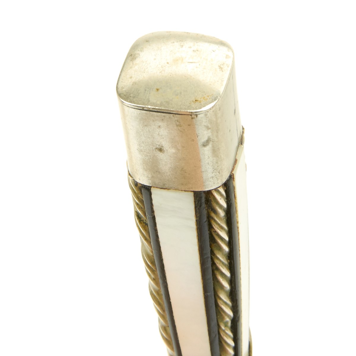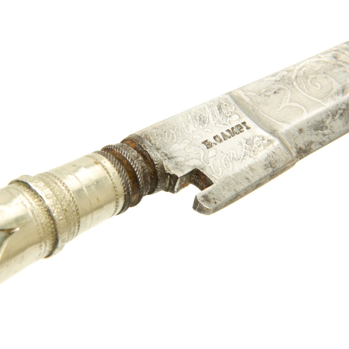 Original Item. One Only. In a manner of speaking this is most appealing, just 9 1/2" in overall length with a 5 1/2" fully engraved/embossed blade bearing maker's name of E.CAMPI. The hilt is made of low grade silver with ebony, mother of pearl , and twisted silver panels. One side of the blade is embossed in script VENDETTA CORSO, which rather points the finger toward Corsica rather than Sicily.