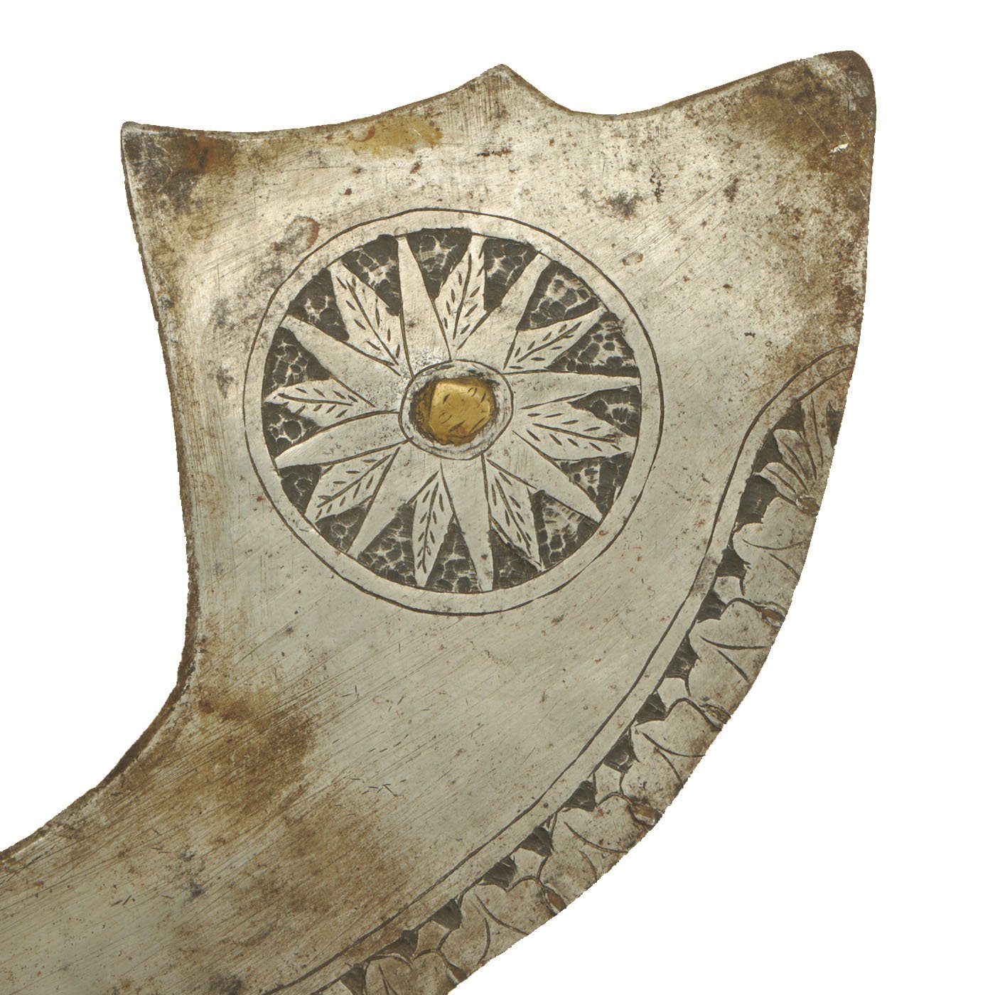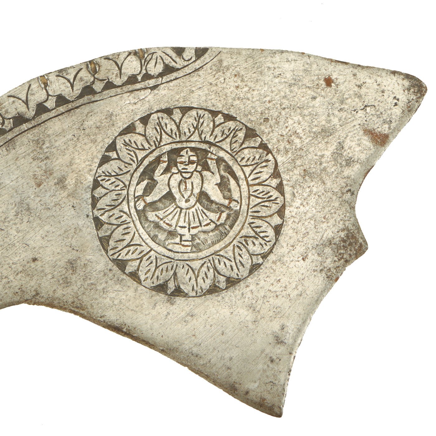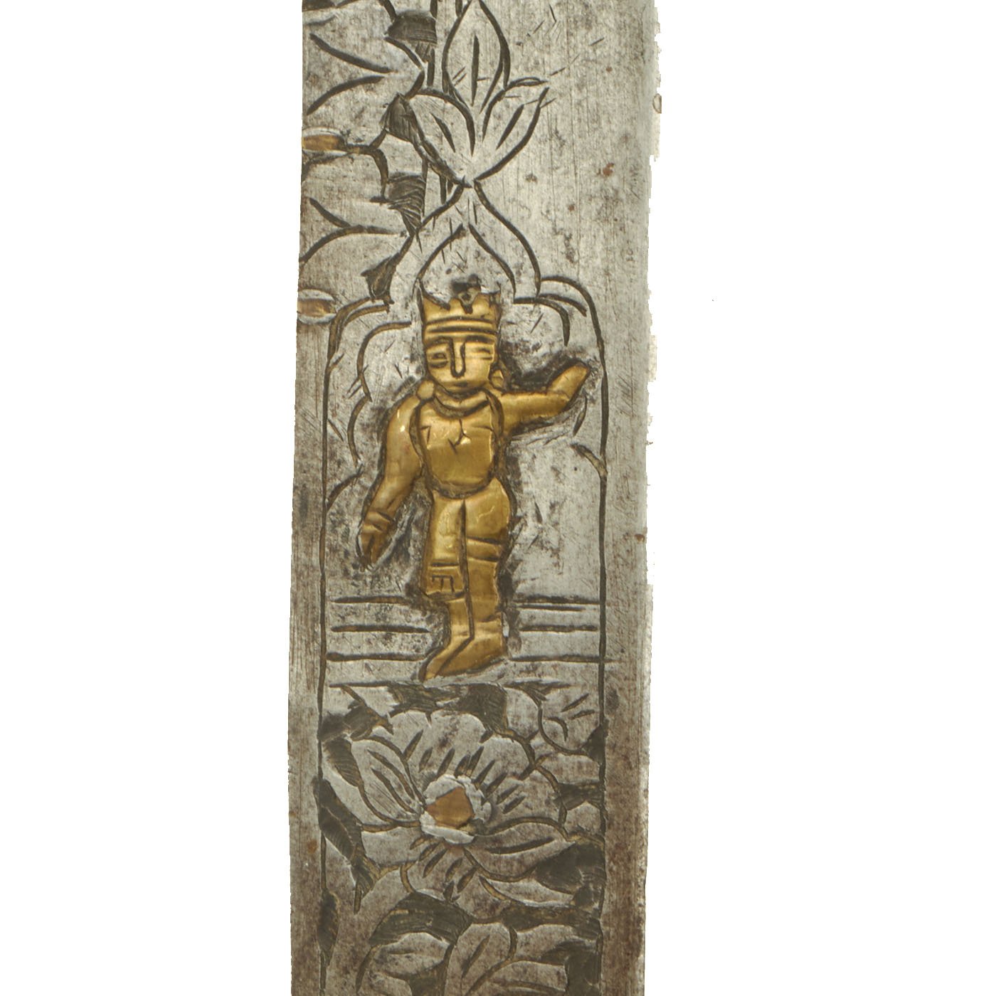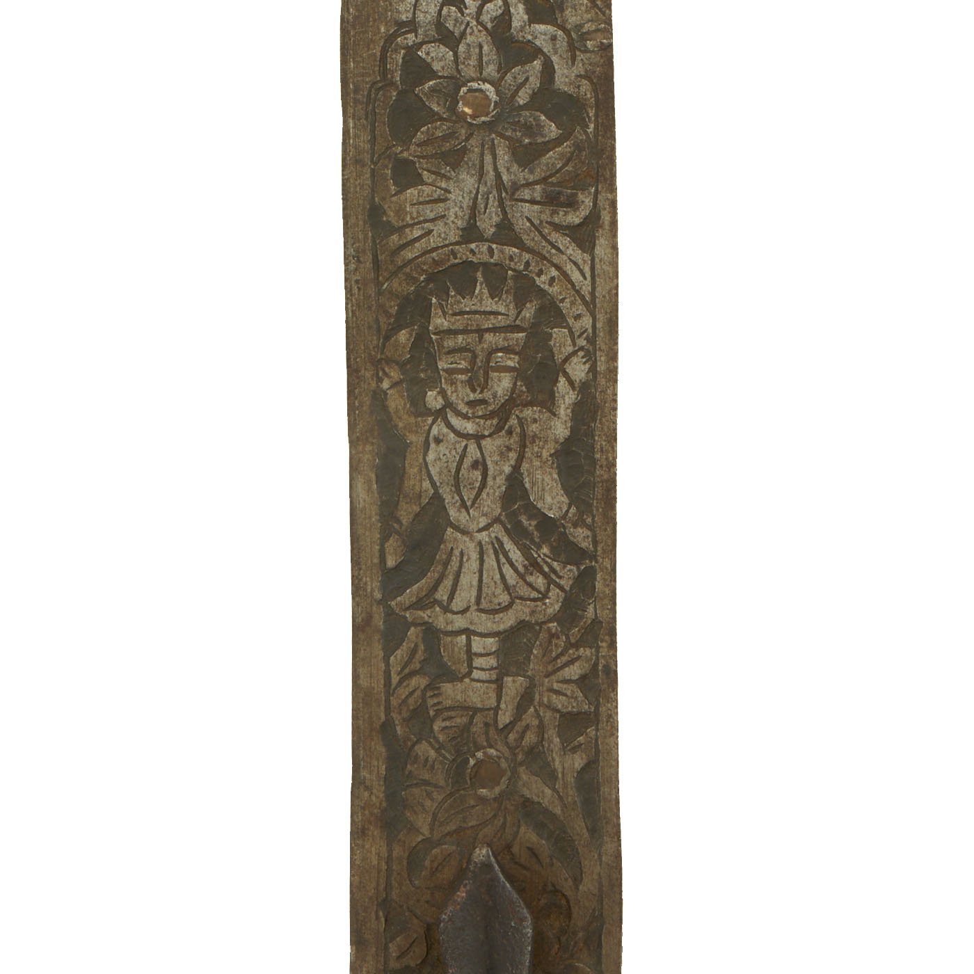 This KORA is almost 30" overall with a 24" blade and is fitted with a "Tulwar" style grip, with the characteristic circular pommel guard with a central "skull crusher" spike. The blade is heavily scalloped and carved with Hindu god figures, and is inlaid with a god like figure in brass on one side. There is a large "flower" on both sides of the head, with a small brass inlay on one side, and another Hindu god carved onto the other. A most impressive weapon that must have been deadly on the Battle field, as well as very effective for beheading after the battle was over.