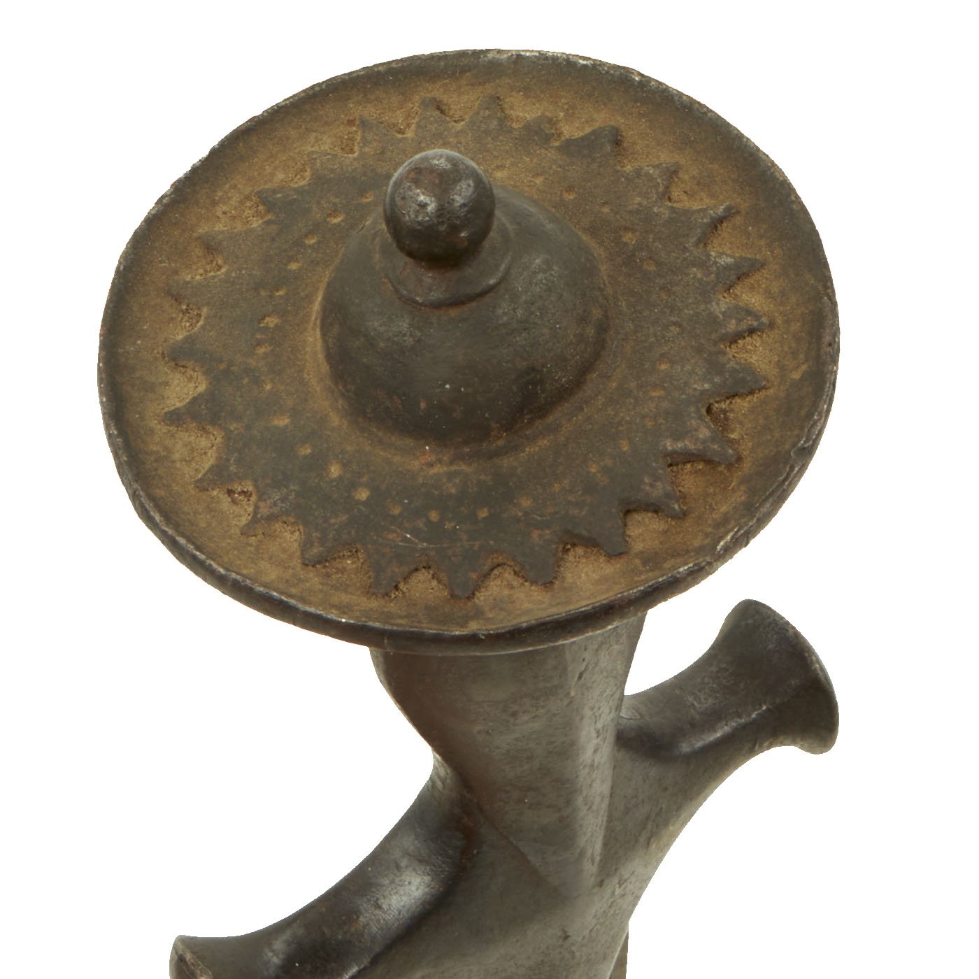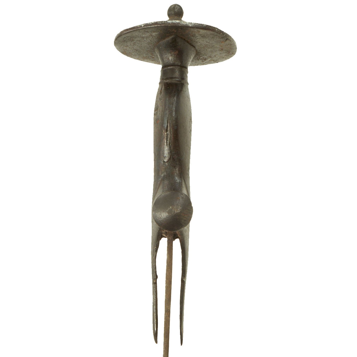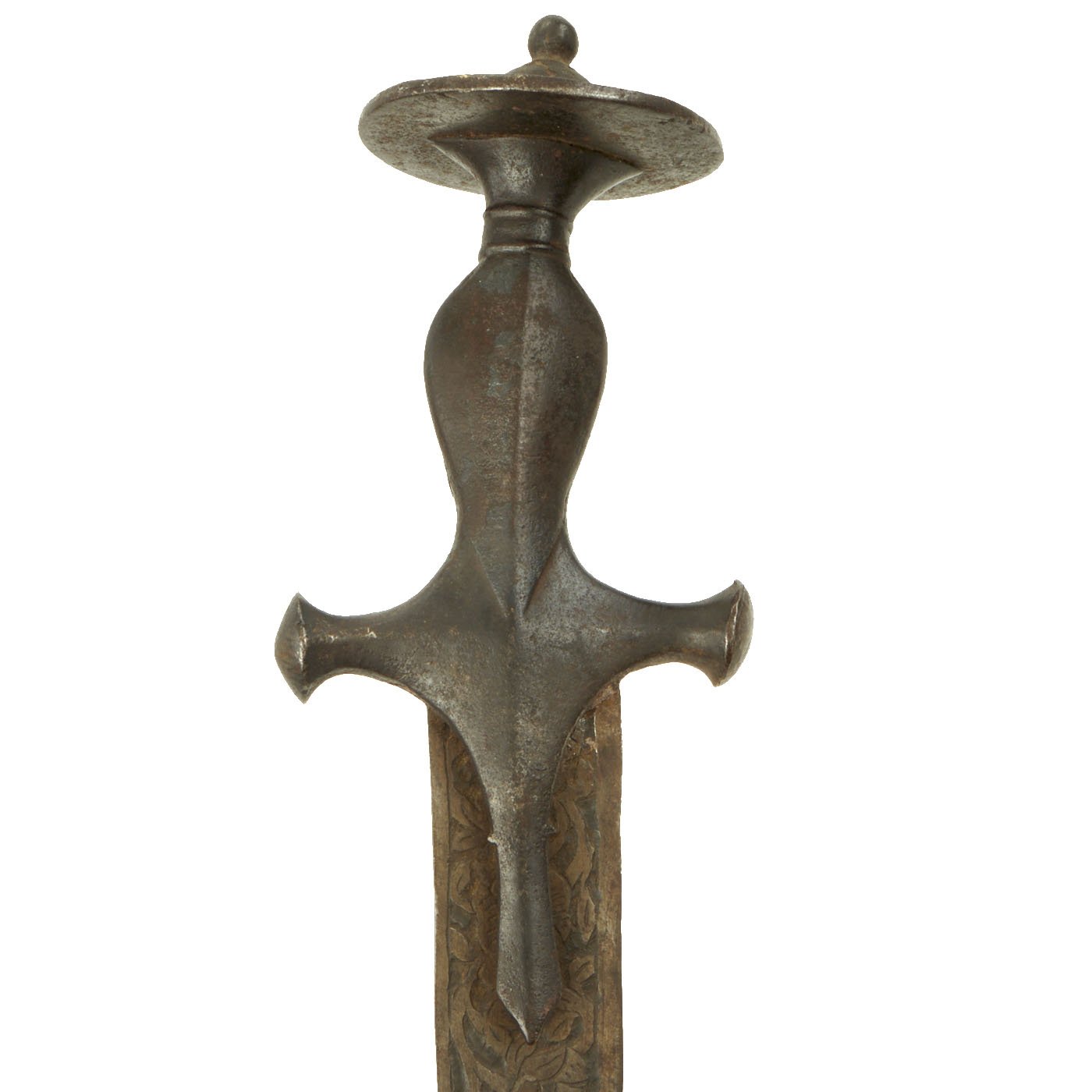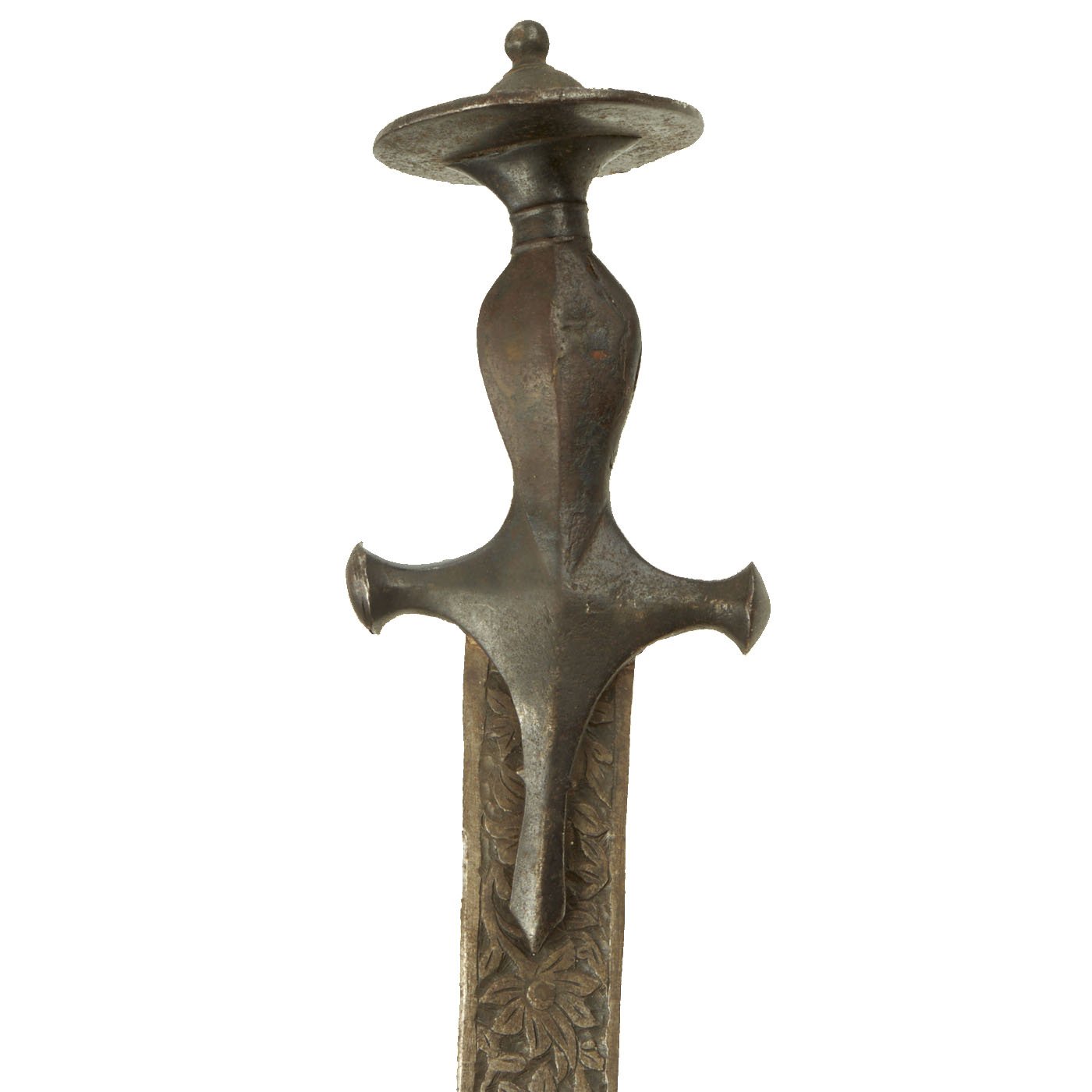 This KORA is almost 30" overall with a 24" blade and is fitted with a "Tulwar" style grip, with the characteristic circular pommel guard with a central "skull crusher" spike. The blade is heavily scalloped and carved with Hindu god figures, and is inlaid with a god like figure in brass on one side. There is a large "flower" on both sides of the head, with a small brass inlay on one side, and another Hindu god carved onto the other. A most impressive weapon that must have been deadly on the Battle field, as well as very effective for beheading after the battle was over.