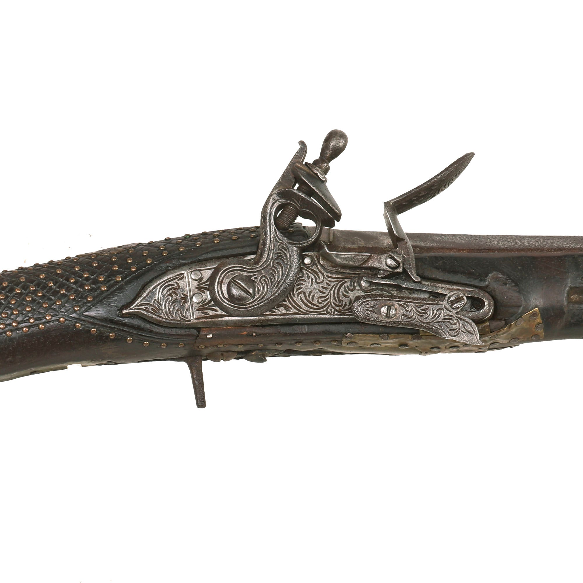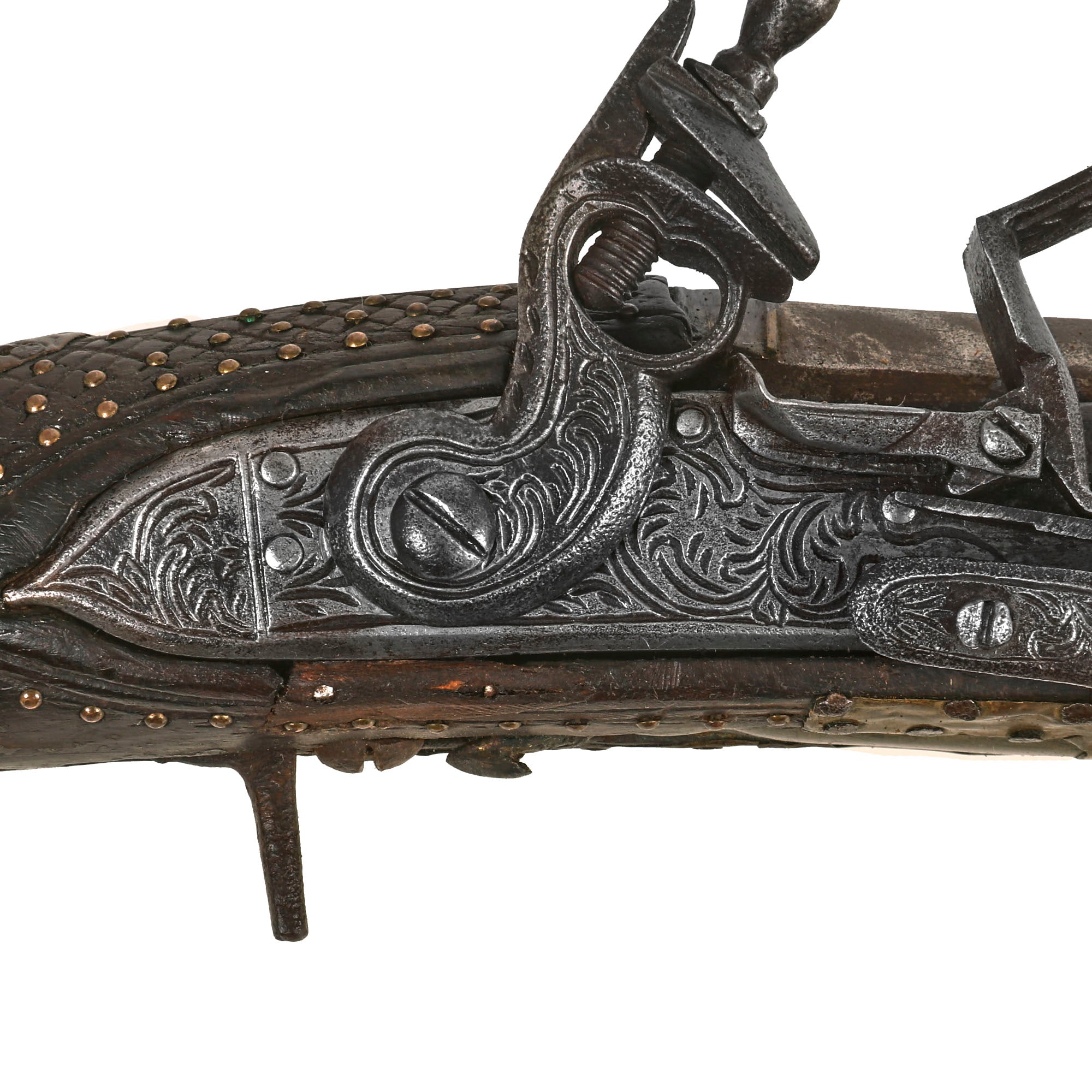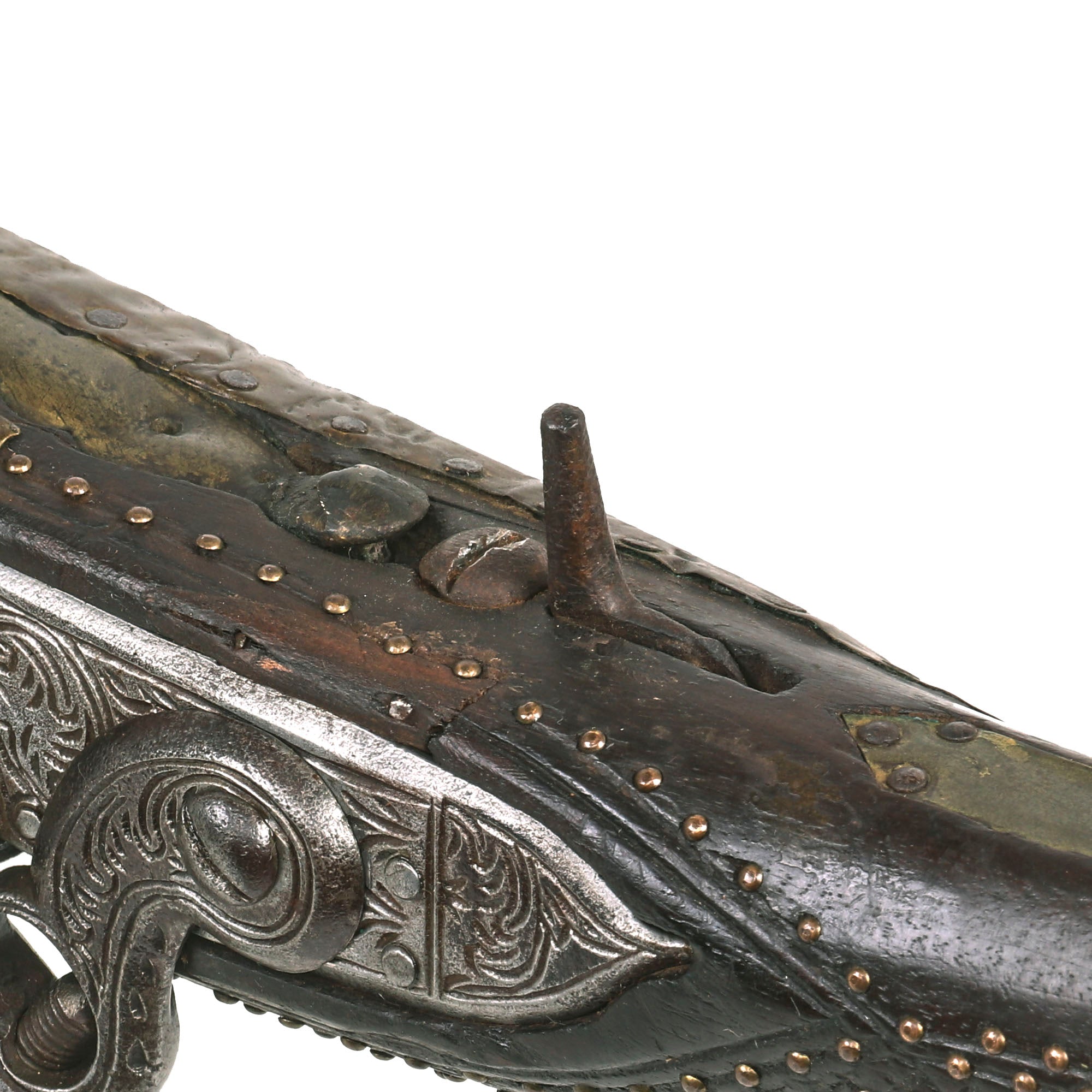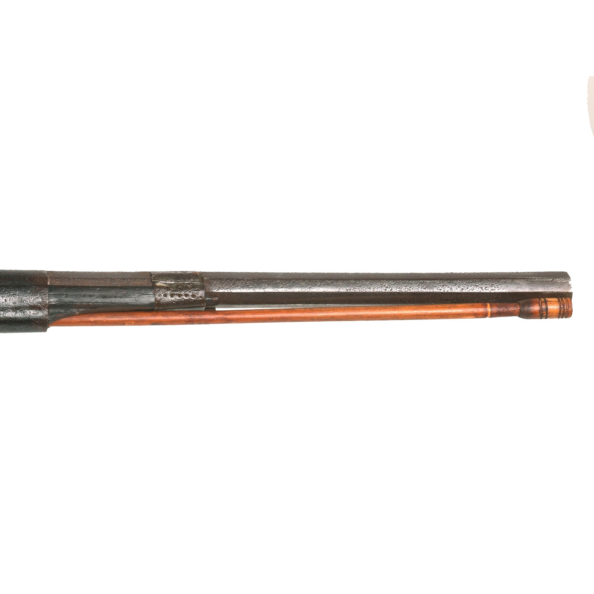 Original Item: One of a Kind. The Jezail (sometimes Jezzail from the Arabic / Pashto جزایل, for "long [barrels]") is a simple, cost-efficient and typically handmade muzzle-loading long arm commonly used in the Middle East region in the past. These were all highly personalized, so no two were alike. They were often made with locally available locks, so it was common to see locks on these that were of varied origin. This example is all locally made, and probably originates from the North African region, anywhere from Morocco in the West to Saudi Arabia in the East. It features a somewhat primitive but attractive snaphaunce style lock.