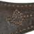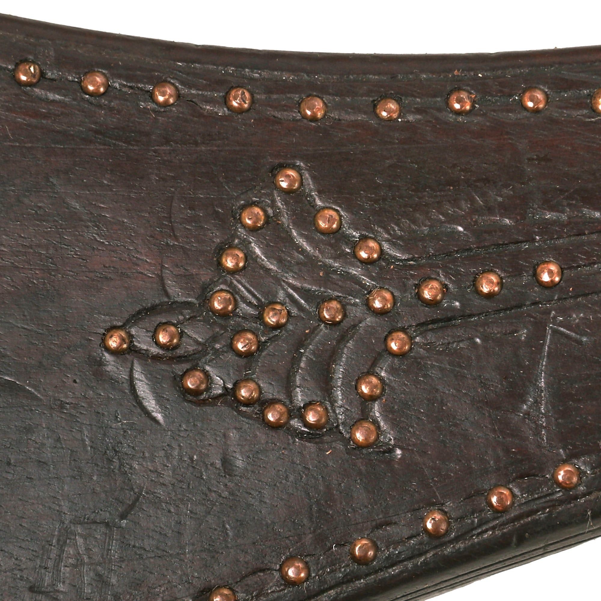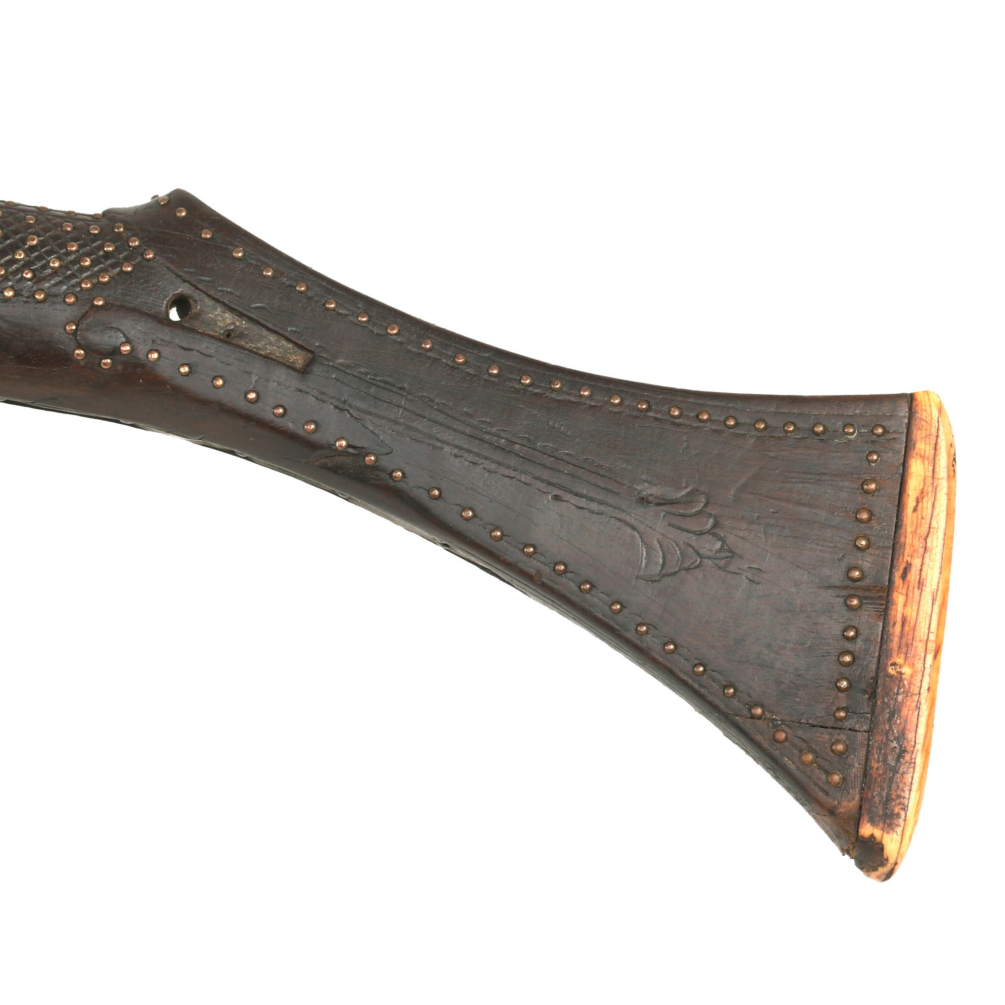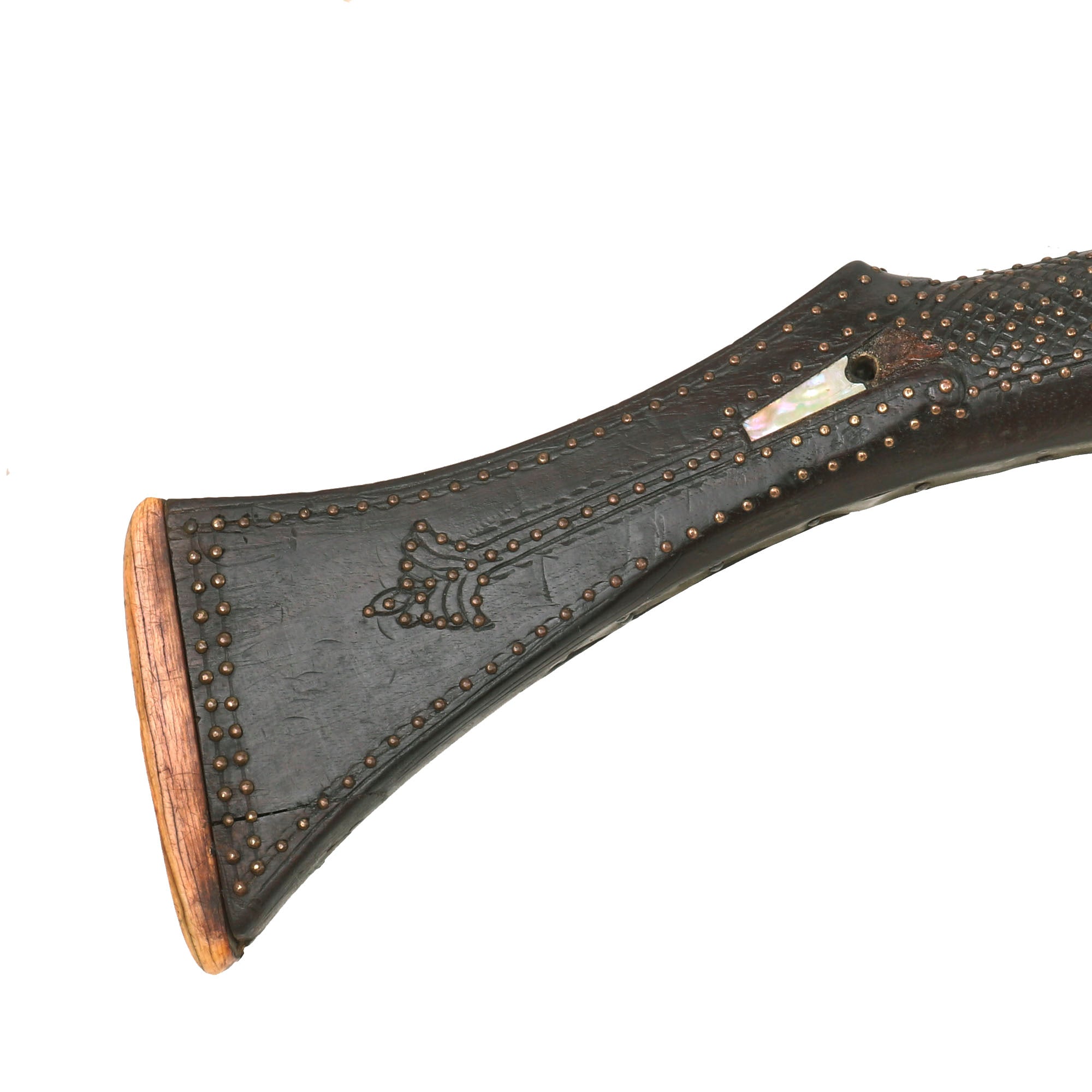 The fore stock shows much of the original wood, with some soldered on sheet iron barrel bands, while the rear shows less due to the brass covering. Still, most of the wood is visible, showing carved designs, and there are numerous brass tacks laid out in a decorative pattern. This would also serve to make the checkered wrist area easier to grip. We can see that it probably originally had two sling swivels, now removed, and the butt stock fitting for the swivel probably had mother of pearl inlays on both sides, while only half of the right side remains. The butt stock has a substantial camel bone butt pad, the usual material we see on these North African jezails.