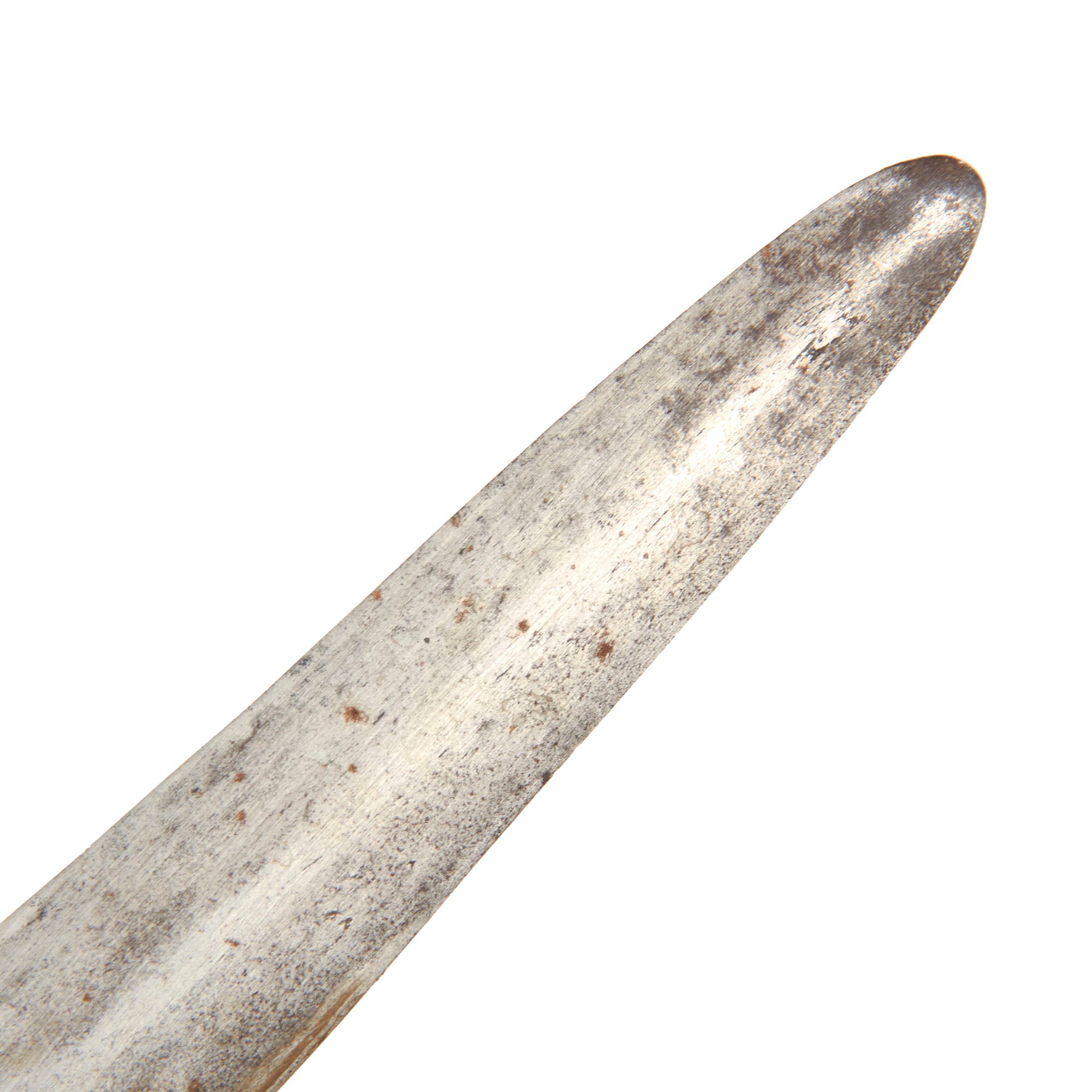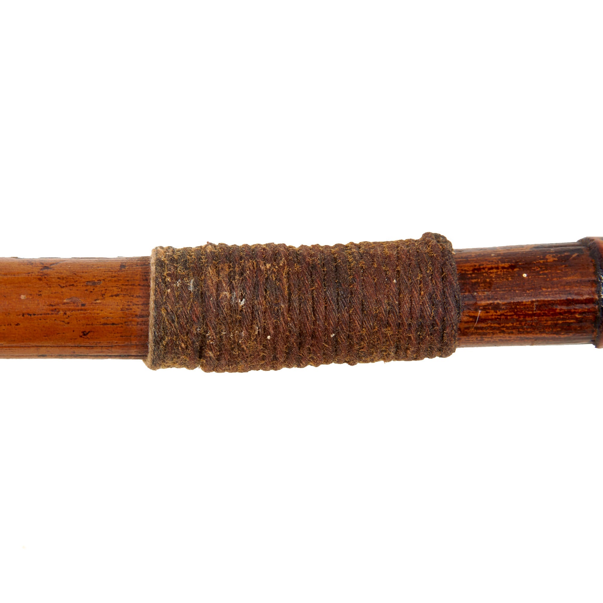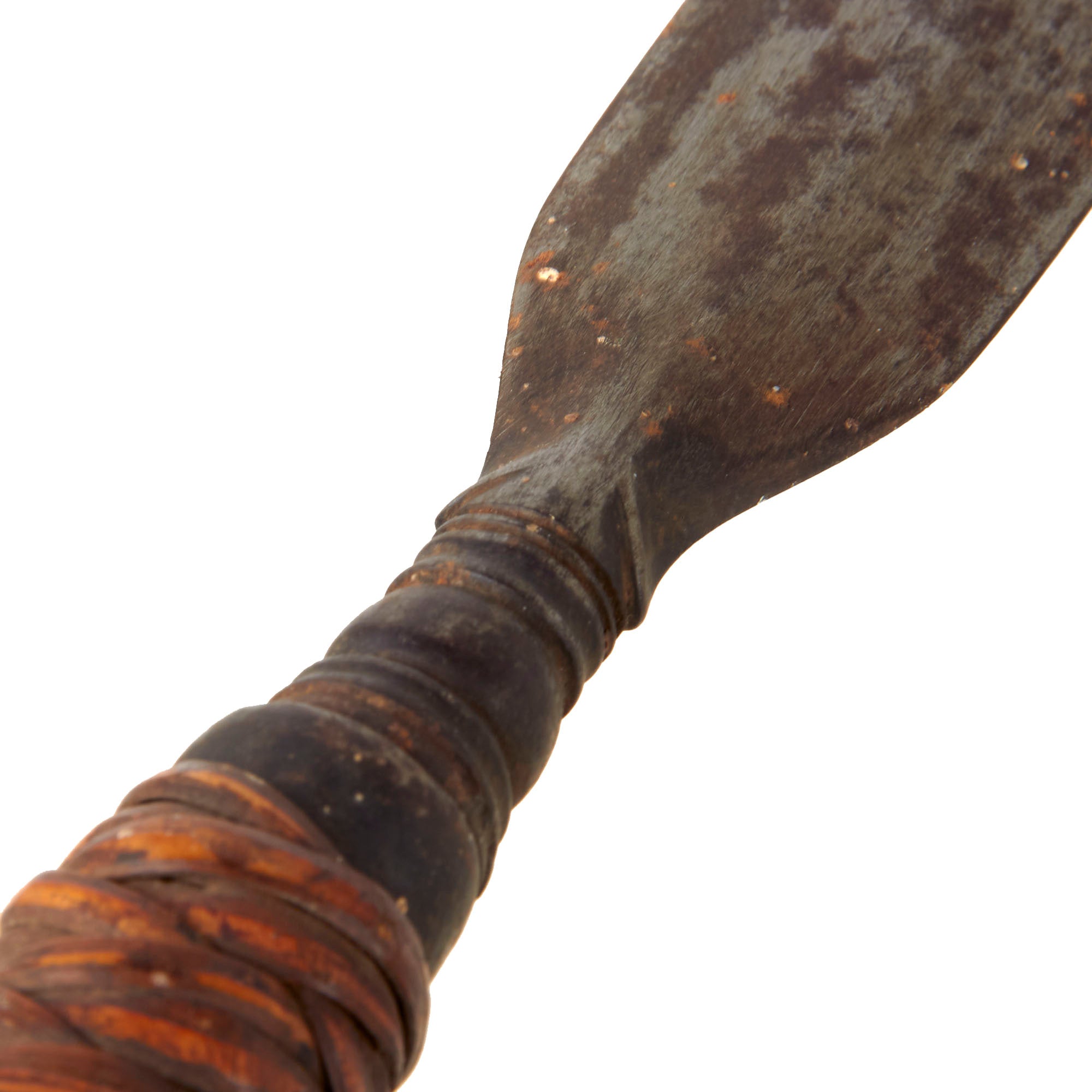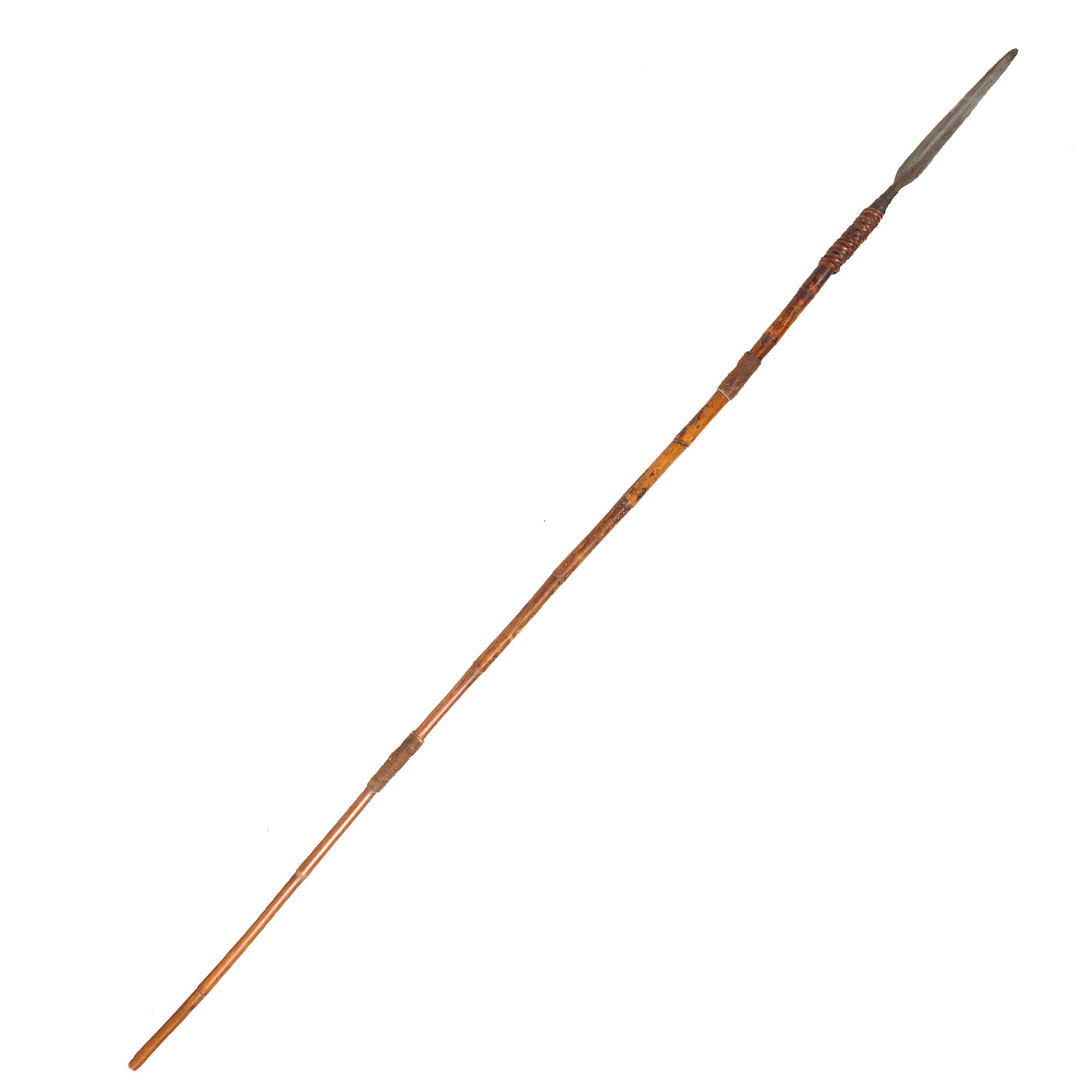 Sibat were in use throughout the Philippine islands, and they had many local variations, as with the Kris and other weapons used by the various groups. the Budjak is a bit heavier than other designs, and we have also been told that some were designed so that if the spear broke, the head end could be detached to use as a dagger, though we do not know if this example is so constructed. The spear is in lovely condition, most likely brought back to the U.S. by a USGI during WWII.