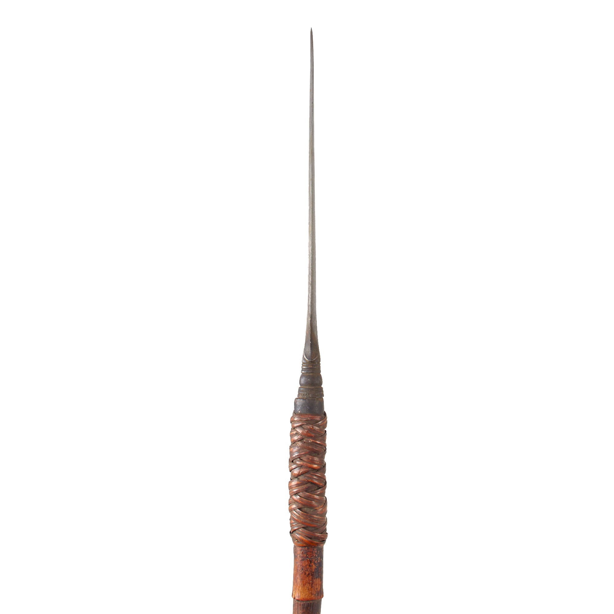 Original Item. Only One Available. Here we have a lovely variation of the Philippine Sibat Spear known as the Budjak, which was used by the Moro populations in the island area. It measures an impressive 67 inches in overall length, with a 9 3/8" long blade on the end of the iron head. It has a rattan cane shaft 56 1/2 long, which has woven wicker style plant material where the head meets the shaft. There are also two rough plant twine grips wrapped around the shaft as well.
