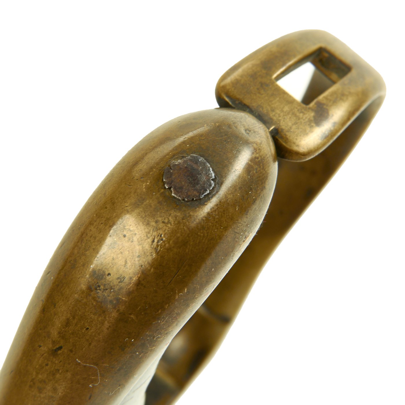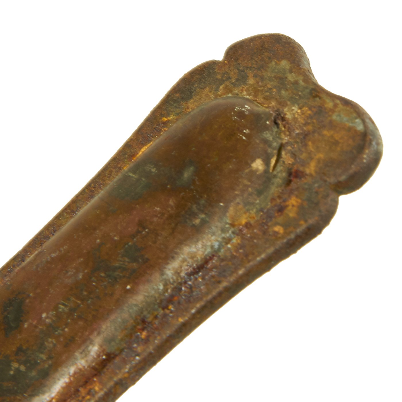 The hilt features a brass "P" guard with slot in the bottom for a sword knot or a wrist strap. The grip is made of dark hardwood, which is wire wrapped and in good shape. Overall the hilt is loose on the sword, and definitely has a bit of wobble.