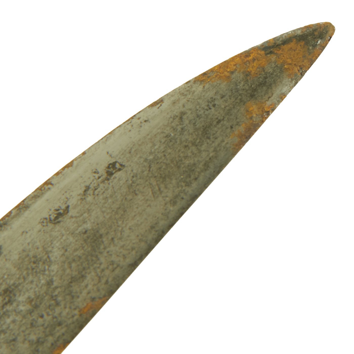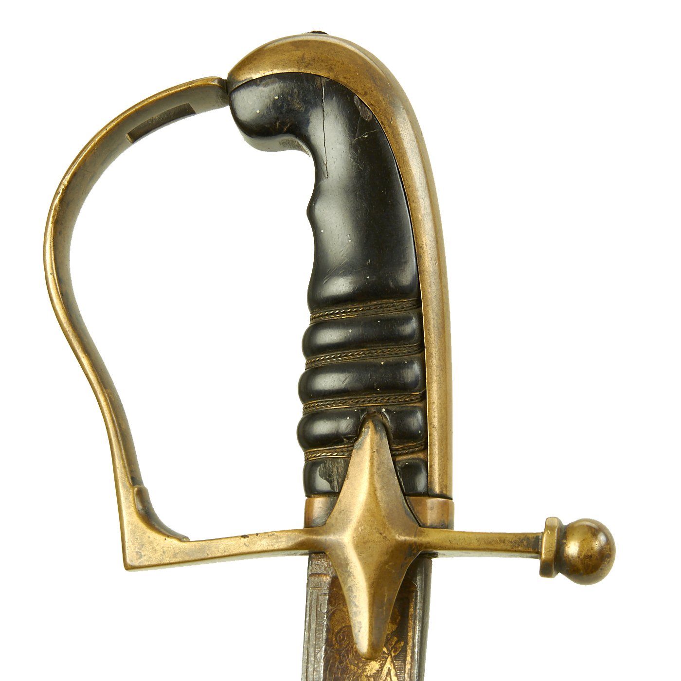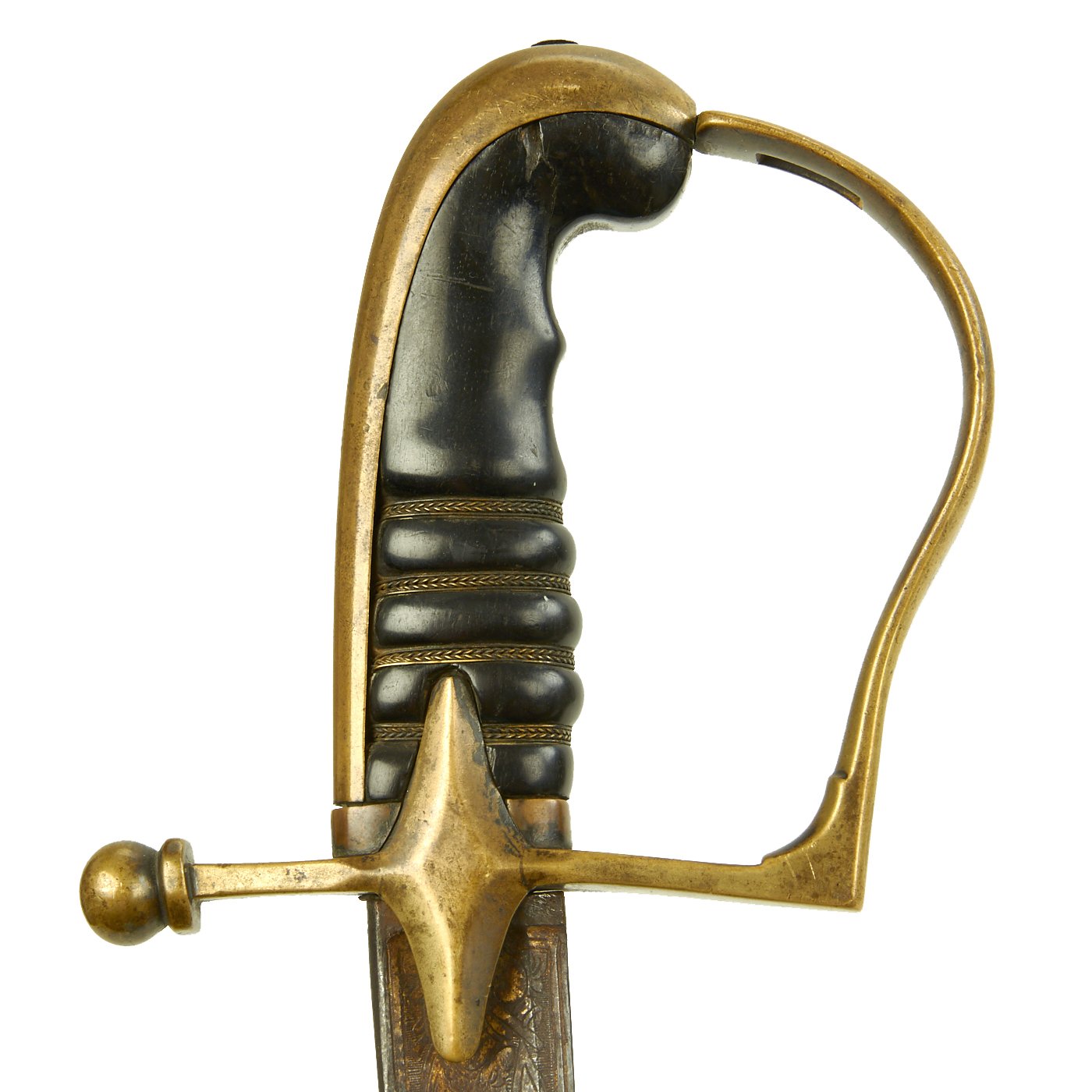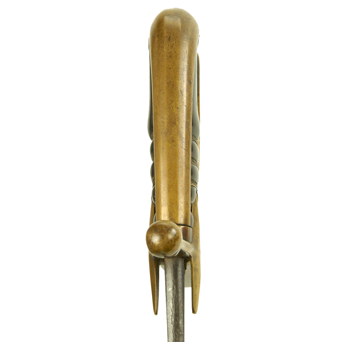 This example is quite attractive, featuring an engraved and gold highlighted blade, which is "fire blued" on the half closest to the hilt. This lovely iridescent type of bluing changes from blue to purple depending on the angle. The engraving has lovely designs in it, and the phrase Viva el Ré, or "Long Live the King" inside a panel. On the other side looks to be the "Eagle of Saint John" with a shield on its chest. There is also a decorative maker marking on the spine, but no identifiable maker marks are seen on the blade.