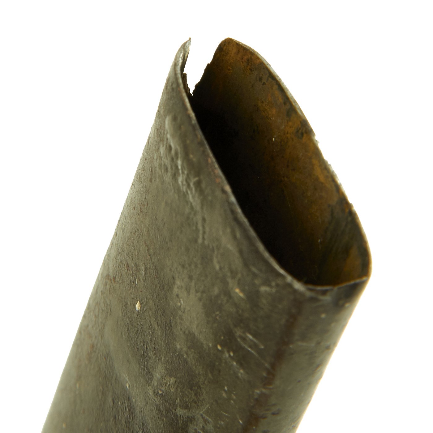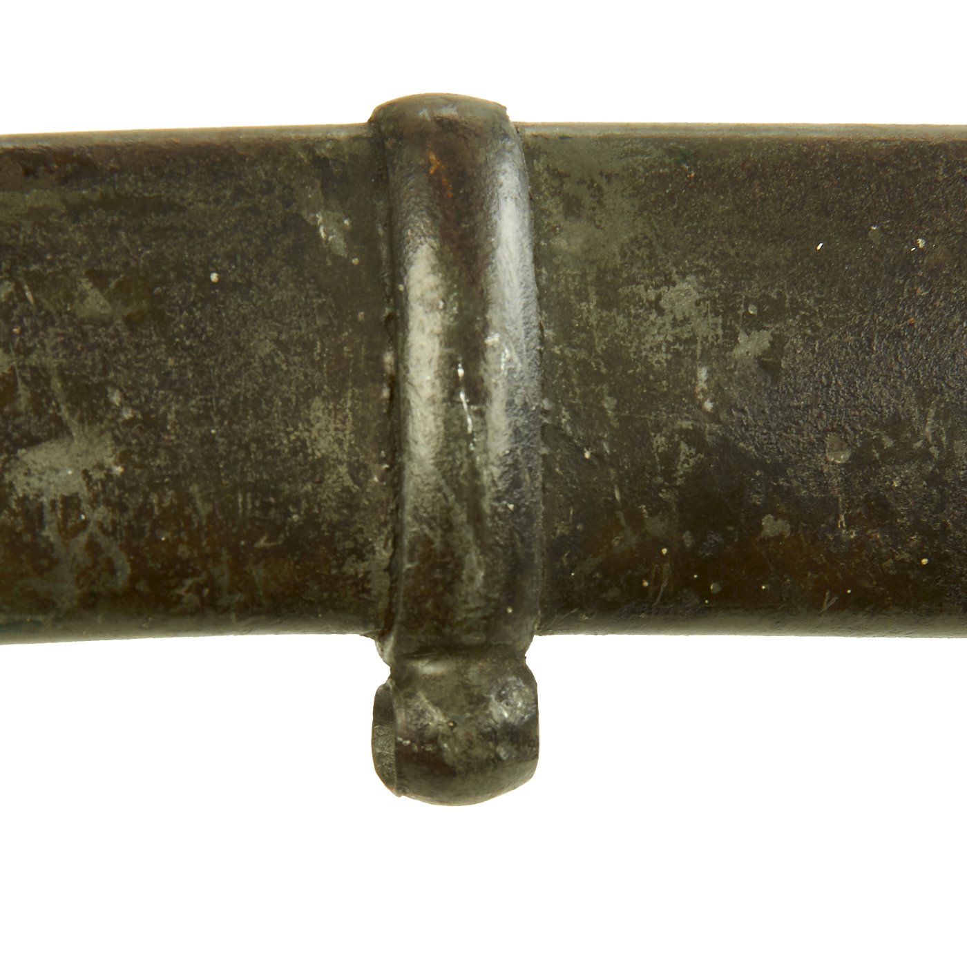 The sword comes with its steel scabbard, which has a long brass drag fitting. There are two hanger loops, but no hanger rings, so this could for a hanger with hooks. There are numerous dents on the scabbard, but it still fits the sword well.