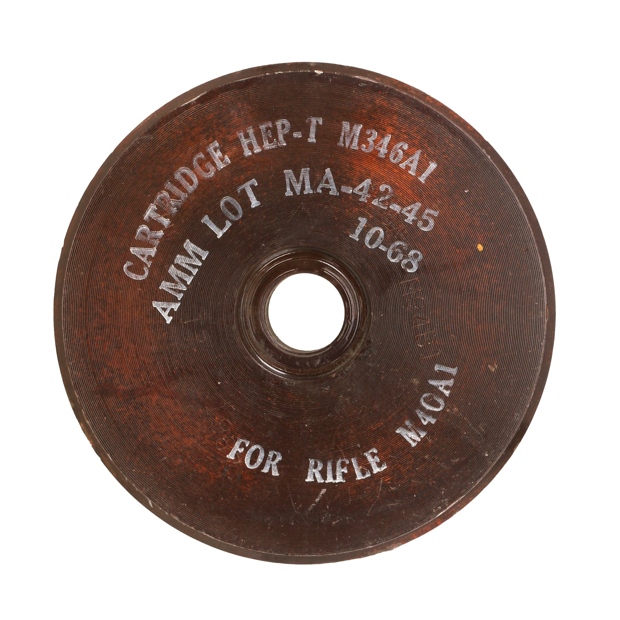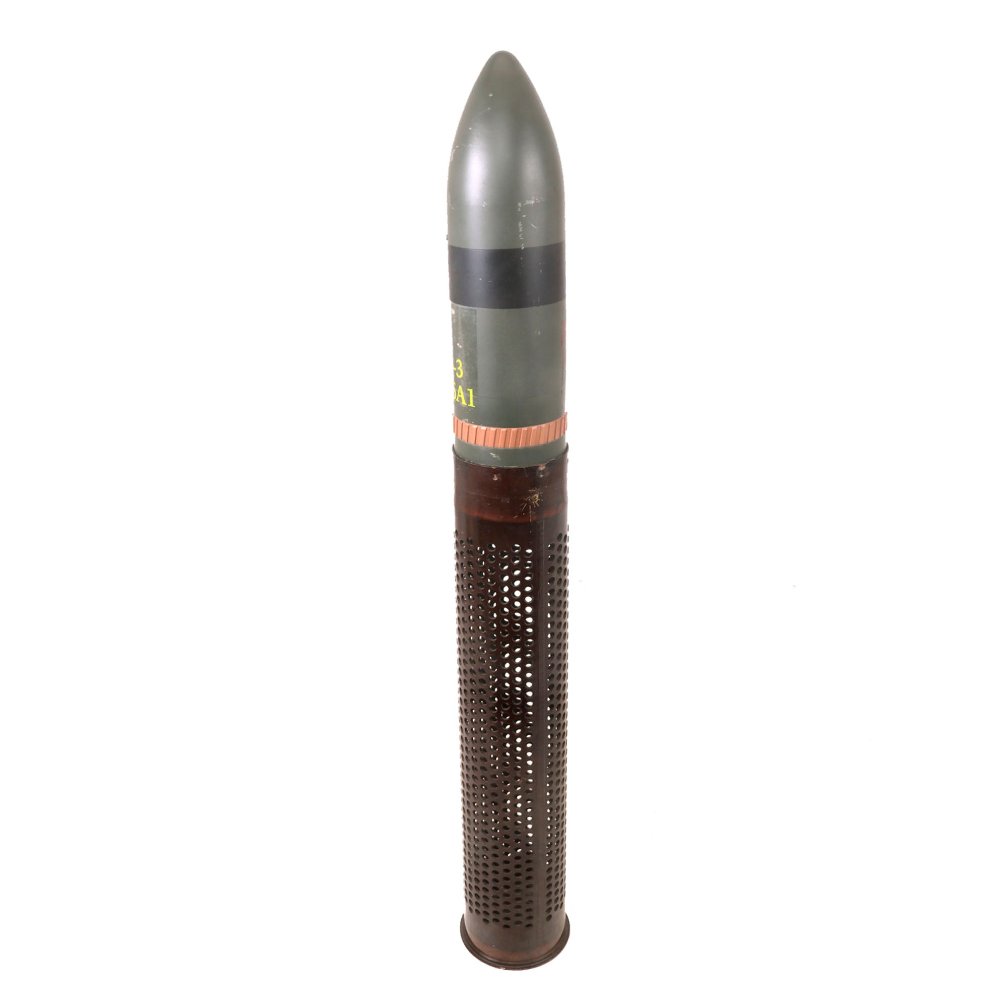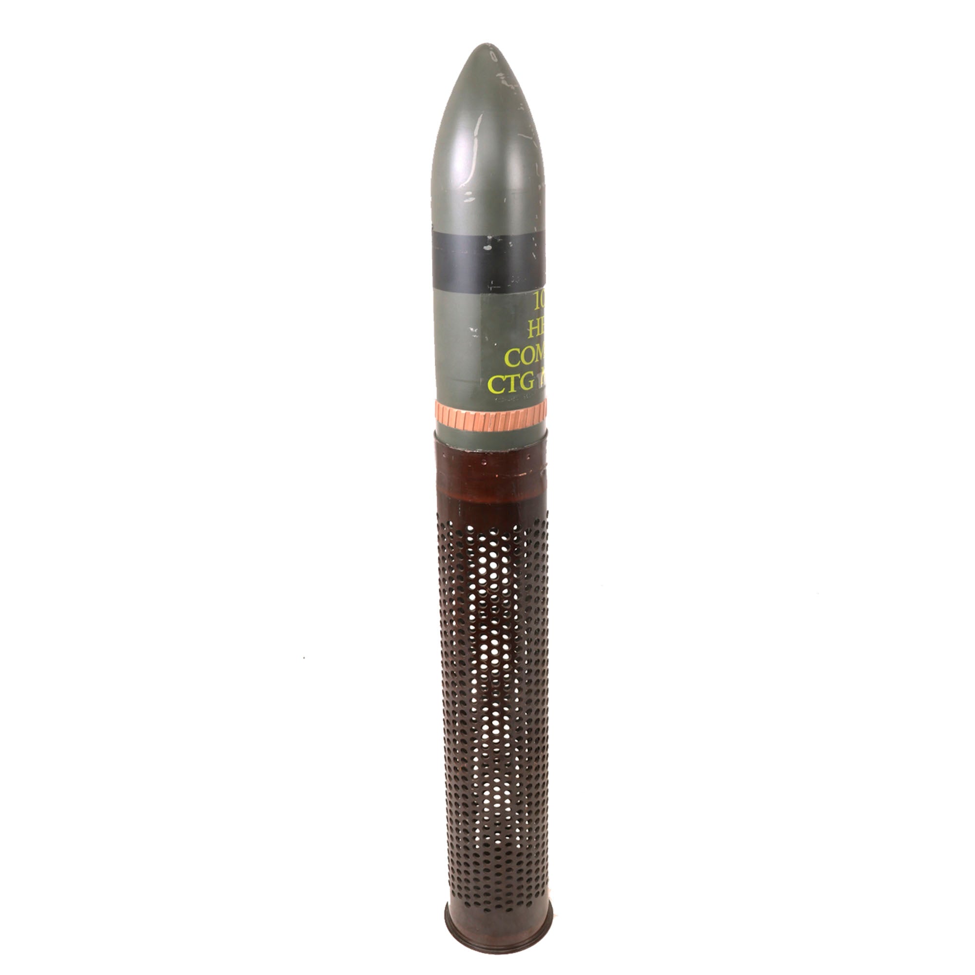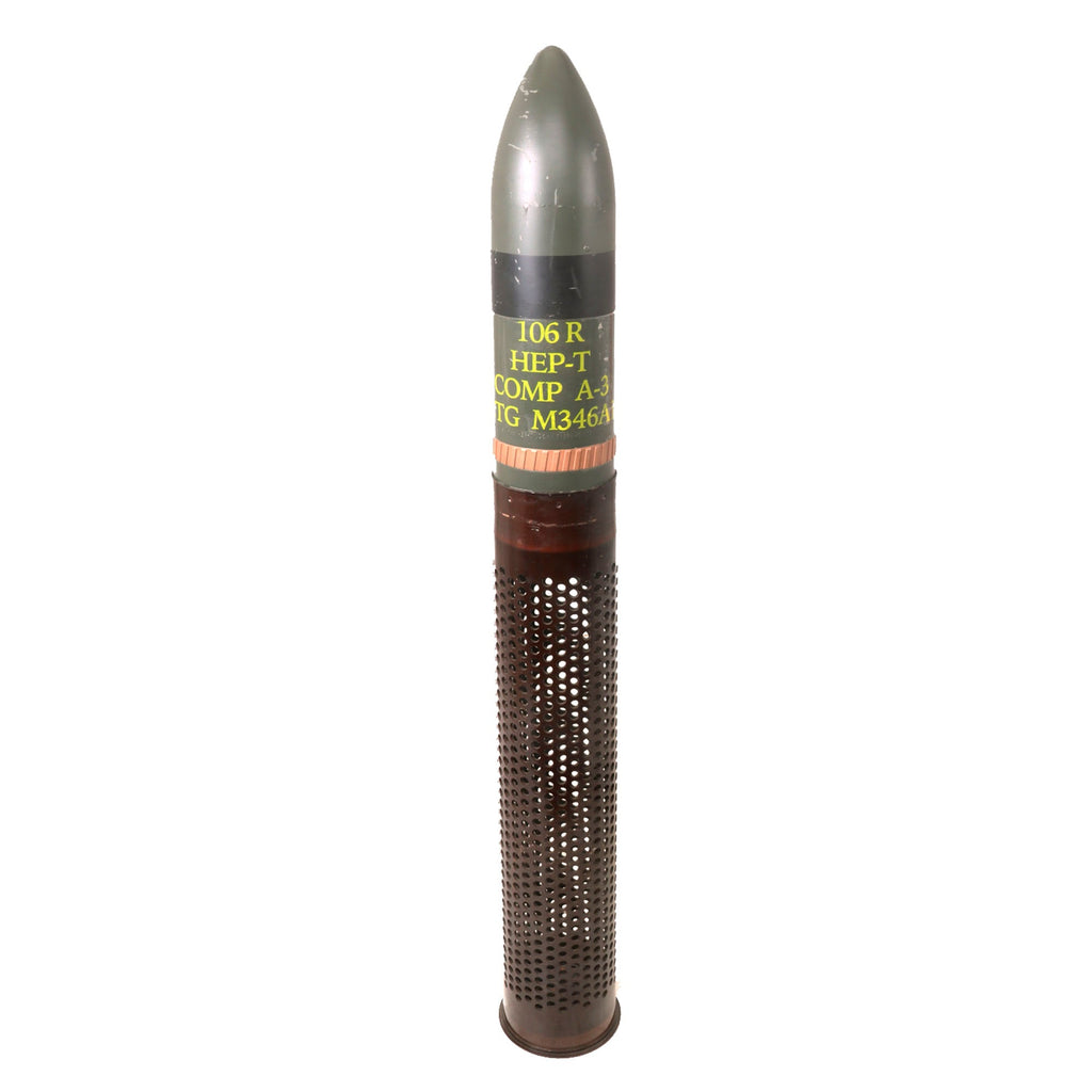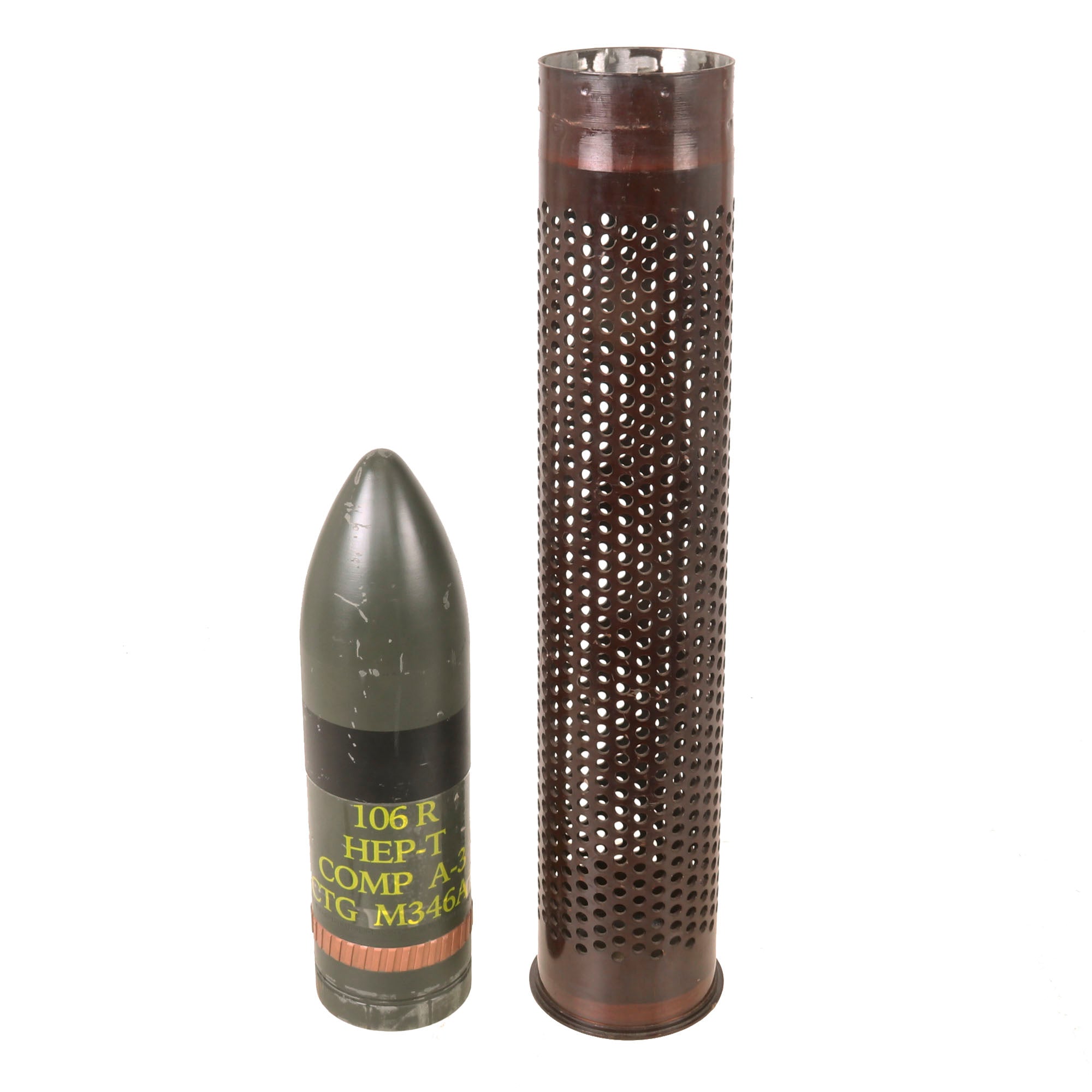 Original Item: Only One Available. This is a great inert HEP-T (High Explosive Plastic-Tracer) round for the U.S. 106mm M40 Recoilless Rifle, made in 1955 just after the Korean war. The round is however pretty much identical to those used during the war. It has been deactivated in accordance with guidelines provided by the ATF, and is NOT available for export. It consists of the original deactivated M346 series projectile, inserted into a T75 perforated shell casing, which still has a good amount of the metal wrapping inside, cut open to remove the propellant charge. The shell cannot currently be removed from the casing. There is a label on the projectile which was added later.
