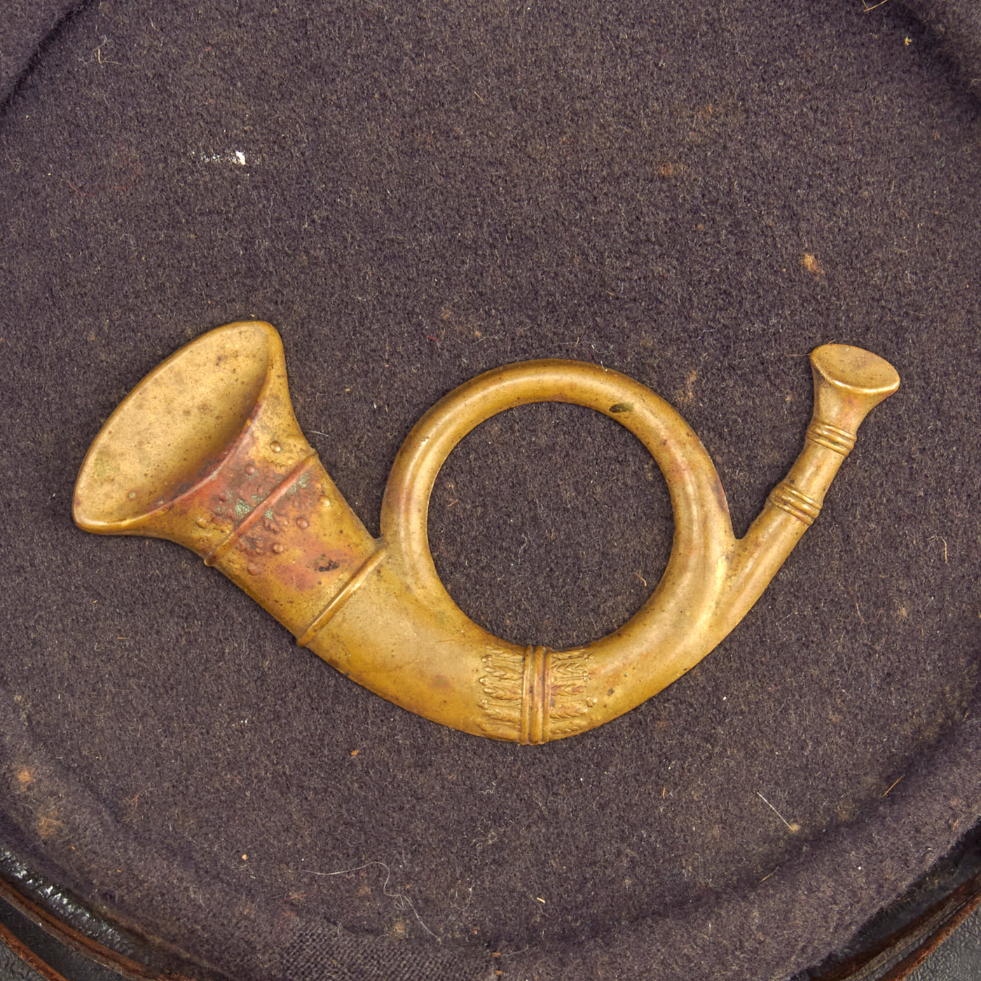 Of note is the Civil War manufactured Infantry Bugle Insignia, which undoubtedly has been placed on the kepi for a very long time. The original leather chinstrap is present, being secured on each side of the cap by a Civil War regulation Federal Eagle button.