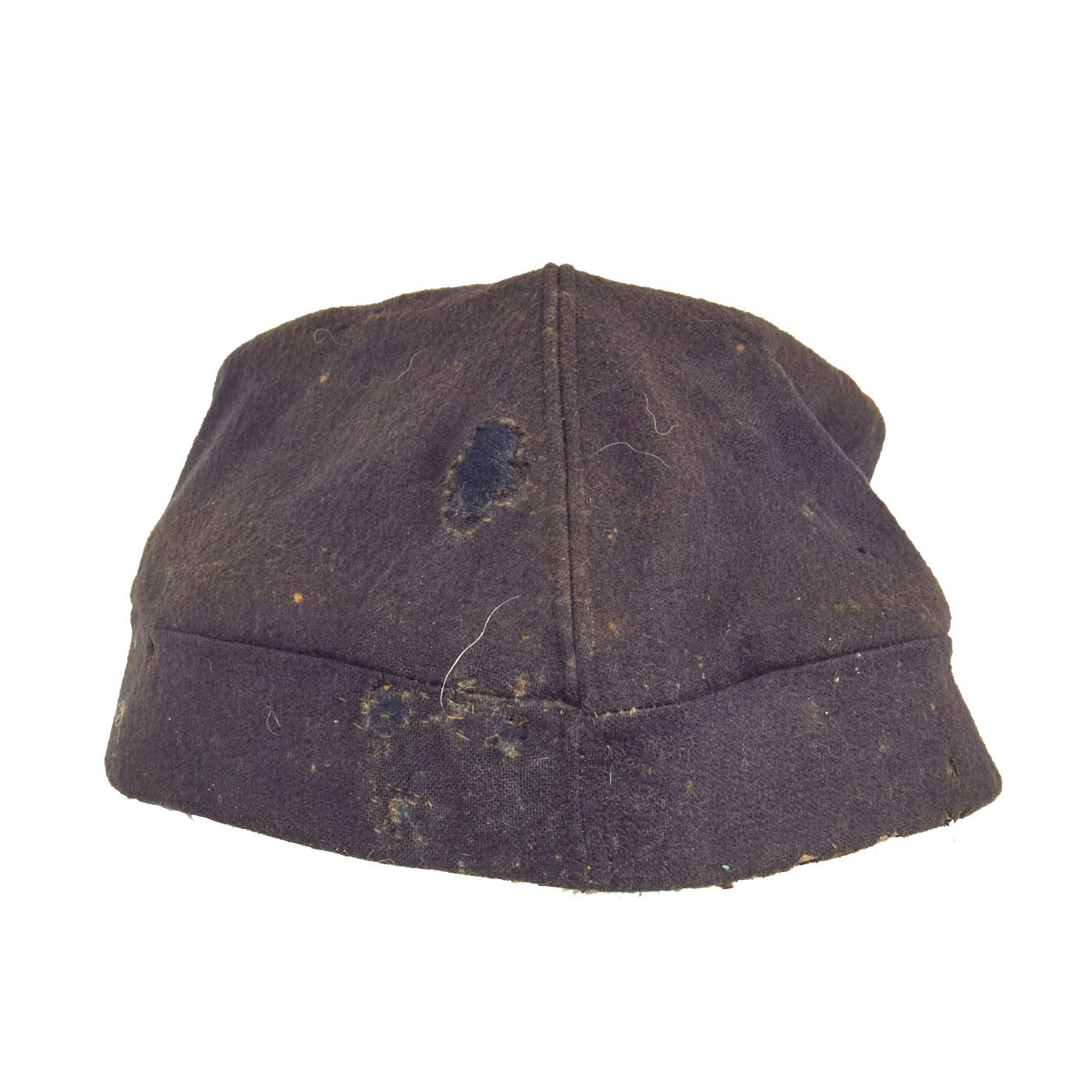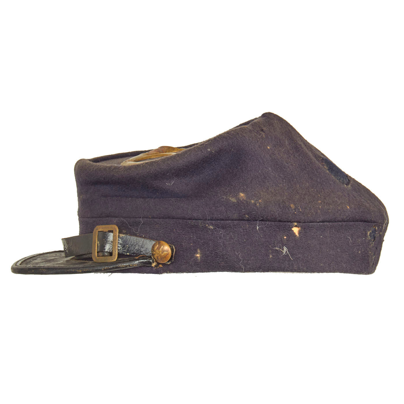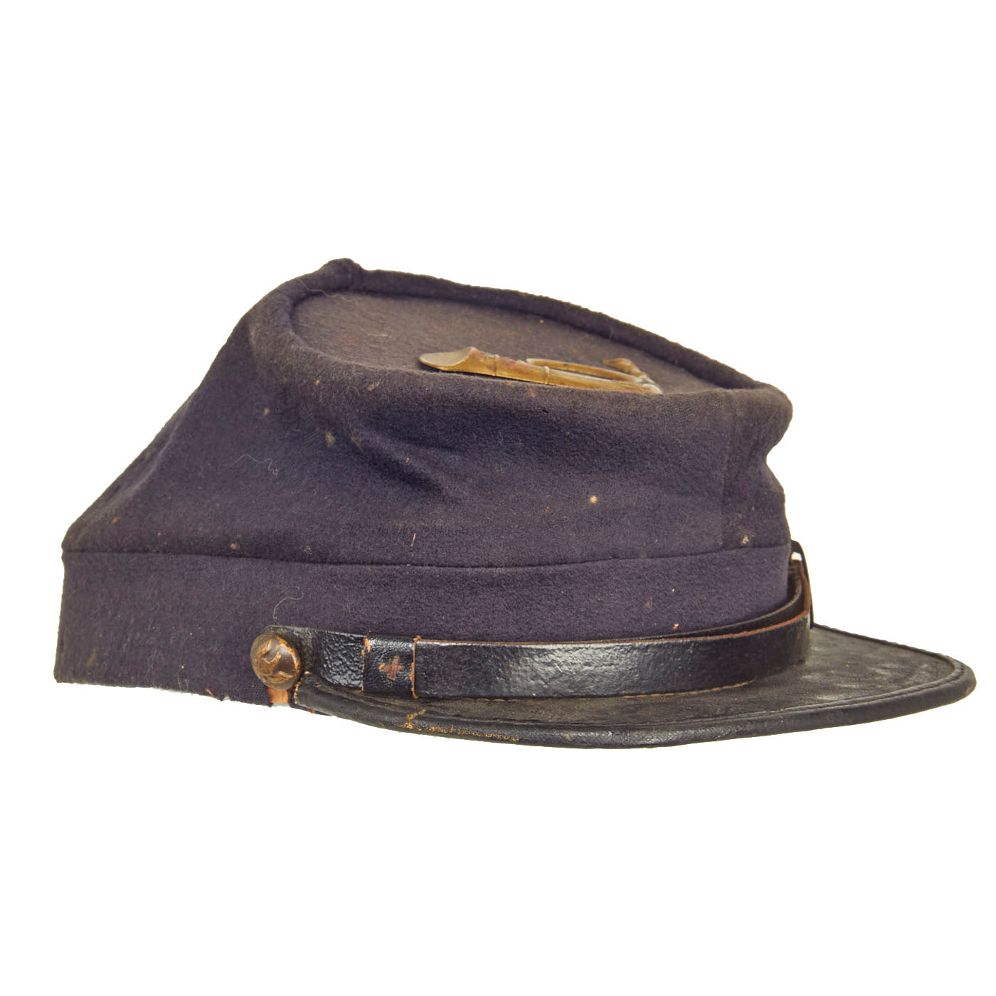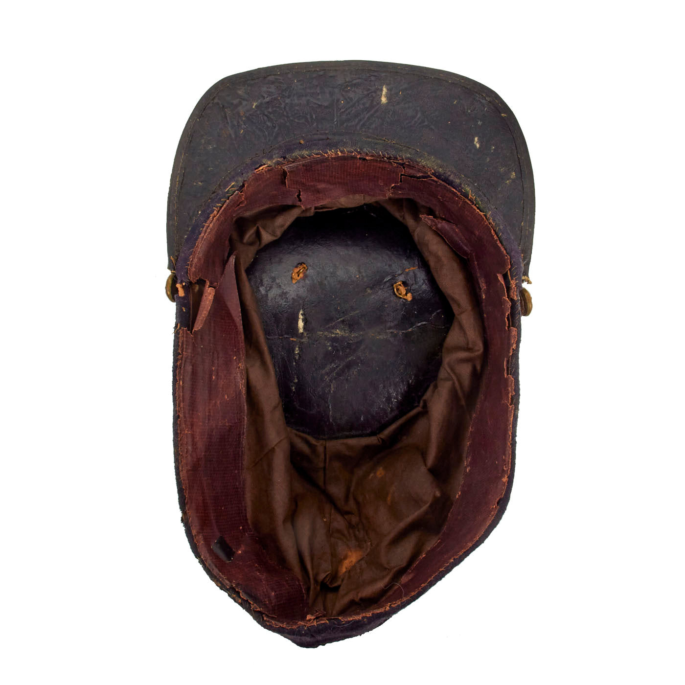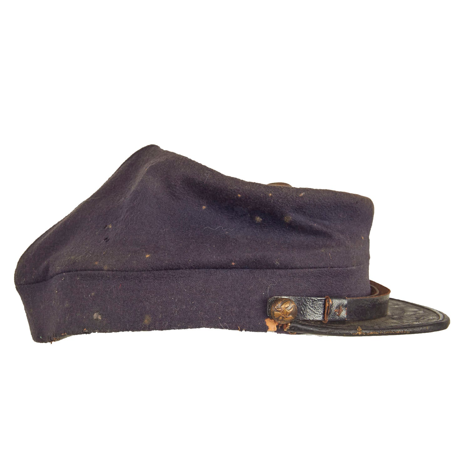 Original Item: Only One Available. This is an excellent example of an early Indian War Model 1872 U.S. Army Regulation Kepi worn by an enlisted Infantryman. This U.S. Army Model 1872 Kepi features fabric of dark blue wool broadcloth, with a painted leather visor, Moroccan leather sweatband, with Brown polished cotton lining in the crown. The crown stands 2 3/4" high at the front, 5" at the rear seam and the top is 5" in diameter. The body of the cap meets a band of wool seamed only at the back and stiffened with leather.